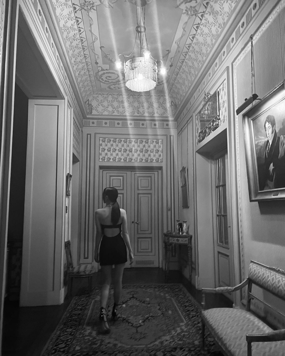 簡約的 Self Portrait 連衣裙沒有多餘設計,乾淨俐落的直線領口配以整齊直髮已充分展現優雅氣質。配飾選擇 Dior 金屬鏈條項鍊和閃石高跟鞋,為全黑造型畫上點睛一筆。