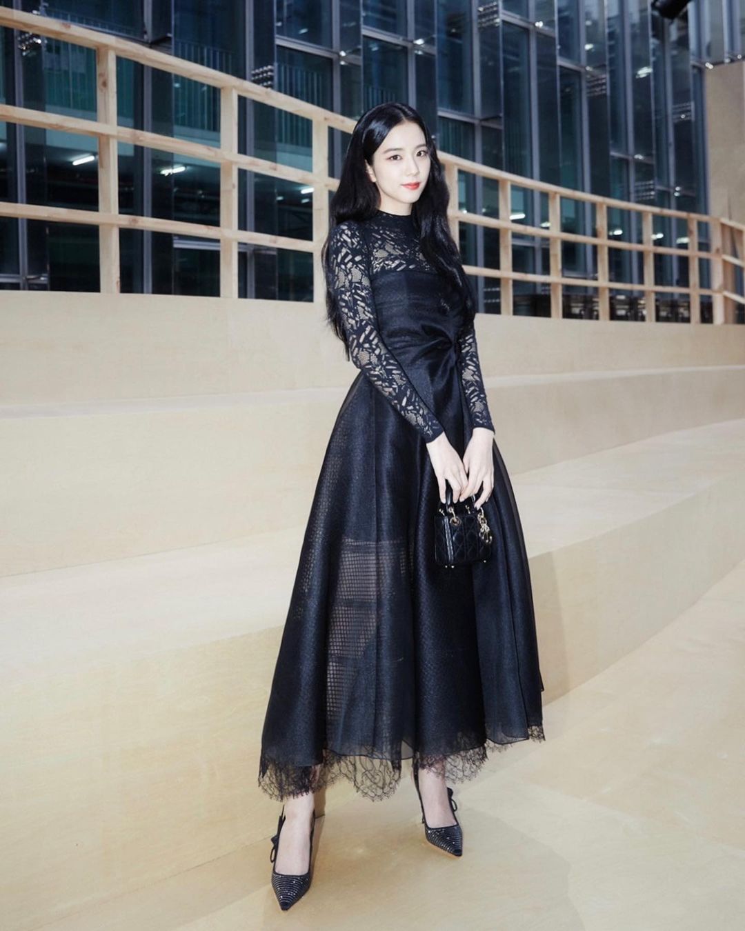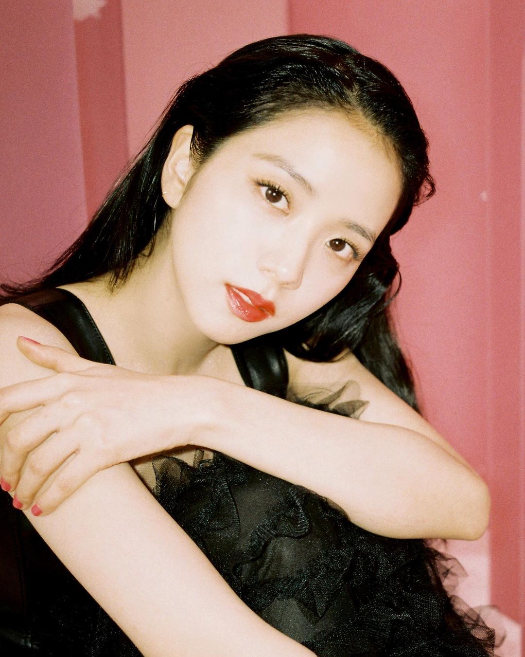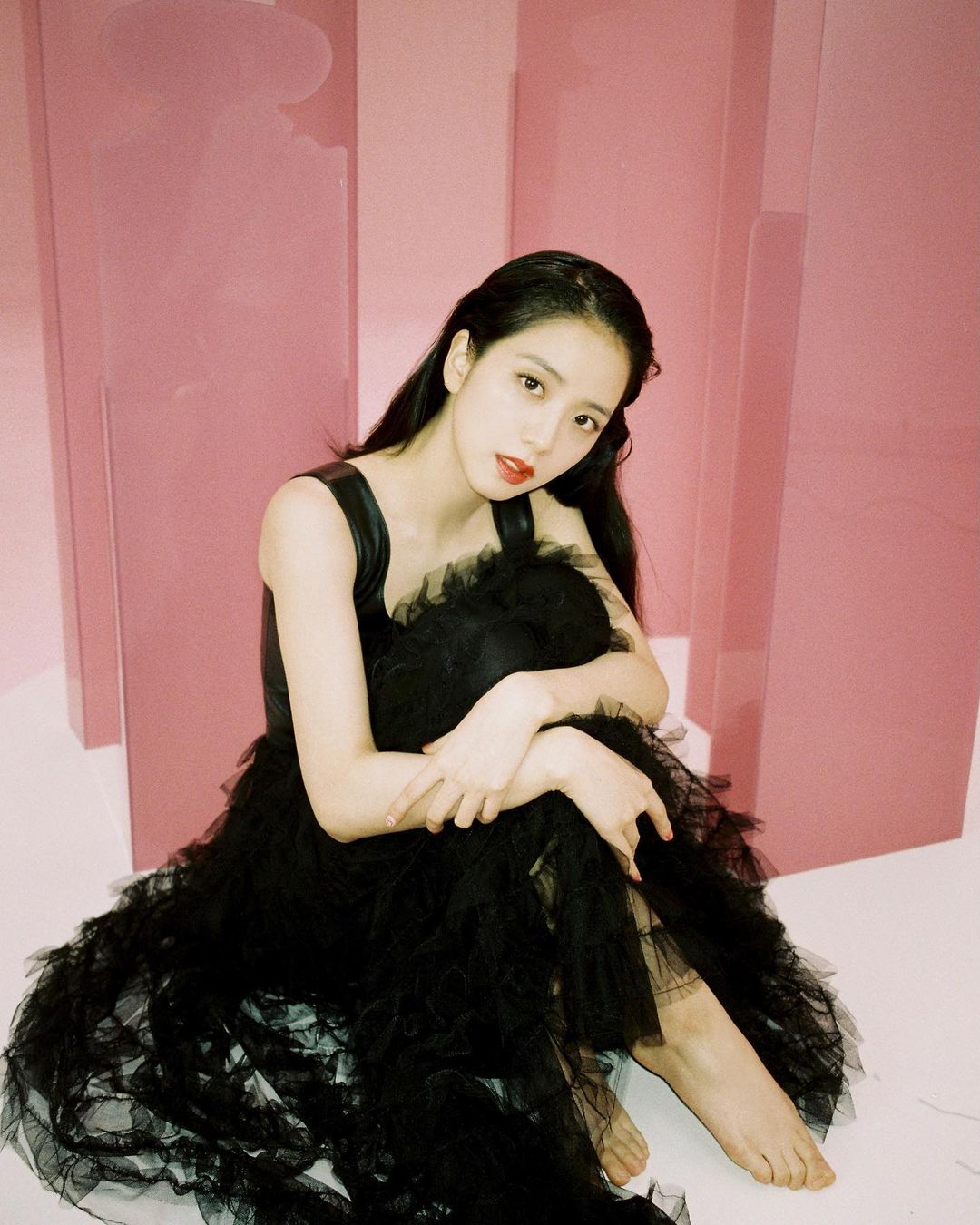 親民品牌 & other stories 在英國深受少女歡迎,這件珍珠 peter-pan 圓領的小黑裙完美展現了 Jisoo 可愛一面—— mary jane 厚底鞋、白色長筒襪、蝴蝶結頭帶,全符合了 「lolita 風格」的公式。