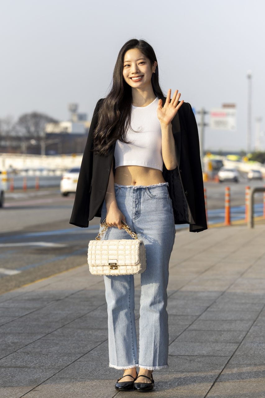 Twice Dahyun上月底出發前往Michael Kors在東京銀座的活動,作為品牌大使的她身穿羅紋針織短上衣展示了她健美的腹部,而闊腿直筒牛仔褲洋溢著輕鬆休閒的氣息,再配搭「WYTHE」小號荔枝紋皮手袋為造型增加層次感。