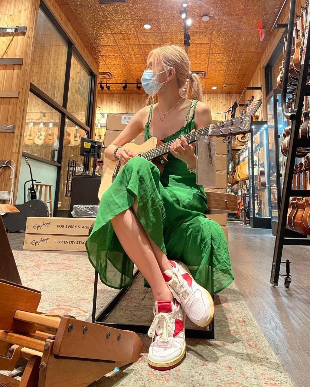Rosé 一舉一動備受矚目,她早前與 Jennie 在美國洛杉磯錄唱新歌引起關注,早前又在JTBC 綜藝節目《期盼已久的大海》 (바라던 바다) 中翻唱 John Mayer 的〈Slow Dancing in a Burning Room〉獲得好評。全能的 Rosé 日前上載自己穿上綠色背運身裙彈結他的清新造型,當中亮點莫過於是她的 Rhude 白色球鞋。Rhude 來自洛杉磯的服飾品牌,由Rhuigi Villasenor在2013年創立,一直以來以Grunge風格為設計靈感,獲得喜愛街頭風格的年輕人和不少 NBA 球星的支持; Rosé 穿上的 Rrhecess 系列球鞋以紅白色為重點,鞋身亦有懷舊設計,能夠配搭不同服裝。