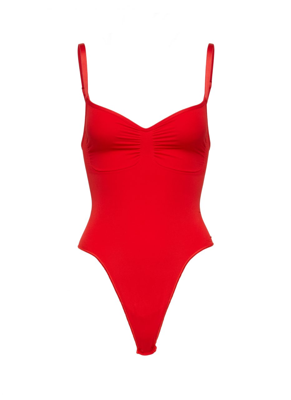 SEAMLESS SCULPT THONG BODYSUIT RED, SKIMS $700