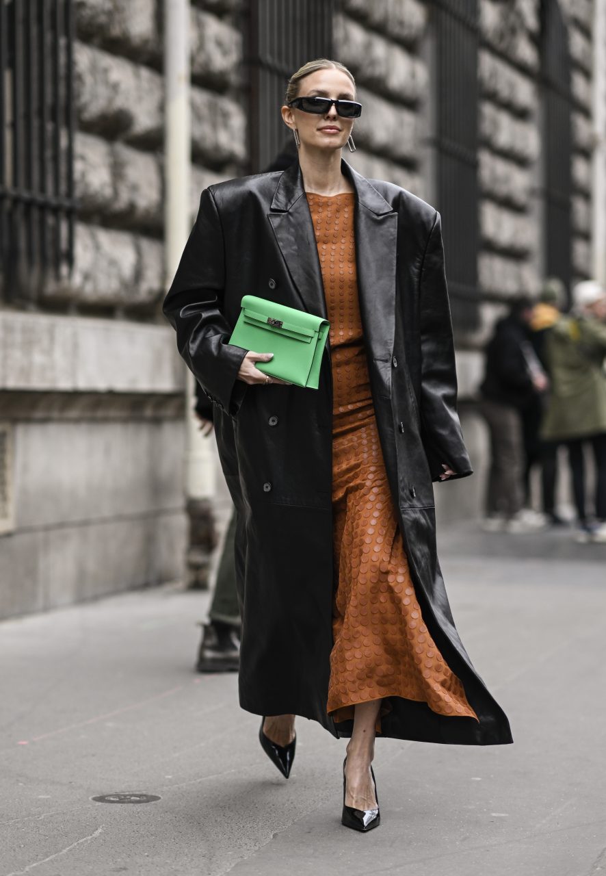 PARIS, FRANCE - MARCH 04: Leonie Hanne is seen wearing a black leather trench coat, orange Hermes dress, Hermes lime green bag, black Hermes shoes and black sunglasses outside the Hermes show during Paris Fashion Week F/W 2023 on March 04, 2023 in Paris, France. (Photo by Daniel Zuchnik/Getty Images)