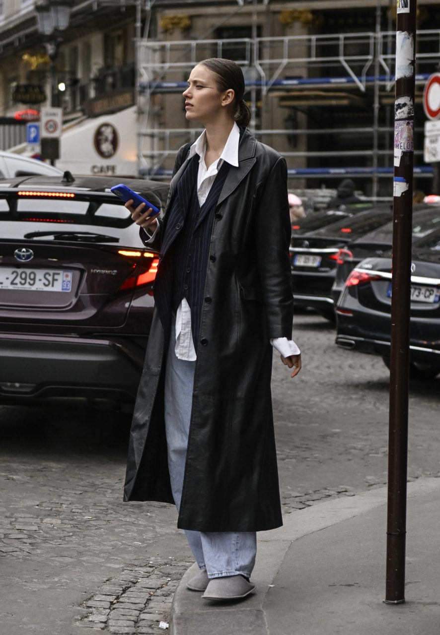PARIS, FRANCE - MARCH 05: A model is seen wearing a black trench coat, white shirt, black vest, light blue jeans and gray shoes outside the Balenciaga show during Paris Fashion Week F/W 2023 on March 05, 2023 in Paris, France. (Photo by Daniel Zuchnik/Getty Images)