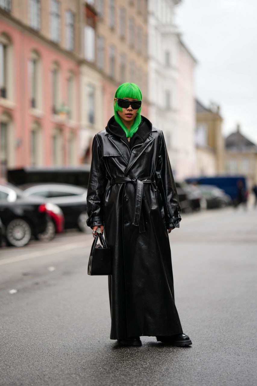 COPENHAGEN, DENMARK - AUGUST 09: Alyy Space wears black sunglasses, a black hoodie sweater, a black shiny leather belted long trench coat, a black shiny leather handbag, black shiny leather ankle boots , outside Henrik Vibskov, during the Copenhagen Fashion Week Spring/Summer 2024 on August 09, 2023 in Copenhagen, Denmark. (Photo by Edward Berthelot/Getty Images)