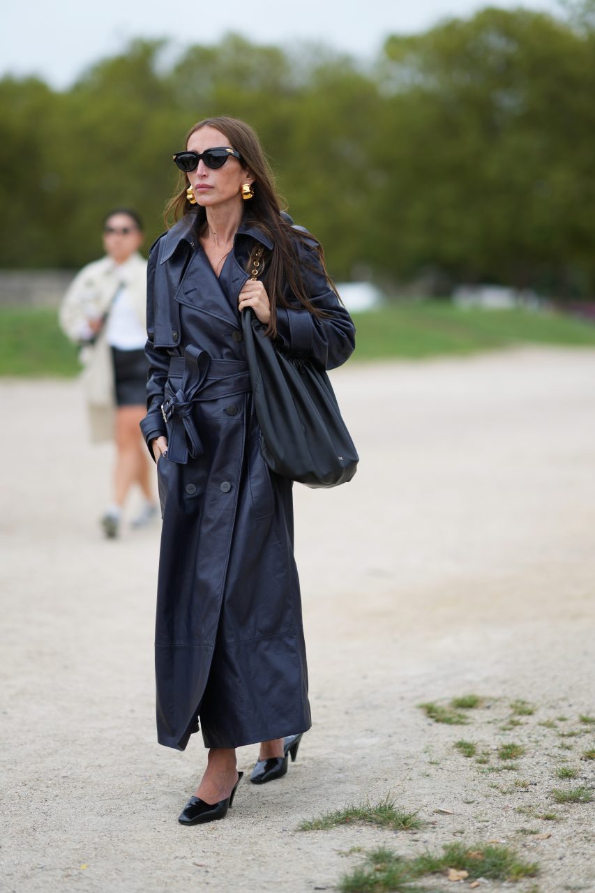 PARIS, FRANCE - SEPTEMBER 29: Chloe Harrouche wears sunglasses, golden earrings, a blue long leather trench coat, a leather gathered bag, pointed shoes, outside Loewe, during the Womenswear Spring/Summer 2024 as part of Paris Fashion Week on September 29, 2023 in Paris, France. (Photo by Edward Berthelot/Getty Images)