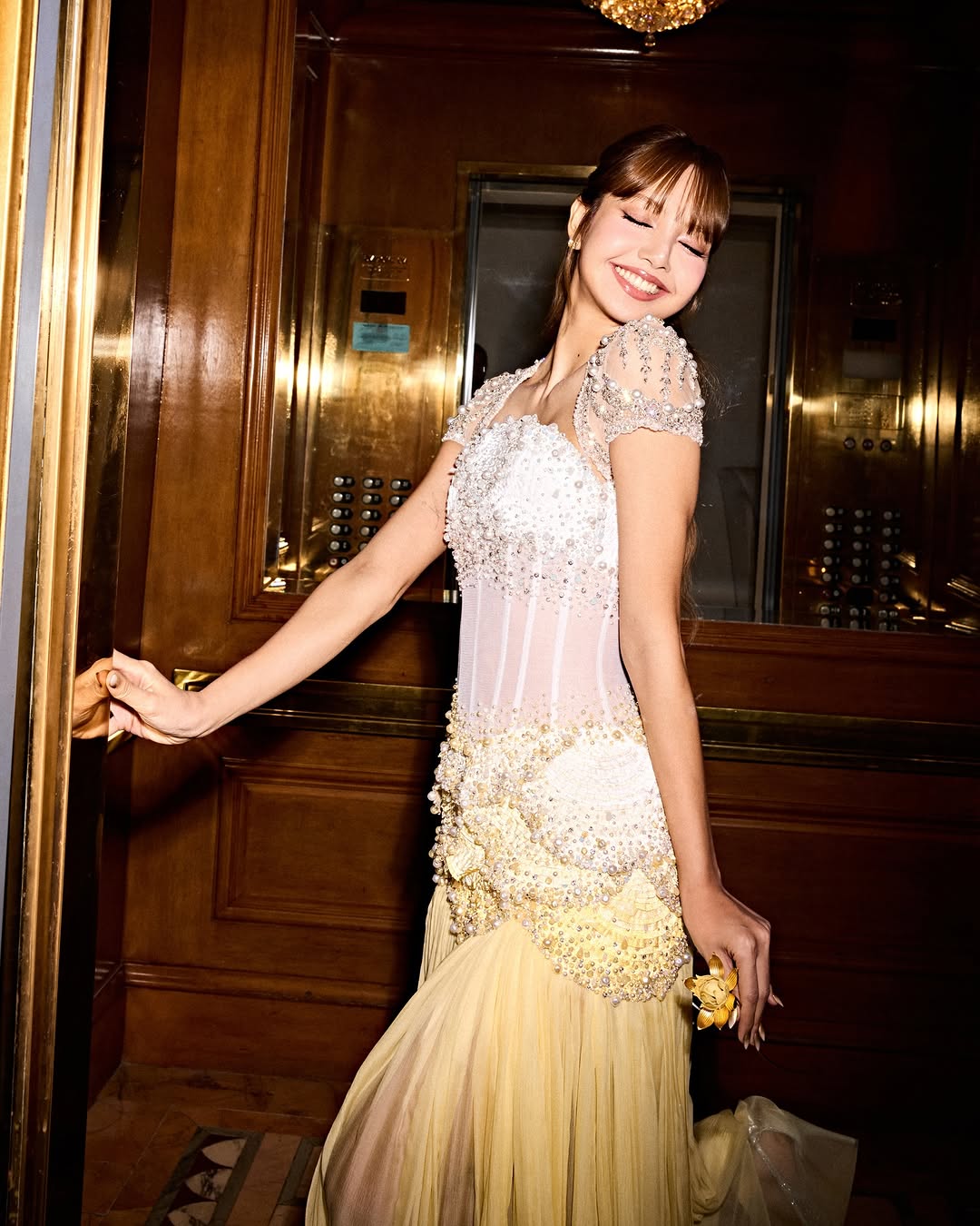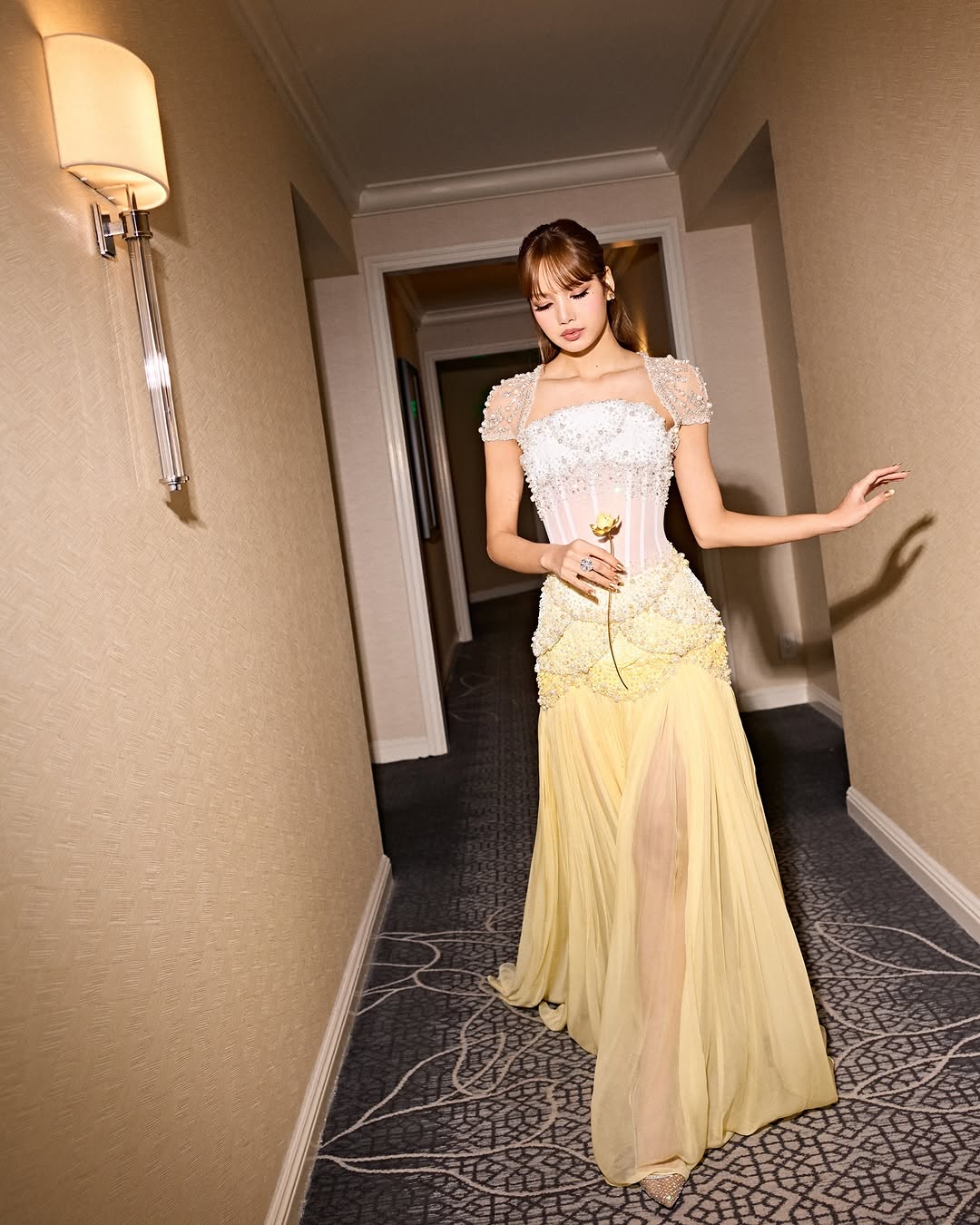 洛杉磯首映禮紅地毯上,Lisa化身為一朵純潔的白蓮。她身穿Miss Sohee訂製的黃白色透視魚骨胸衣禮服,精緻的黃色裙擺如花瓣般層疊,手持來自泰國品牌SARRAN金蓮花,並配戴BVLGARI FIOREVER系列鑽石戒指,其美甲設計也巧妙呼應了整體風格,細節之處盡顯溫柔氣質!