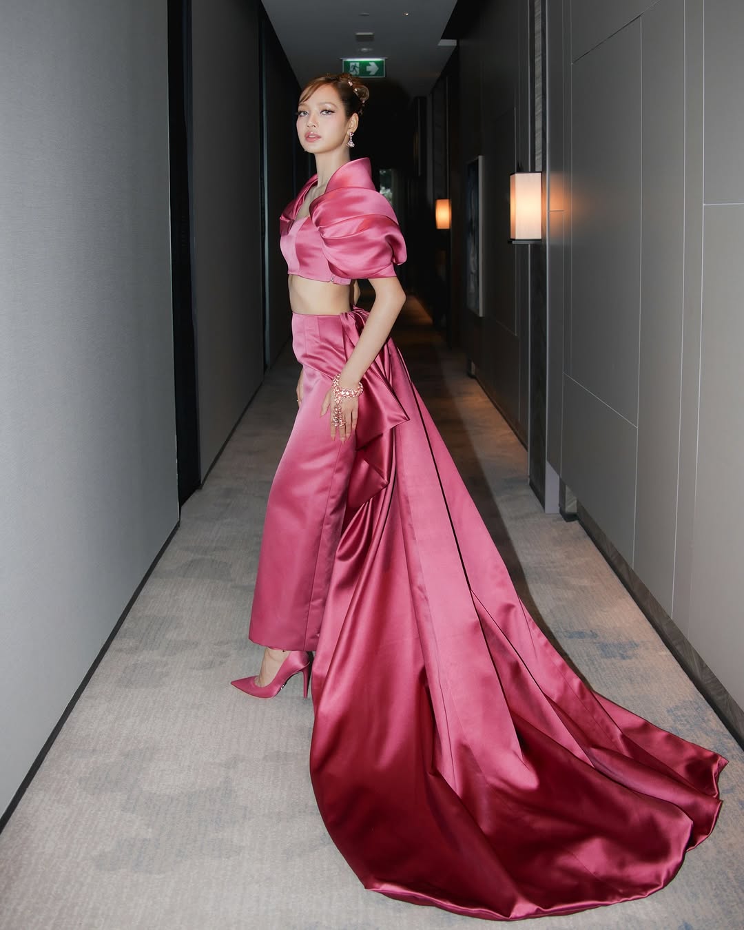 回到家鄉泰國,Lisa選擇了一套Louis Vuitton兩件式粉色訂製套裝。露肩上衣搭配鉛筆裙,裙擺的分體設計更添氣勢,並飾以BVLGARI手鍊、耳環,詮釋精緻華麗風格。粉色在泰國文化中代表着幸運,也帶有着皇室氣息,Lisa的這身紅地毯造型不僅將個人的優勢最大化,更蘊含着對家鄉文化的深深敬意。
