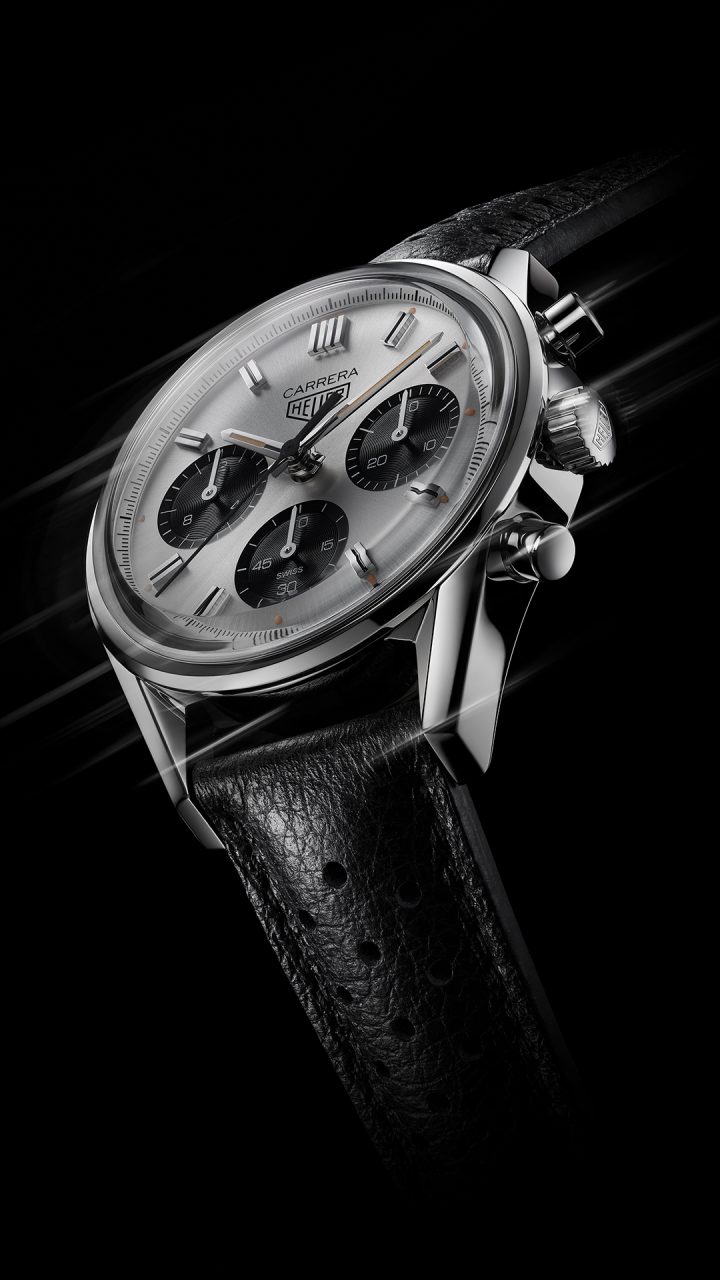 全新設計款式靈感來自 Carrera 系列中最具收藏價值的一 款腕錶,即 1960 年代末期的 2447 SN 型號。 2447 SN 錶款配有銀色錶面和黑色小錶盤(熊貓錶面),如其命名, SN 結合了銀色的英文:Silver,和黑色的法文:Noir 兩詞的字首。高對比度的錶面設計、簡單條紋的時標、時分針中心處的條紋設計,12 點鐘位置的雙時標,讓計時腕錶在歸零時清晰明瞭,以及黑色計時盤上採用易見的白色指針和數字,種種細節設計都是為了提升易讀性。最為欣賞忠實復刻 Carrera 2447 SN 錶款,這紀念版採用復古配色,包括中央指針和時標的黑色條紋、12 點鐘位置的雙時標,及高對比度白色標記的黑色計時盤。放射狀太陽紋錶面, 12 點鐘位置飾有復古的 Heuer 標誌, 以及 Carrera 系列字樣,具有收藏價值。