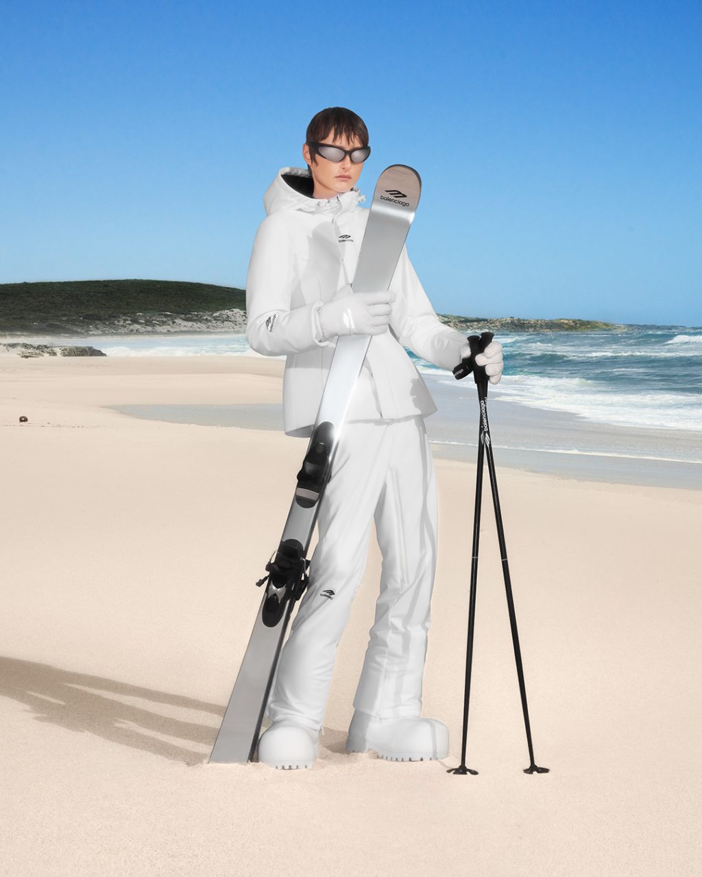 Balenciaga 發表的首個滑雪服系列兼具技術性與時尚前衛性。系列的成衣、裝備、用具和配件都體現了品牌的標誌性風格(全黑色、紅色和未來主義輪廓)。 Parker大衣和背帶褲採用薄膜粘合防撕裂材料製成,並設計了雪裙,確保你在山間保持溫暖和自在——同時成為最時尚的滑雪者。