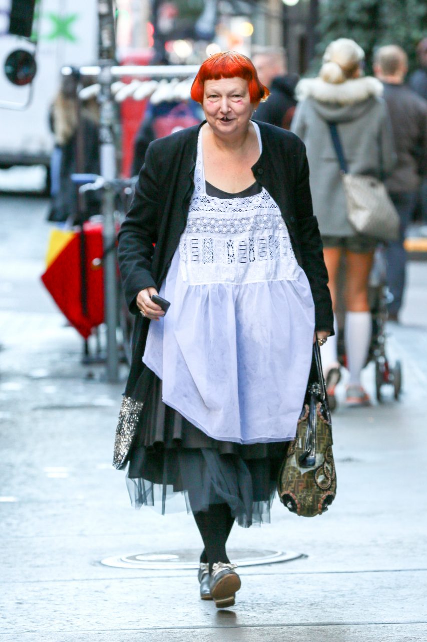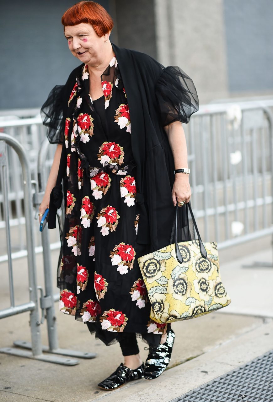 對於Lynn Yaeger的標誌個人風格,單憑頻繁出現在時裝展front row以及街頭攝影師捕捉的畫面已經給予了我們強烈的視覺印象—復古且頑皮。弓形的山峰唇妝、兩點面頰上的粉色胭脂,還有接近純色的橘紅色Bob短髮是她一年365天也不會歇息或改變的專一造型。如洋娃娃般的蓬蓬裙、Repetto平底鞋、皮草、頭巾還有印有她畫像的Goyard手袋都是她的摯愛。光看第一個人的外表竟然體會到一點點她的內在幽默性格,這種表達是令人佩服的。