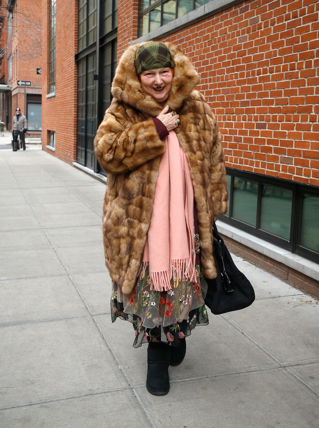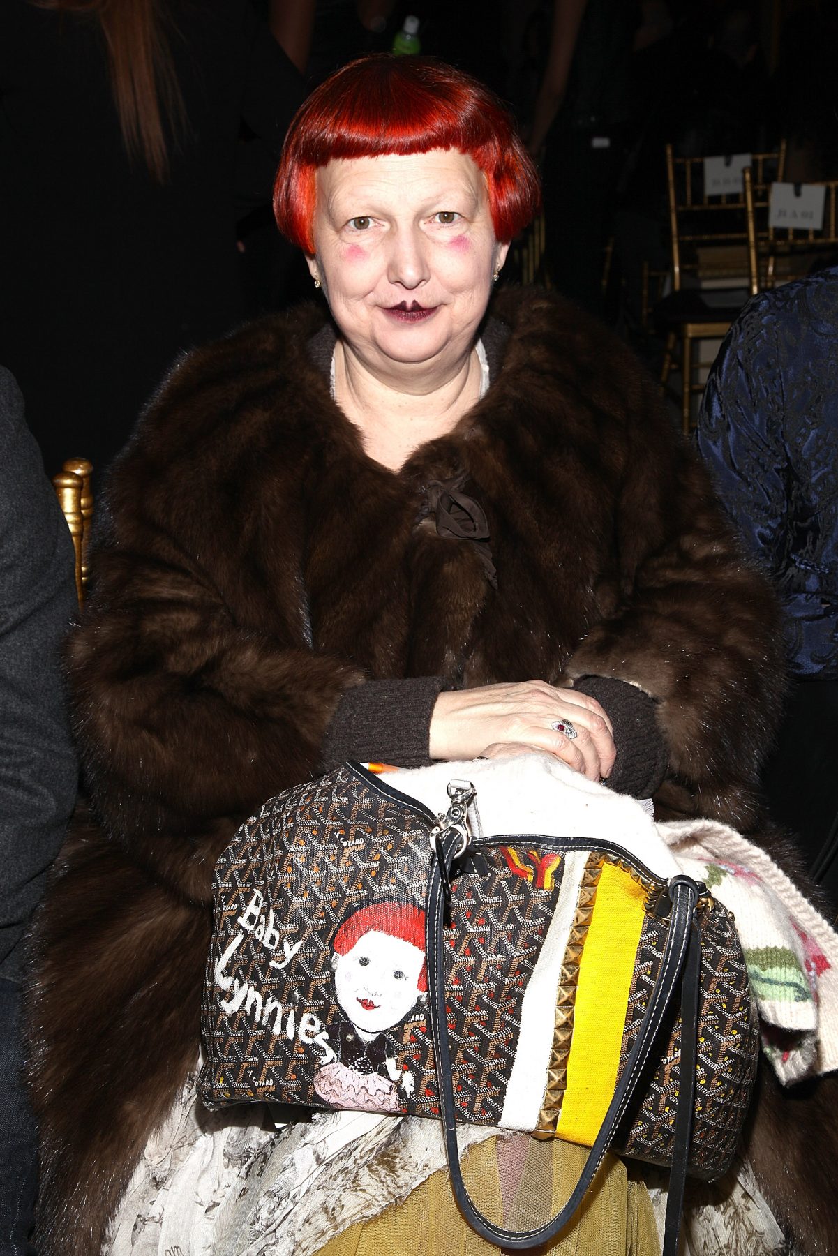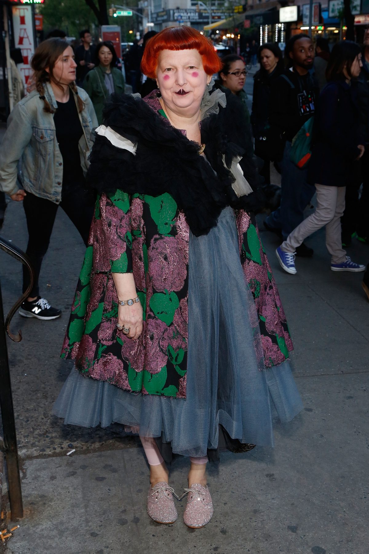 對於Lynn Yaeger的標誌個人風格,單憑頻繁出現在時裝展front row以及街頭攝影師捕捉的畫面已經給予了我們強烈的視覺印象—復古且頑皮。弓形的山峰唇妝、兩點面頰上的粉色胭脂,還有接近純色的橘紅色Bob短髮是她一年365天也不會歇息或改變的專一造型。如洋娃娃般的蓬蓬裙、Repetto平底鞋、皮草、頭巾還有印有她畫像的Goyard手袋都是她的摯愛。光看第一個人的外表竟然體會到一點點她的內在幽默性格,這種表達是令人佩服的。