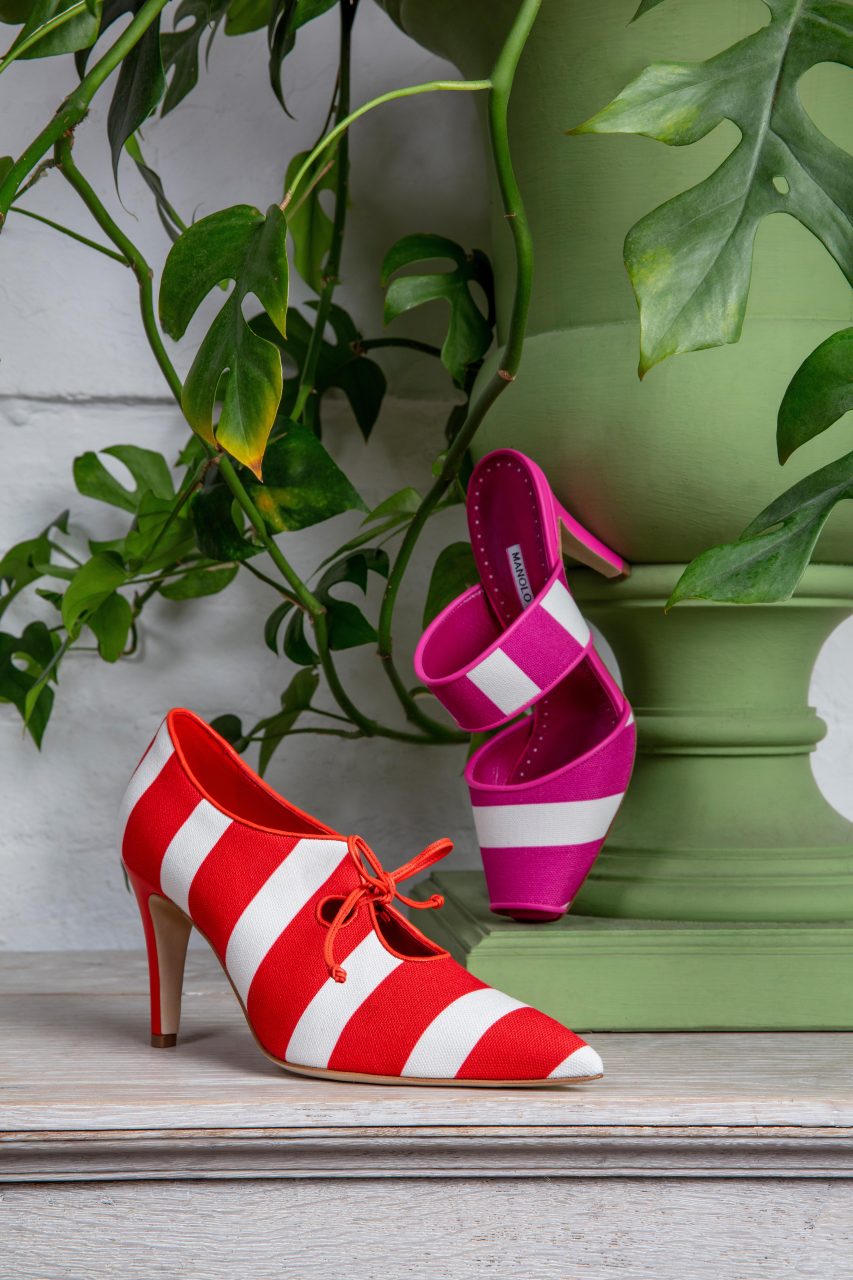 海洋中的瑰寶亦是Manolo Blahnik向來的摯愛,珍貴的珊瑚以飾珠、刺繡和裝飾細節等方式呈現;此外,今季同樣以蔚藍海岸的壯麗風景作為另一個重要靈感,品牌以一系列獨特設計以歌頌品牌的地中海文化背景。比如品牌取材自社會攝影師Jacques Henri Lartigue的作品、藝術家Pierre Bonnard充滿表現力的風景畫作,以及畢卡索在地中海生活時創作的作品,各種奪目的條紋、尖角細節、裝飾藝術風格的稜角裝飾、源自立體主義圖案的鋸齒邊緣和稜角分明的通花細節,都是品牌通過觀察自然和藝術作品後的有機結果。