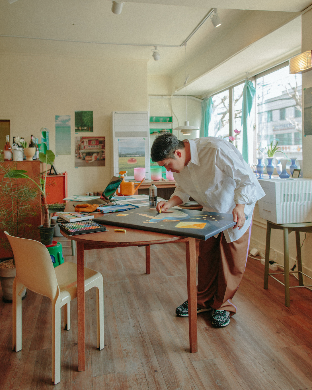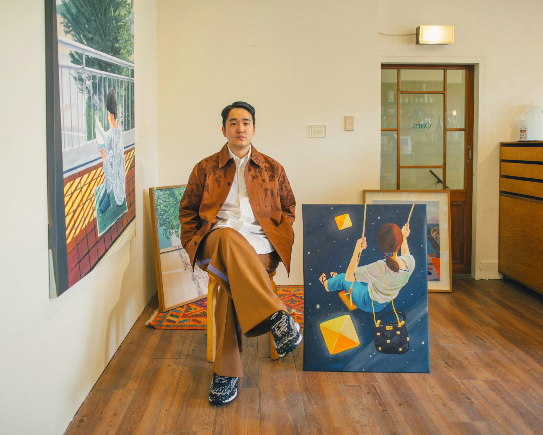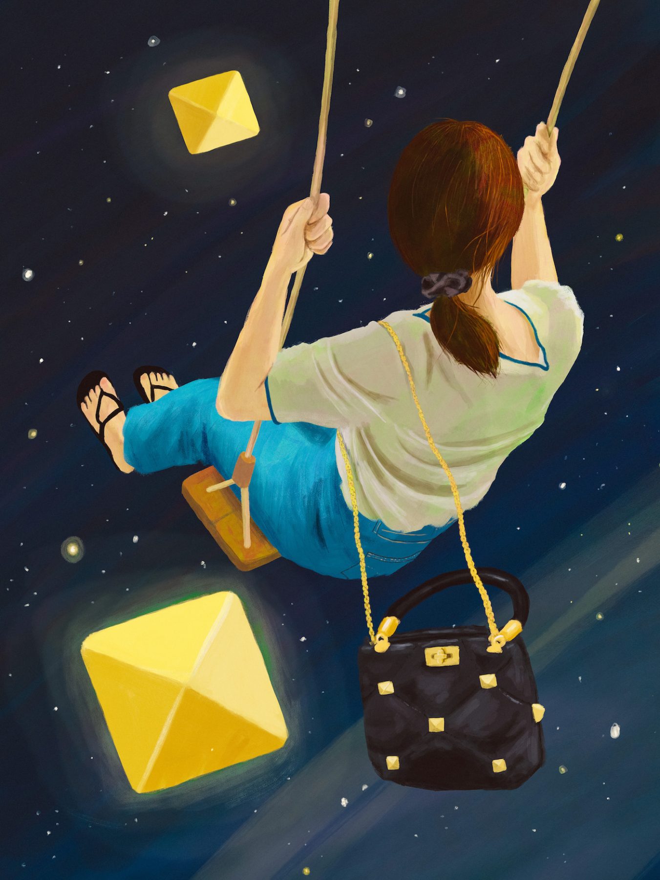 居住於江原道,最近著迷於大自然的南韓藝術家Nahum Kim,創立了這幅《Roman Stud Space》。藝術家坦言自己居住地遠離首爾,反而遇到很多啟發着他的東西,而他最喜歡在夜裏仰望星空。「看着星星讓我想像神秘的宇宙及其無限的可能性。此外,每顆閃爍的星星都給人一種整潔的感覺。當我第一次看到 Valentino Garavani Roman Stud Bag時,窩釘的細節引起了種種情緒,彷彿我在盯着星星看一樣。 我想將神秘、整潔而又花哨的窩釘細節表達為星星。」