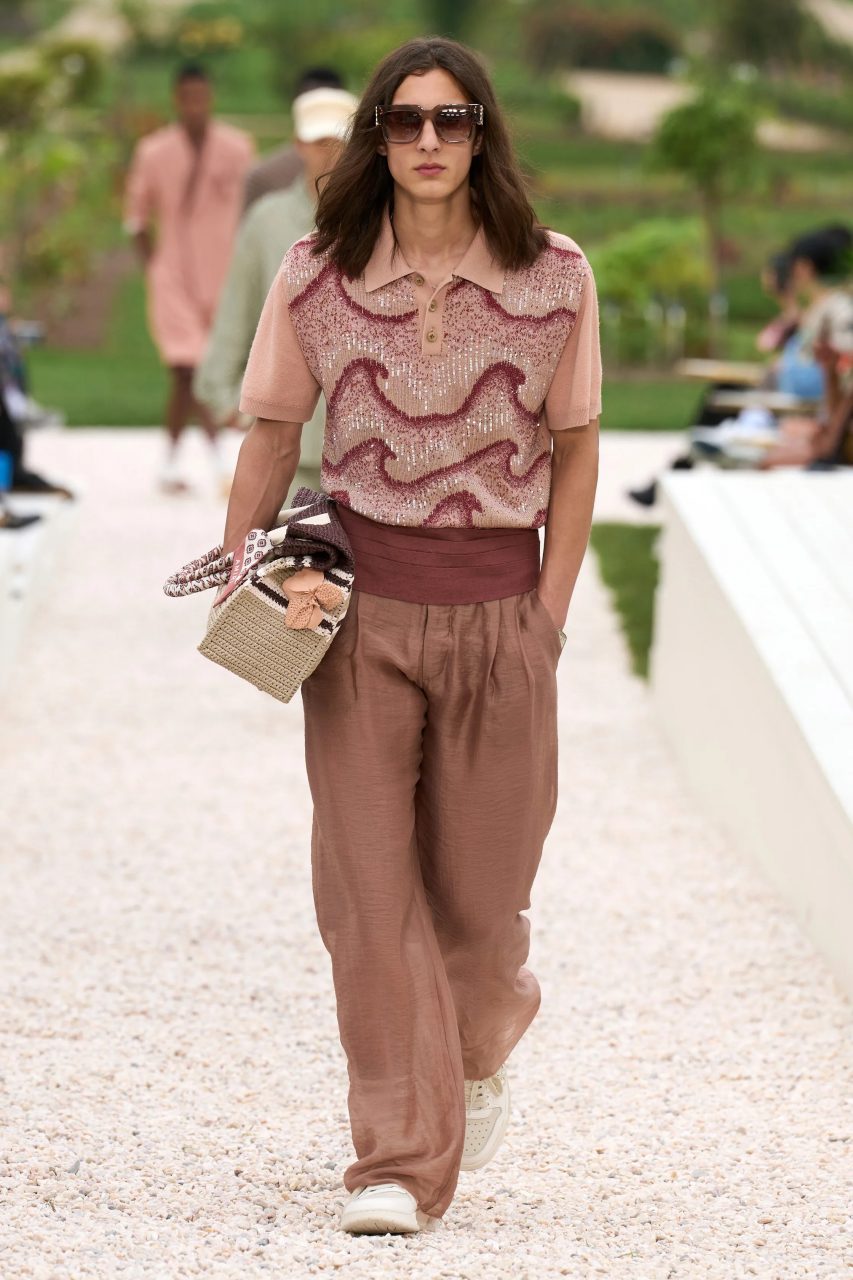 再看一個來自Amiri的例子,更有活力氣息的淺藍色穿搭。雖說是粉藍色,但品牌使用的色調帶點灰色,不會太過亮眼和幼態,裡面使用淺藍色polo針織上衣,外面加上層層白色配淺藍色外套,連褲子也用上同色調,也不顯單調。