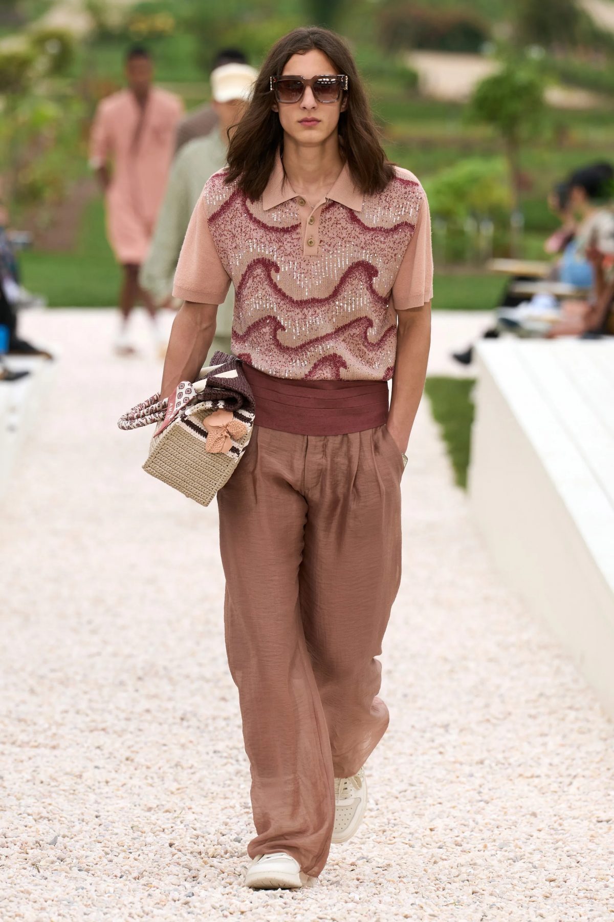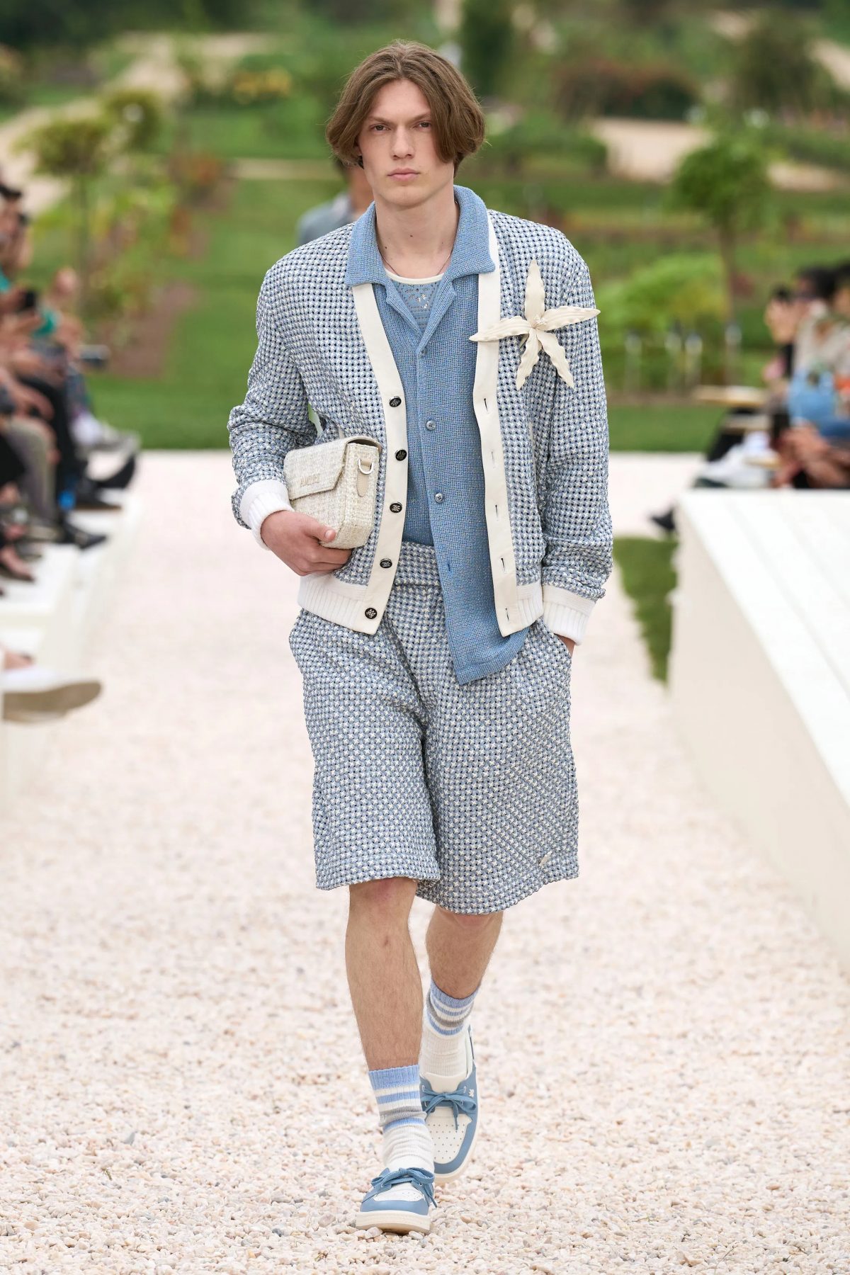 再看一個來自Amiri的例子,更有活力氣息的淺藍色穿搭。雖說是粉藍色,但品牌使用的色調帶點灰色,不會太過亮眼和幼態,裡面使用淺藍色polo針織上衣,外面加上層層白色配淺藍色外套,連褲子也用上同色調,也不顯單調。
