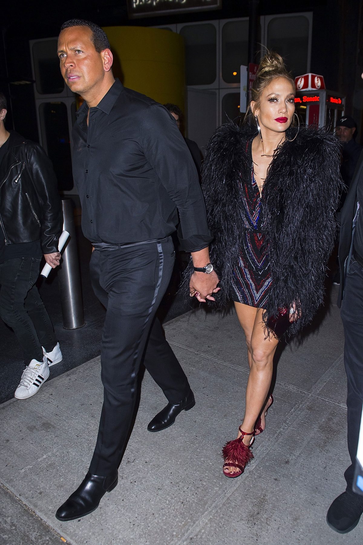 (L-R)Alex Rodriguez 和 Jennifer Lopez 出席2018年 Met Gala After-party,當時 Jennifer 穿上誇張的羽毛外套和 Balmain 連身裙。