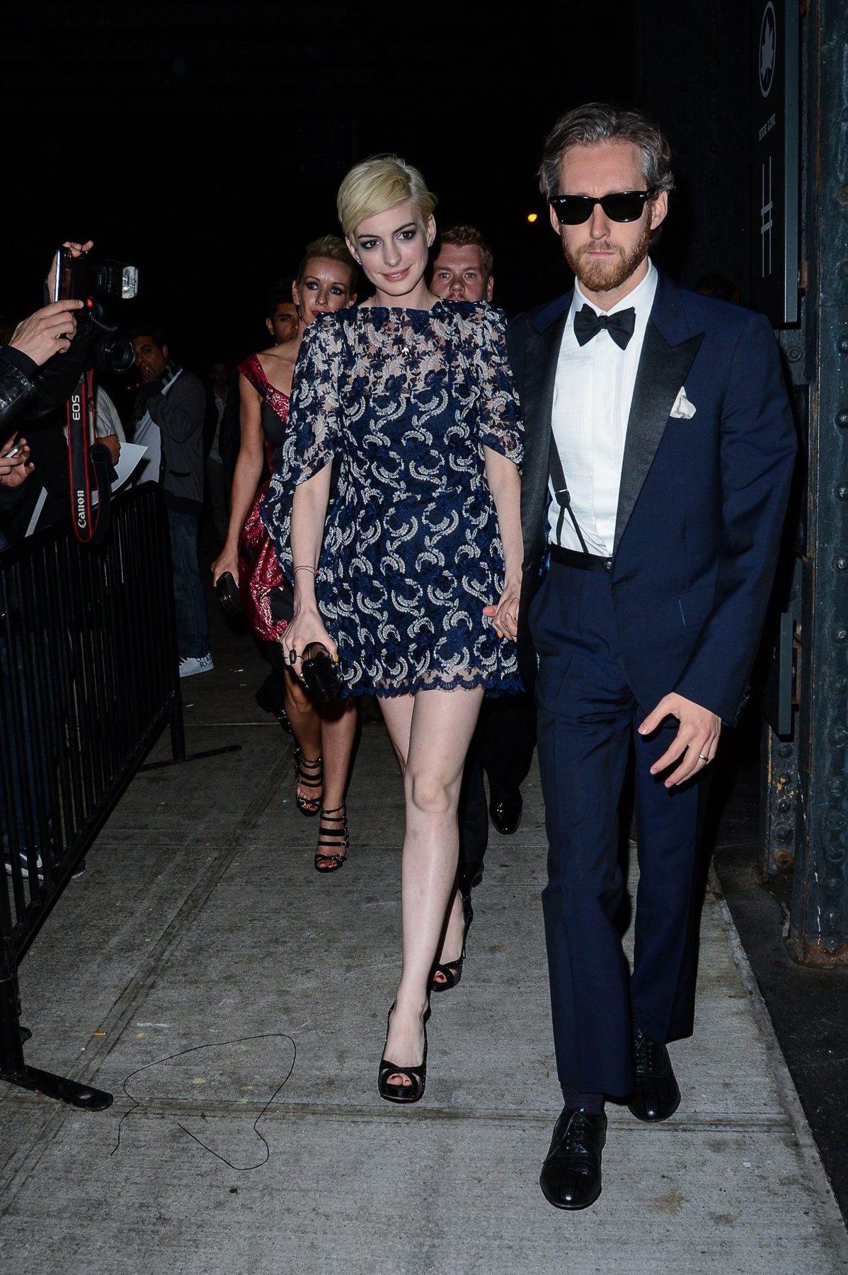 留有搶眼金色短髮的 Anne Hathaway 以 Valentino 連身裙造型出席2013年 Met Gala after-party。