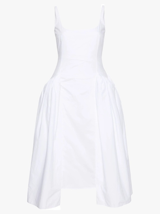 Khaite 和 Tove 也擁抱了這一「極簡牛奶女工」連身裙,後者的 Solene 款式是時尚女孩的最愛。不過除此之外,也有很多價格相宜的替代選擇,例如 Reformation 和 House of CB。