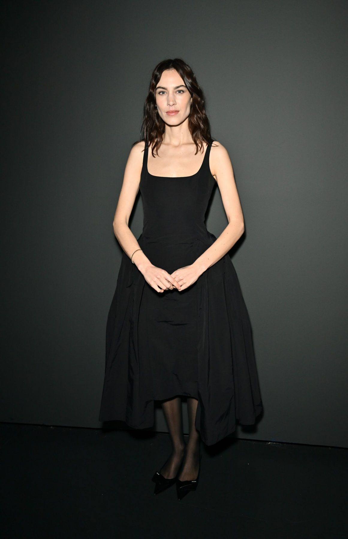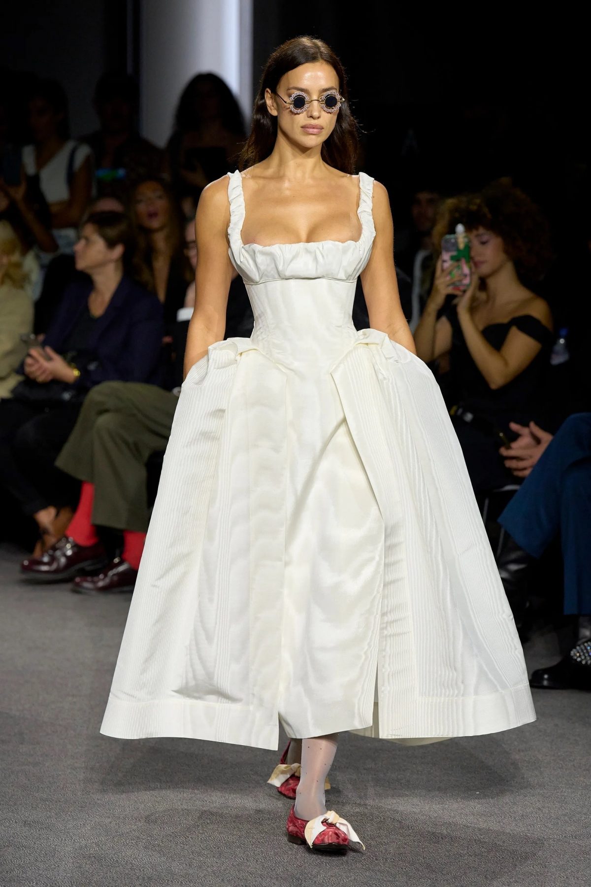 如果是這樣的話,那 Vivienne Westwood 的 Andreas Kronthaler 將賭注押在了凸顯臀部廓形的禮服上也不足為奇。在該品牌的 2024 春夏時裝展上,Irina Shayk 穿着引人注目的米白色真絲連身裙現身舞台,搭配蝴蝶結平底鞋和圓形太陽眼鏡,既優雅又張揚。