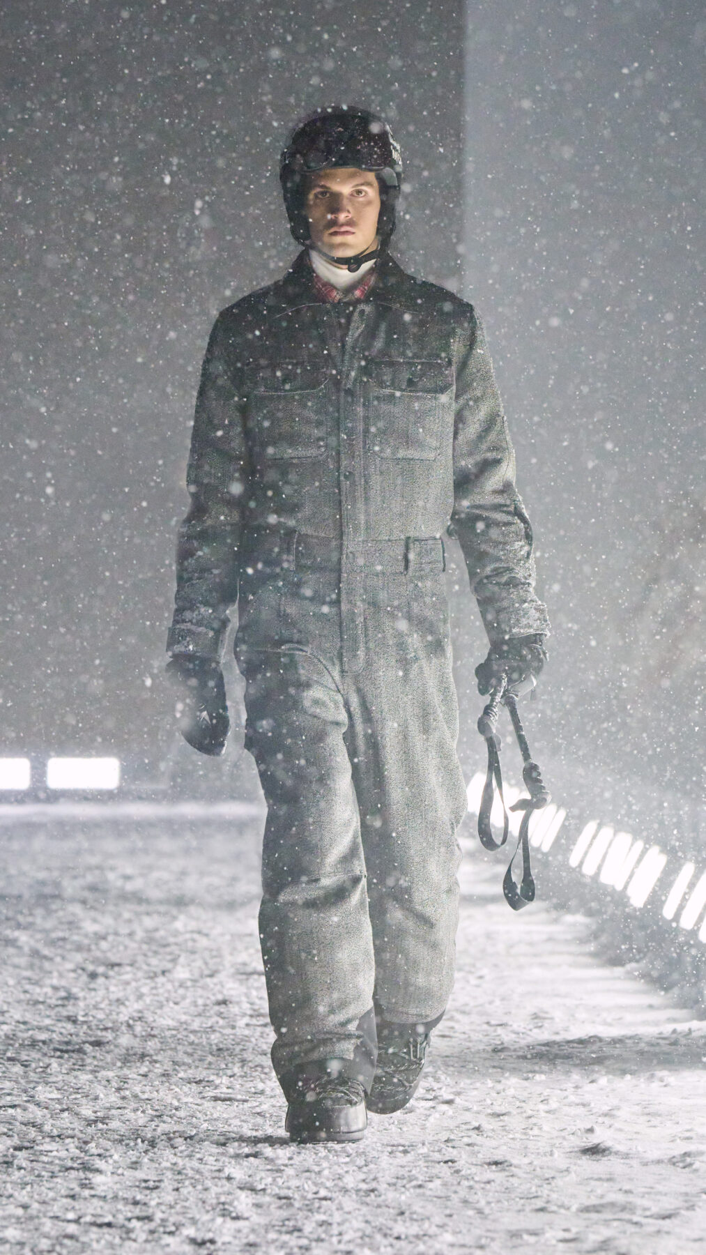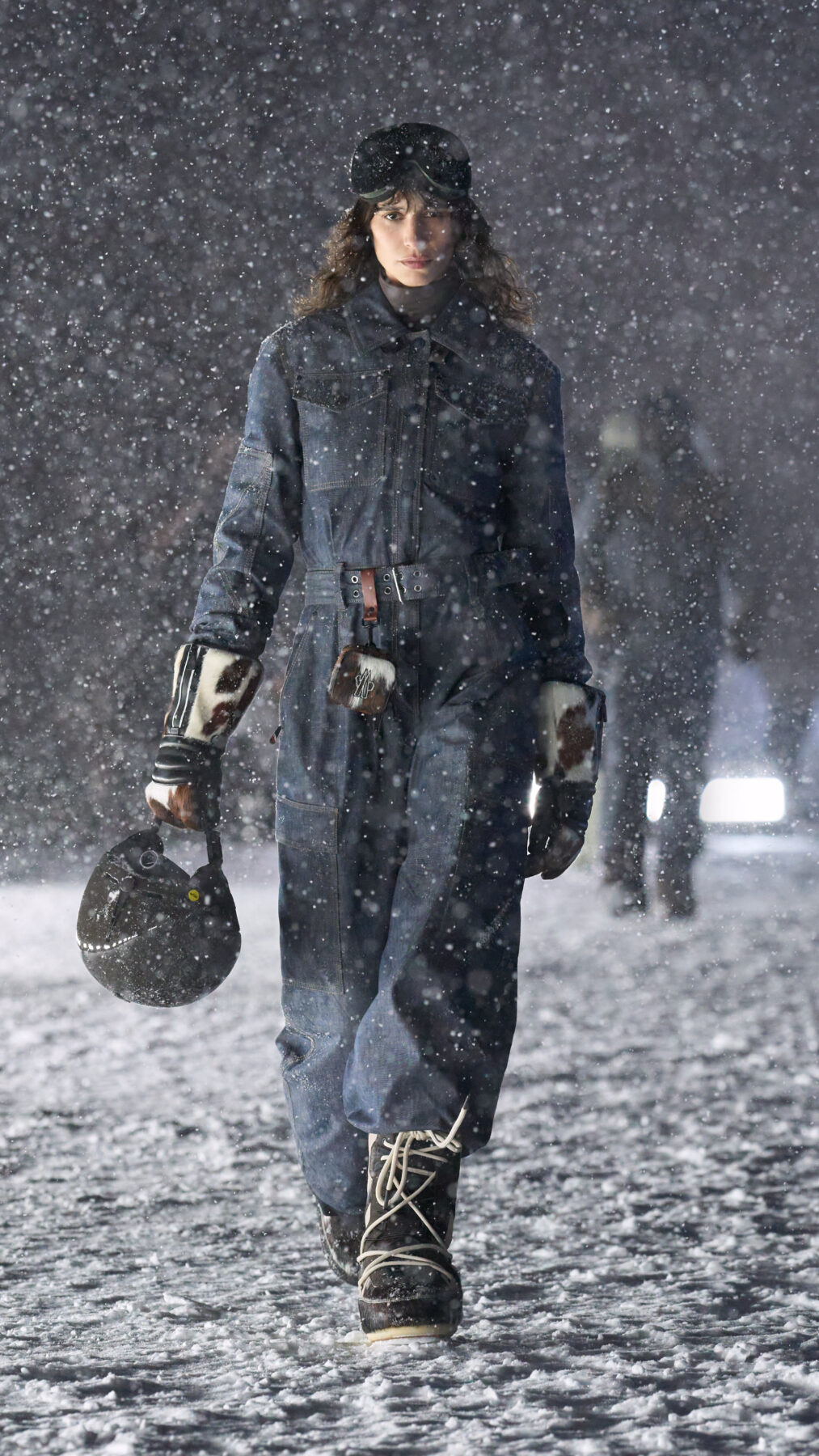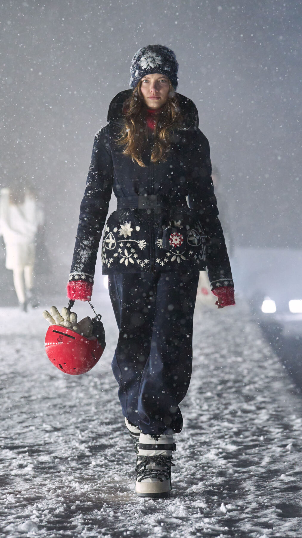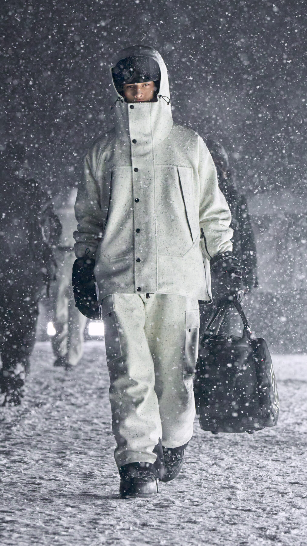 系列運用獨創混紡工藝——意想不到的物料如源自工作服的牛仔布和帆布、來自西裝的千鳥格Smart Wool、甚至觸感立體的毛圈布,每種物料也經過特別處理和添上隱形防水薄膜,配合雪地的獨特環境。滑雪服和滑雪外套以精巧的嵌花細節點綴,將精湛的手製工藝融入專業滑雪裝備之中。舒適貼服的保暖針織服飾亦貫穿整個系列,以革新針織技術打造出外套以及厚身內層衣物和蓬鬆半截裙;兩件式套裝暗藏玄機——看似粗花呢的布料,實際上是採用羊毛刺繡工藝的Nylon Laqué高科技拼布;天然和人造初剪羊毛為系列服飾增添細緻質感,化作長身大衣,又或巧妙點綴衣領、袖口或柔軟手袋。