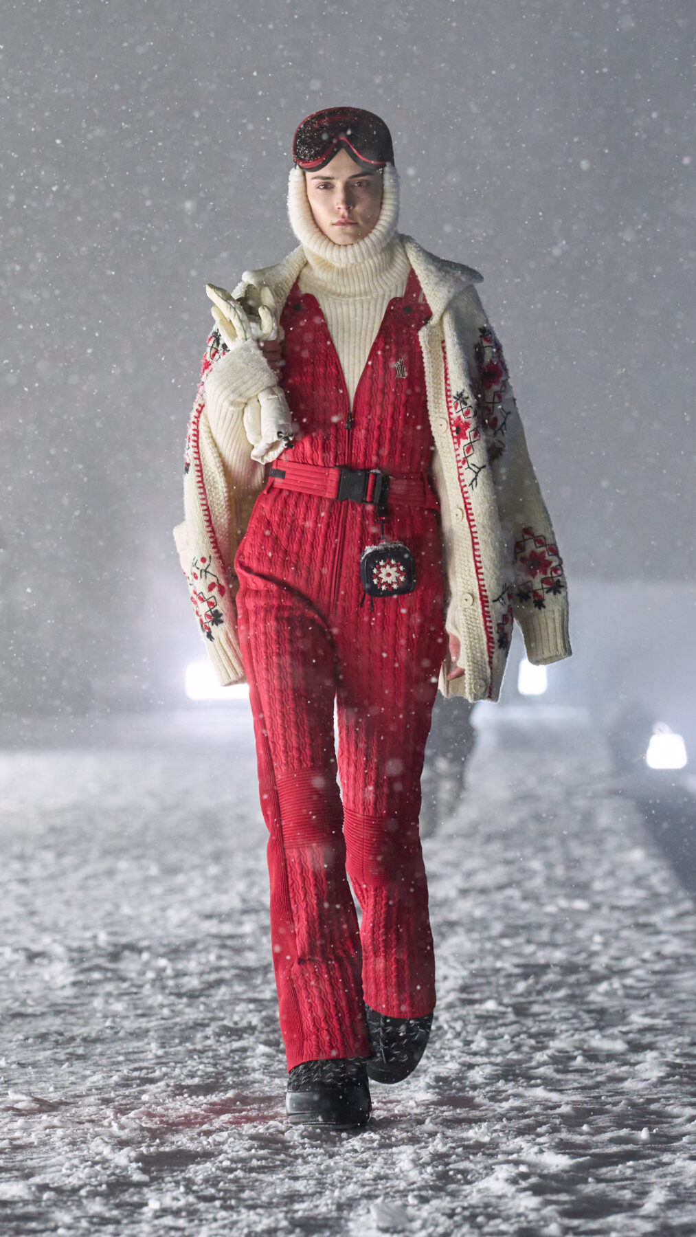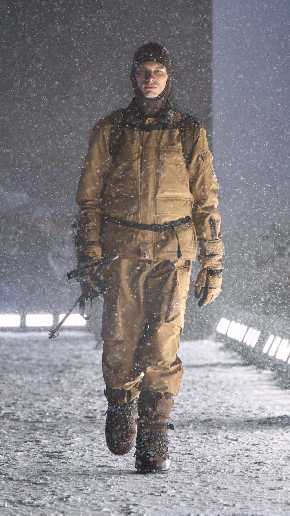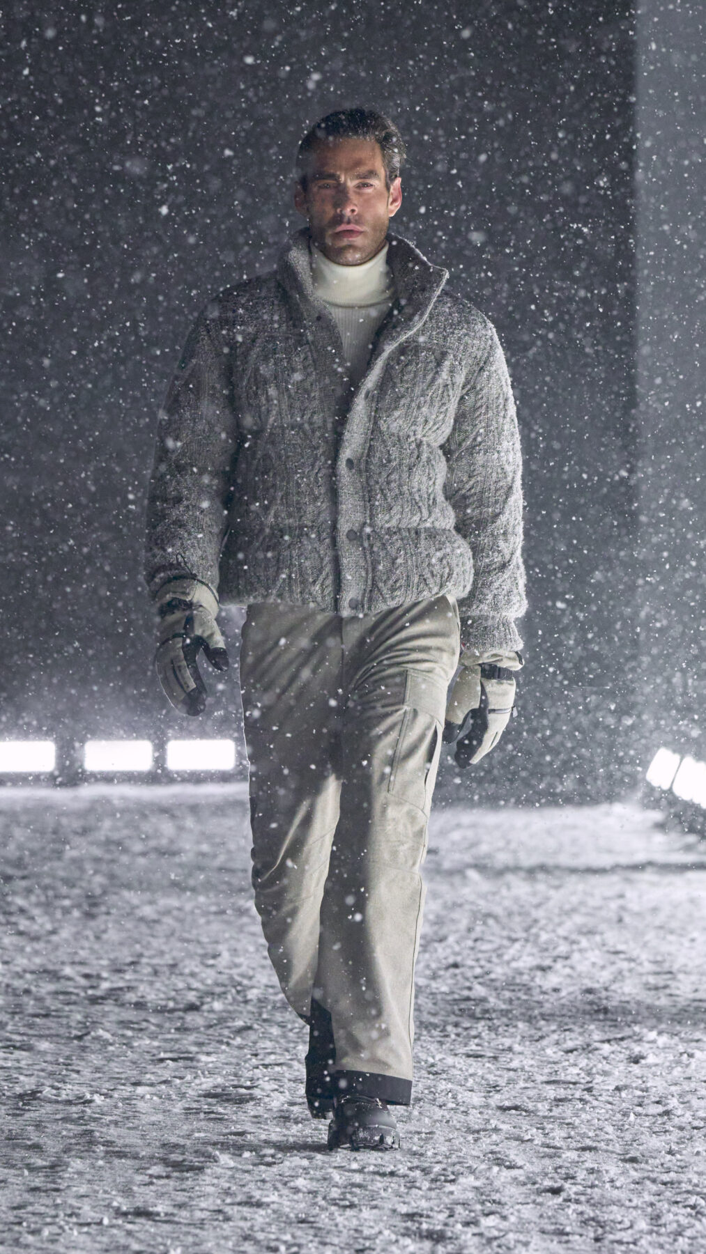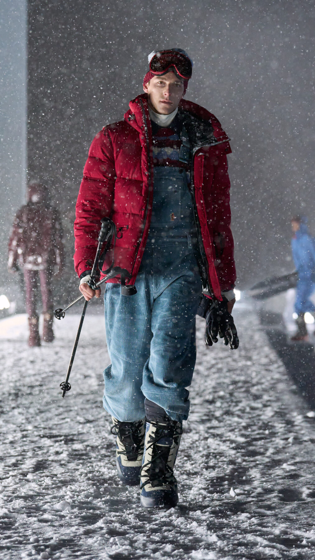 系列運用獨創混紡工藝——意想不到的物料如源自工作服的牛仔布和帆布、來自西裝的千鳥格Smart Wool、甚至觸感立體的毛圈布,每種物料也經過特別處理和添上隱形防水薄膜,配合雪地的獨特環境。滑雪服和滑雪外套以精巧的嵌花細節點綴,將精湛的手製工藝融入專業滑雪裝備之中。舒適貼服的保暖針織服飾亦貫穿整個系列,以革新針織技術打造出外套以及厚身內層衣物和蓬鬆半截裙;兩件式套裝暗藏玄機——看似粗花呢的布料,實際上是採用羊毛刺繡工藝的Nylon Laqué高科技拼布;天然和人造初剪羊毛為系列服飾增添細緻質感,化作長身大衣,又或巧妙點綴衣領、袖口或柔軟手袋。