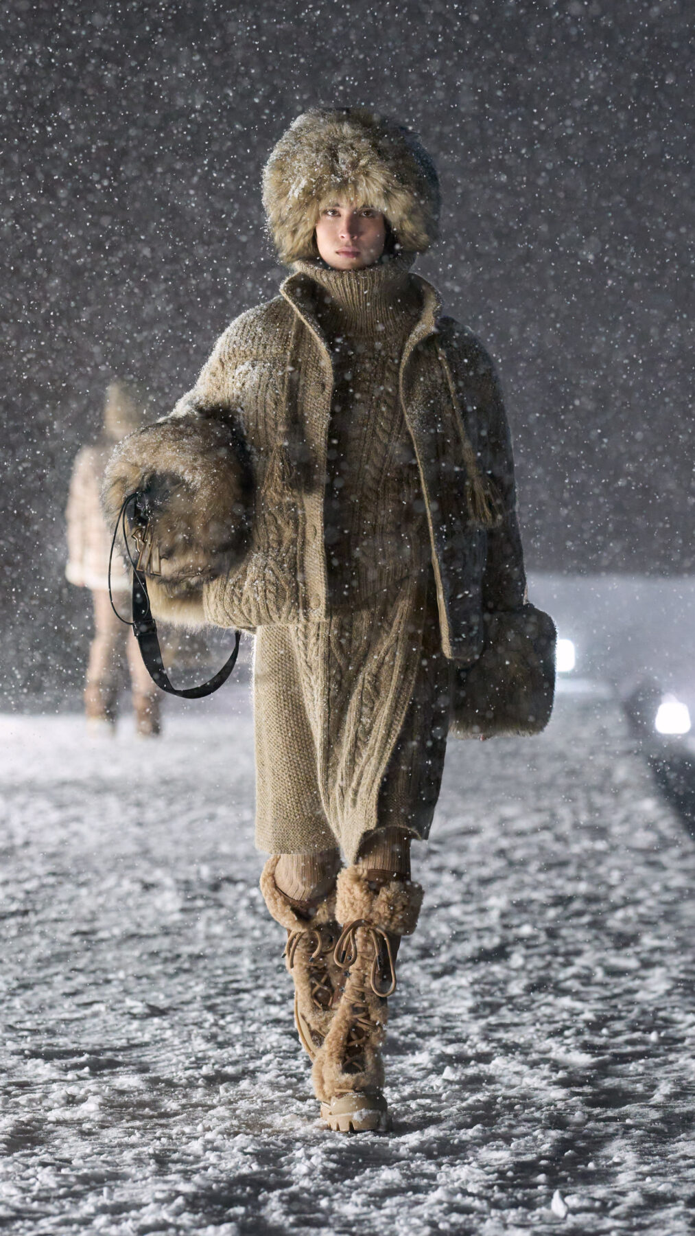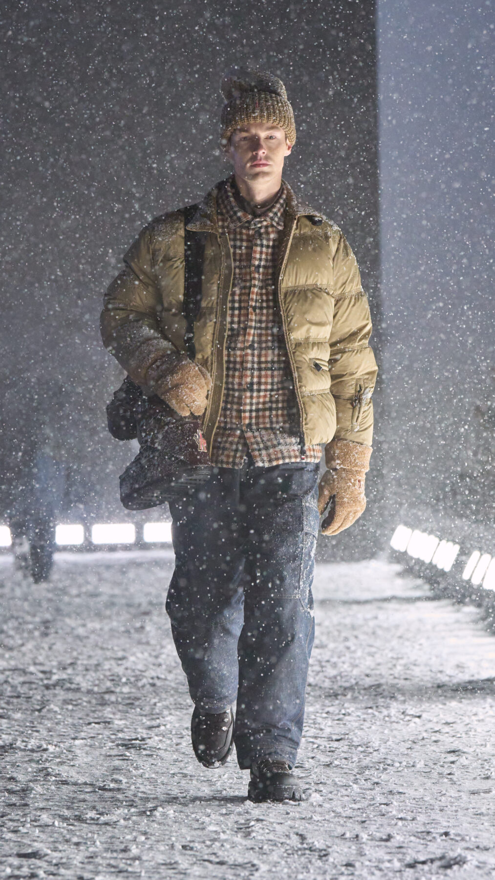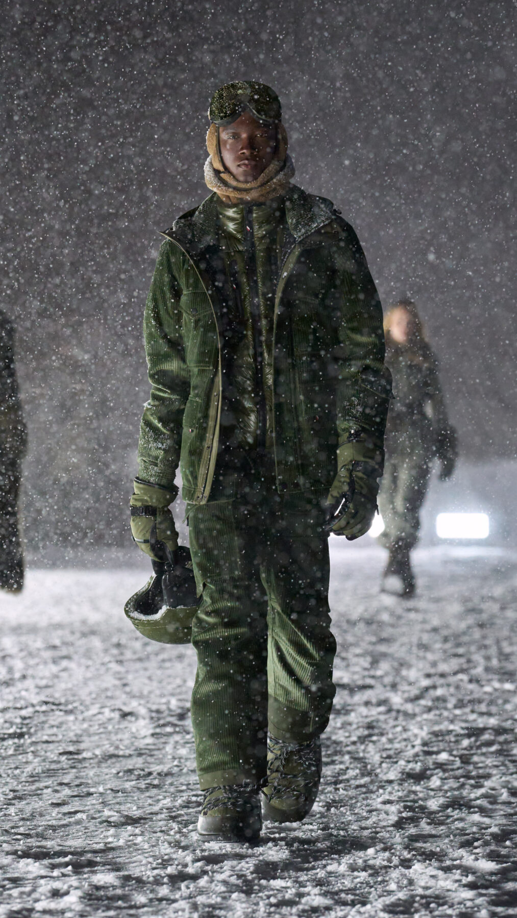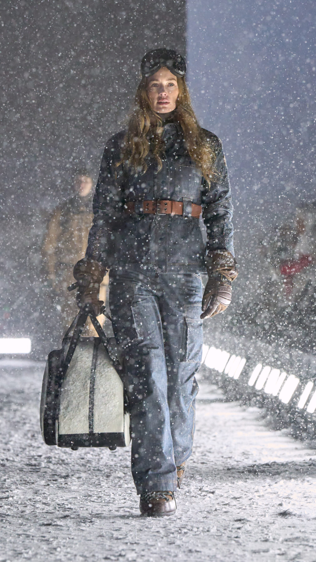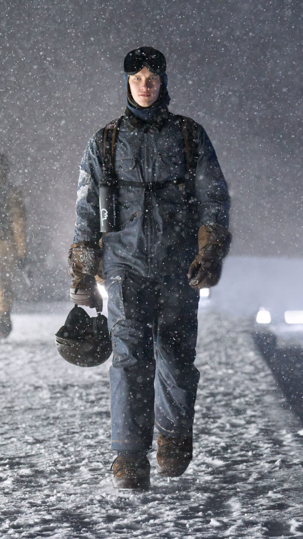 系列運用獨創混紡工藝——意想不到的物料如源自工作服的牛仔布和帆布、來自西裝的千鳥格Smart Wool、甚至觸感立體的毛圈布,每種物料也經過特別處理和添上隱形防水薄膜,配合雪地的獨特環境。滑雪服和滑雪外套以精巧的嵌花細節點綴,將精湛的手製工藝融入專業滑雪裝備之中。舒適貼服的保暖針織服飾亦貫穿整個系列,以革新針織技術打造出外套以及厚身內層衣物和蓬鬆半截裙;兩件式套裝暗藏玄機——看似粗花呢的布料,實際上是採用羊毛刺繡工藝的Nylon Laqué高科技拼布;天然和人造初剪羊毛為系列服飾增添細緻質感,化作長身大衣,又或巧妙點綴衣領、袖口或柔軟手袋。