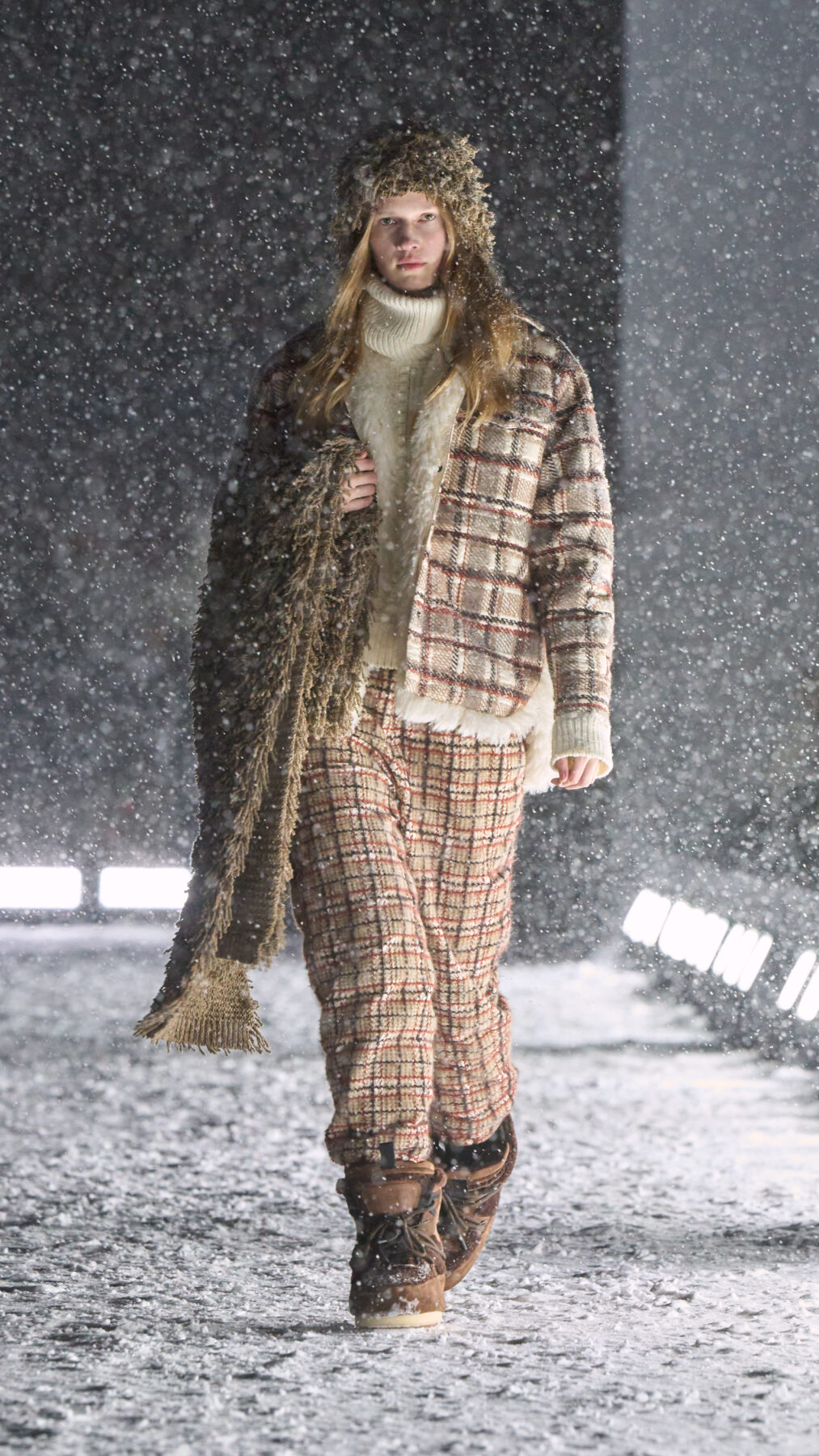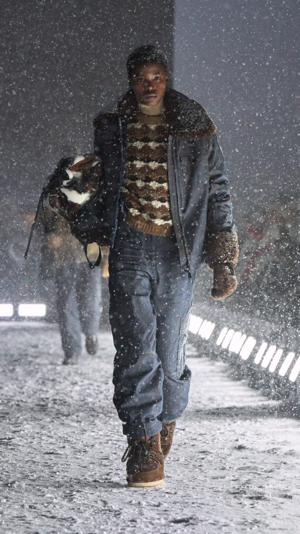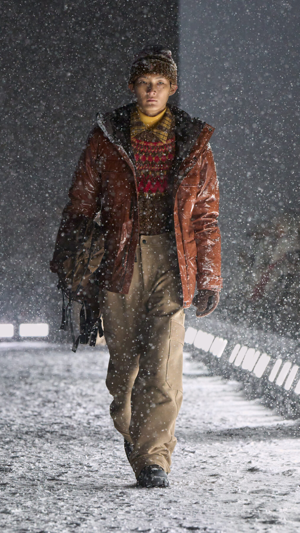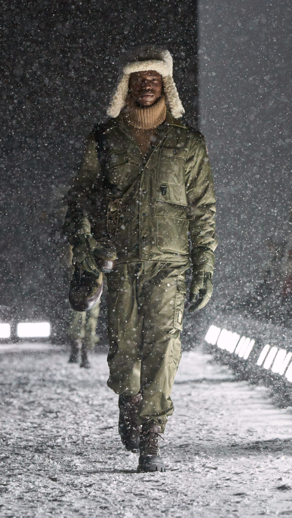 系列運用獨創混紡工藝——意想不到的物料如源自工作服的牛仔布和帆布、來自西裝的千鳥格Smart Wool、甚至觸感立體的毛圈布,每種物料也經過特別處理和添上隱形防水薄膜,配合雪地的獨特環境。滑雪服和滑雪外套以精巧的嵌花細節點綴,將精湛的手製工藝融入專業滑雪裝備之中。舒適貼服的保暖針織服飾亦貫穿整個系列,以革新針織技術打造出外套以及厚身內層衣物和蓬鬆半截裙;兩件式套裝暗藏玄機——看似粗花呢的布料,實際上是採用羊毛刺繡工藝的Nylon Laqué高科技拼布;天然和人造初剪羊毛為系列服飾增添細緻質感,化作長身大衣,又或巧妙點綴衣領、袖口或柔軟手袋。