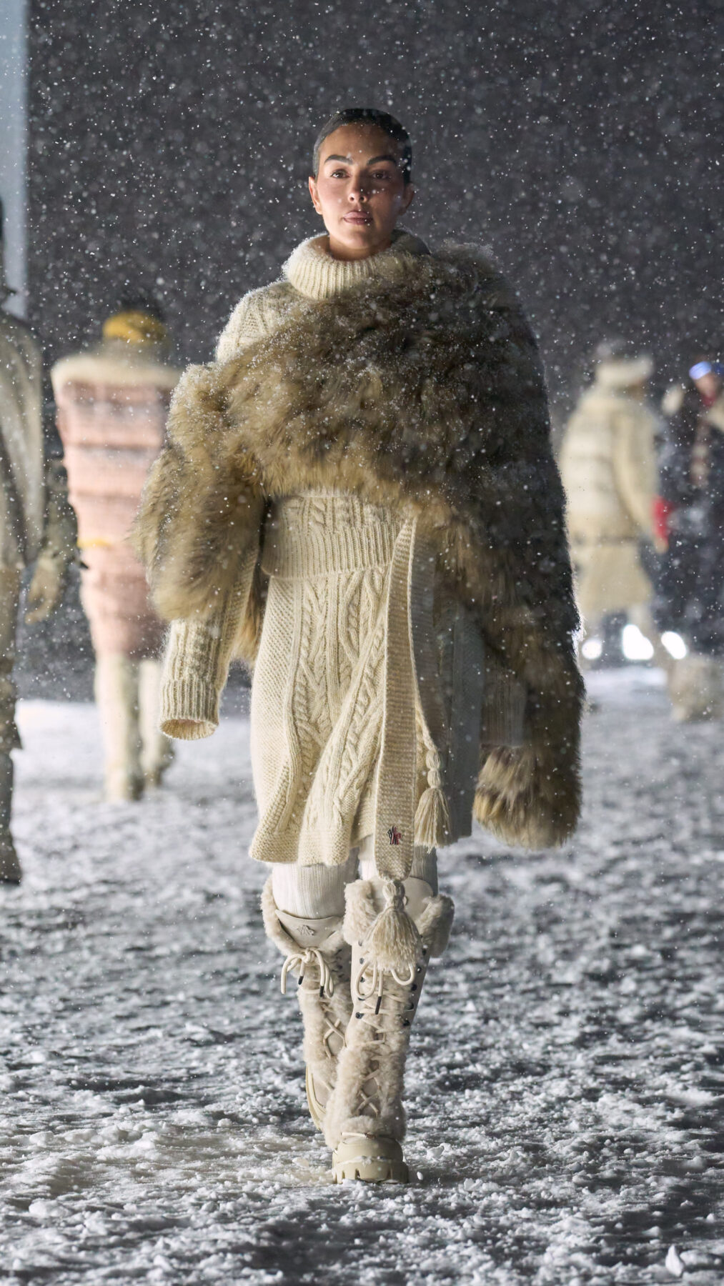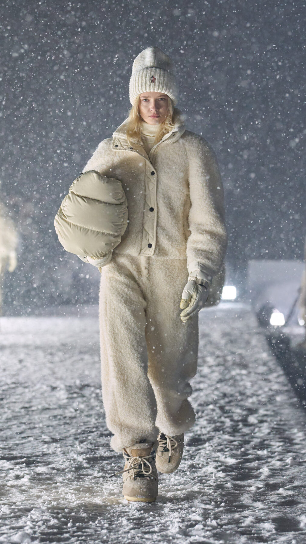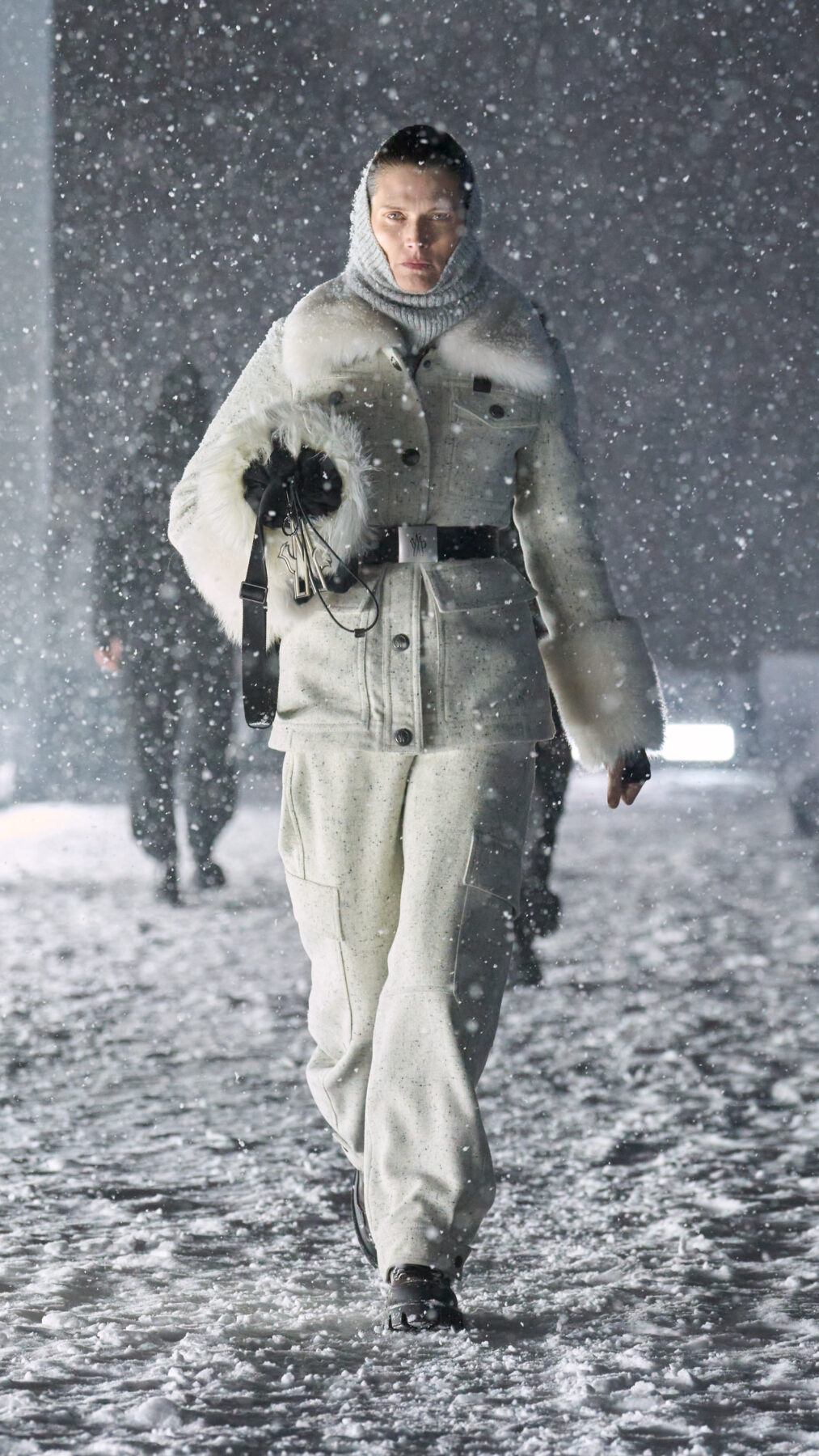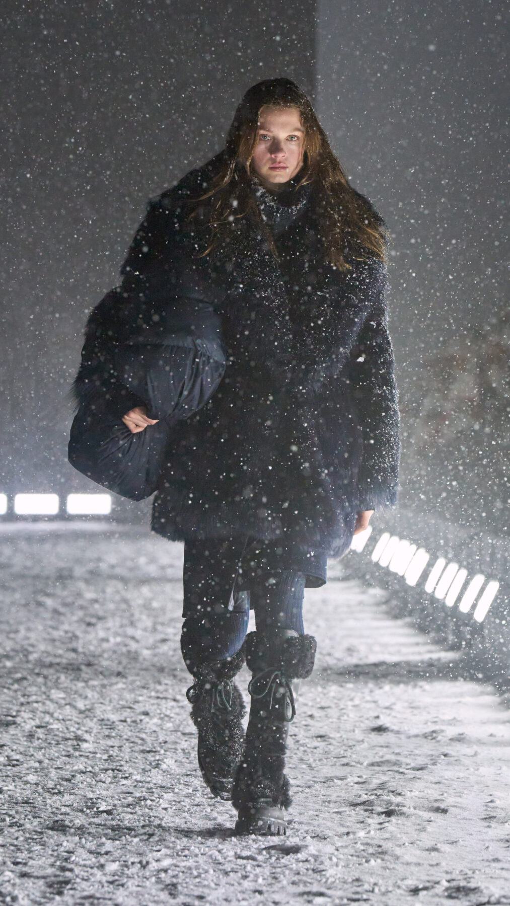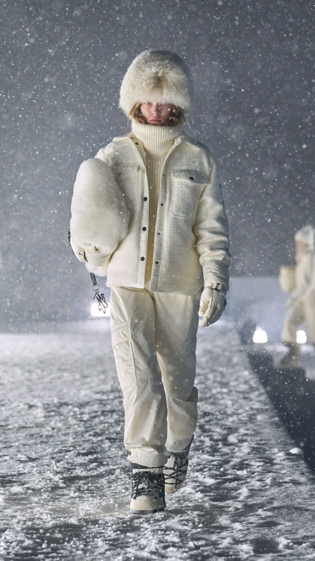 傍晚時分,不出所料雪愈下愈大,集合時間比預定推遲稍許,然後我們終於到達時裝展場地——高雪維爾機場,作為歐洲海拔最高(2,008米)的機場,四周被雪嶺環抱。Moncler Grenoble 2025 秋冬系列時裝展便是在這個偌大而不凡的露天場地上演。我們安坐在U型跑道兩旁,夜幕低垂,一束束白光照亮跑道,形成一個飄渺夢幻的圓拱形空間。按照品牌要求,全部嘉賓披上雪白的羽絨斗篷,巧妙呼應潔白無瑕的連綿雪嶺。白雪覆蓋的冬日夢幻雪景中,伴隨着由現場交響樂團演奏、宛如星河的優雅旋律,彼時樂章與大雪相互交織。這絕非一般的時裝展,卻是一個令人畢生難忘的夜晚。