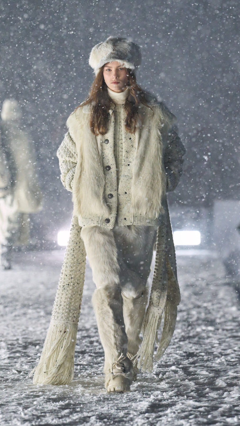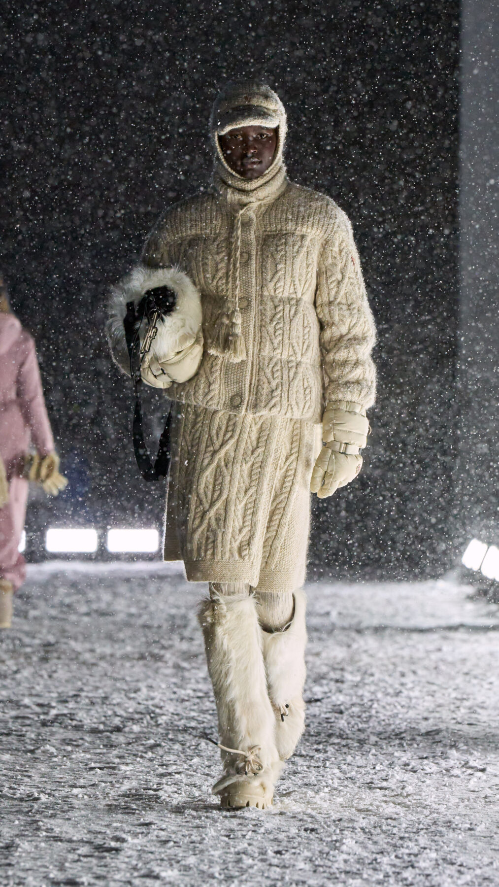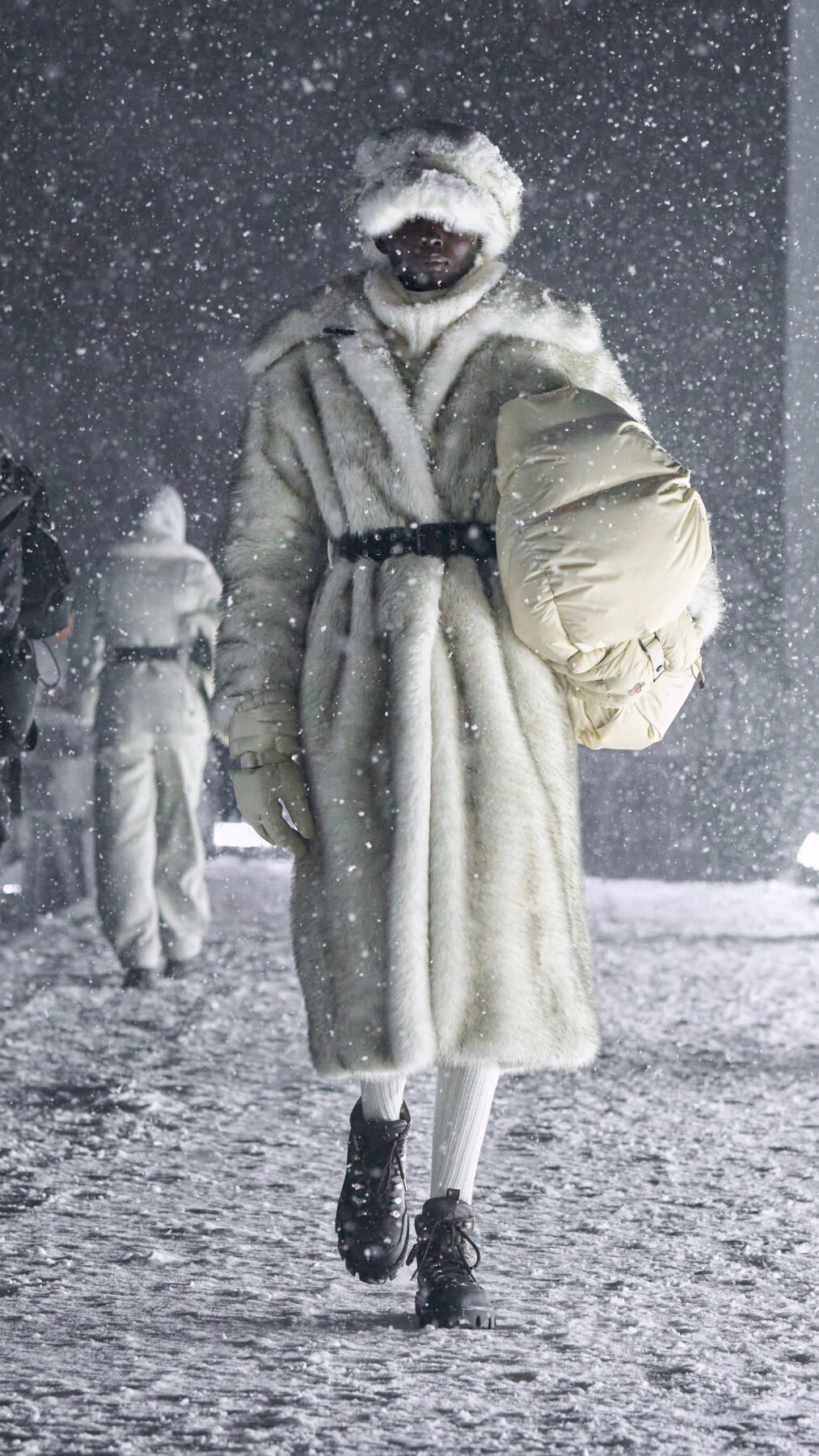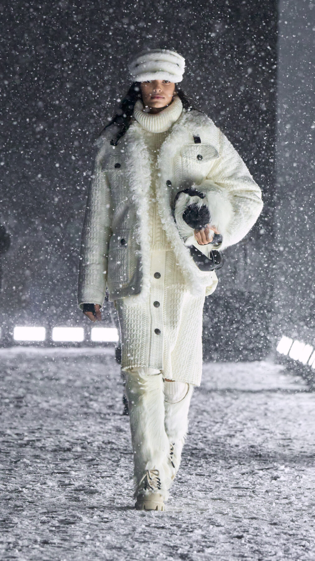 傍晚時分,不出所料雪愈下愈大,集合時間比預定推遲稍許,然後我們終於到達時裝展場地——高雪維爾機場,作為歐洲海拔最高(2,008米)的機場,四周被雪嶺環抱。Moncler Grenoble 2025 秋冬系列時裝展便是在這個偌大而不凡的露天場地上演。我們安坐在U型跑道兩旁,夜幕低垂,一束束白光照亮跑道,形成一個飄渺夢幻的圓拱形空間。按照品牌要求,全部嘉賓披上雪白的羽絨斗篷,巧妙呼應潔白無瑕的連綿雪嶺。白雪覆蓋的冬日夢幻雪景中,伴隨着由現場交響樂團演奏、宛如星河的優雅旋律,彼時樂章與大雪相互交織。這絕非一般的時裝展,卻是一個令人畢生難忘的夜晚。