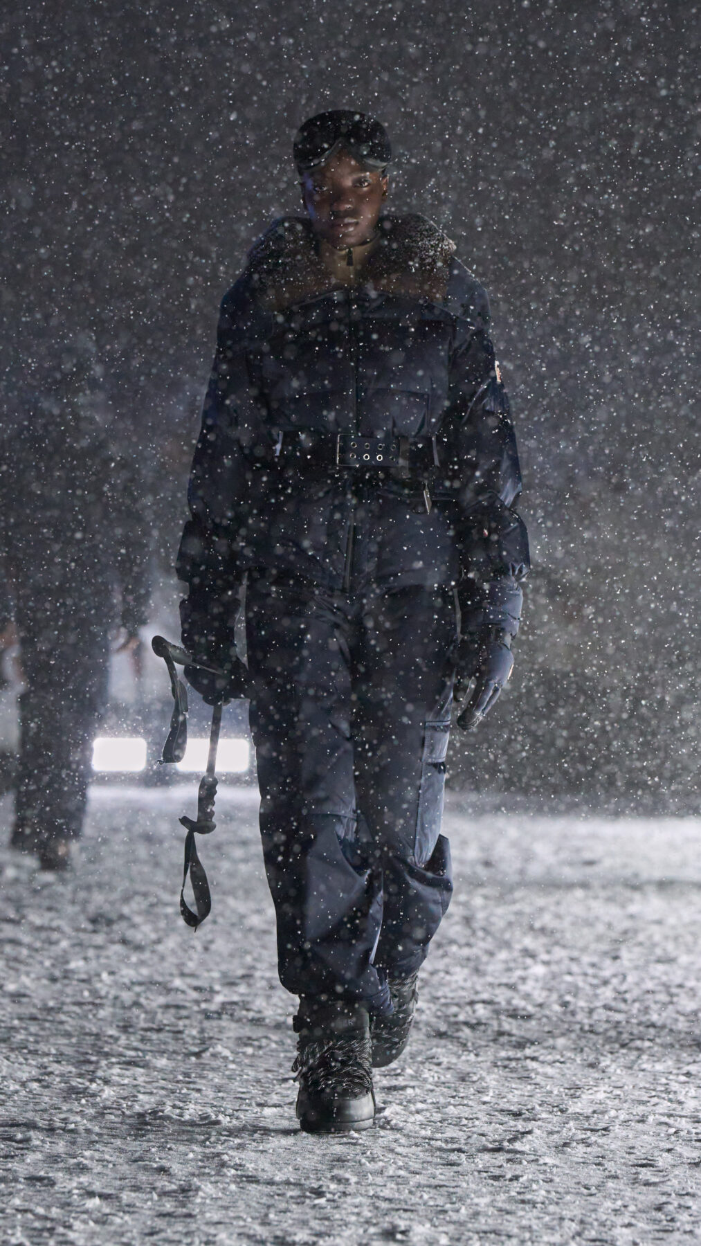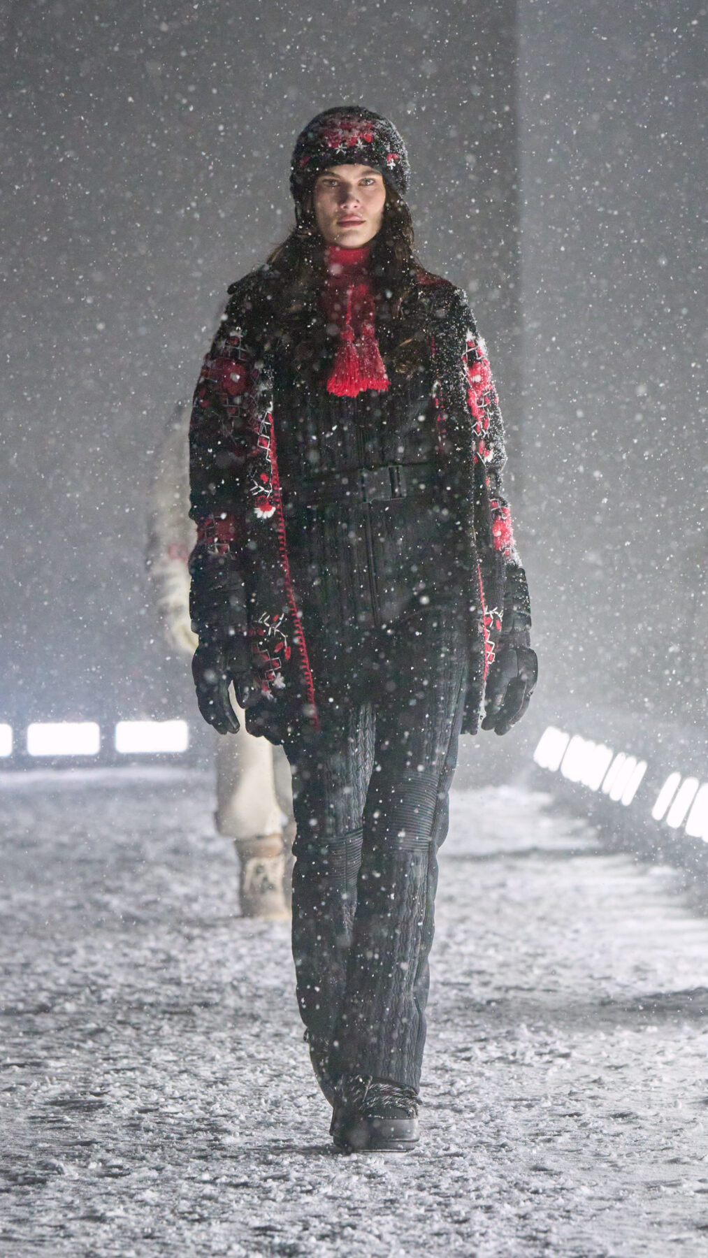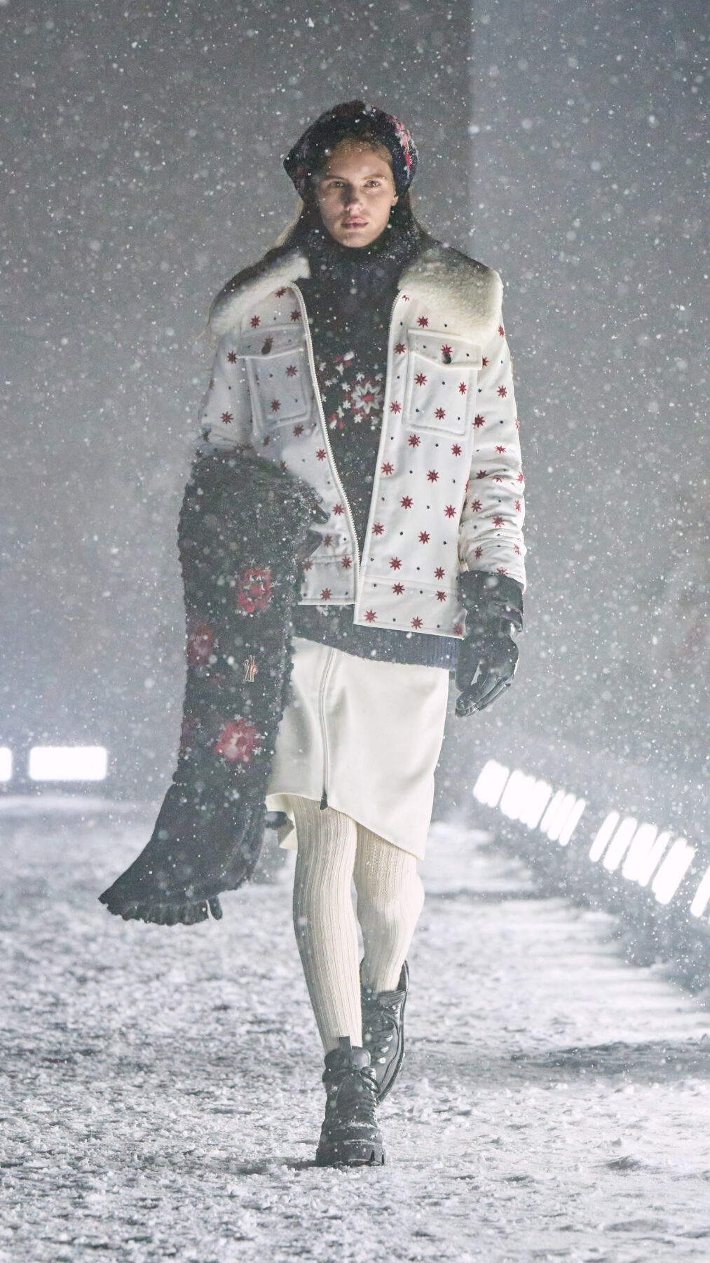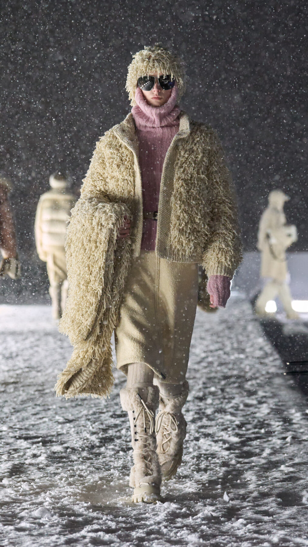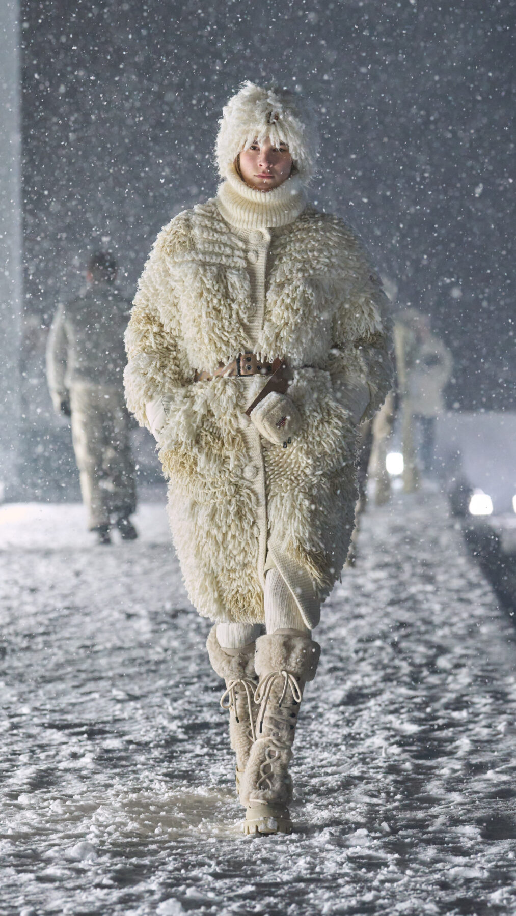 傍晚時分,不出所料雪愈下愈大,集合時間比預定推遲稍許,然後我們終於到達時裝展場地——高雪維爾機場,作為歐洲海拔最高(2,008米)的機場,四周被雪嶺環抱。Moncler Grenoble 2025 秋冬系列時裝展便是在這個偌大而不凡的露天場地上演。我們安坐在U型跑道兩旁,夜幕低垂,一束束白光照亮跑道,形成一個飄渺夢幻的圓拱形空間。按照品牌要求,全部嘉賓披上雪白的羽絨斗篷,巧妙呼應潔白無瑕的連綿雪嶺。白雪覆蓋的冬日夢幻雪景中,伴隨着由現場交響樂團演奏、宛如星河的優雅旋律,彼時樂章與大雪相互交織。這絕非一般的時裝展,卻是一個令人畢生難忘的夜晚。