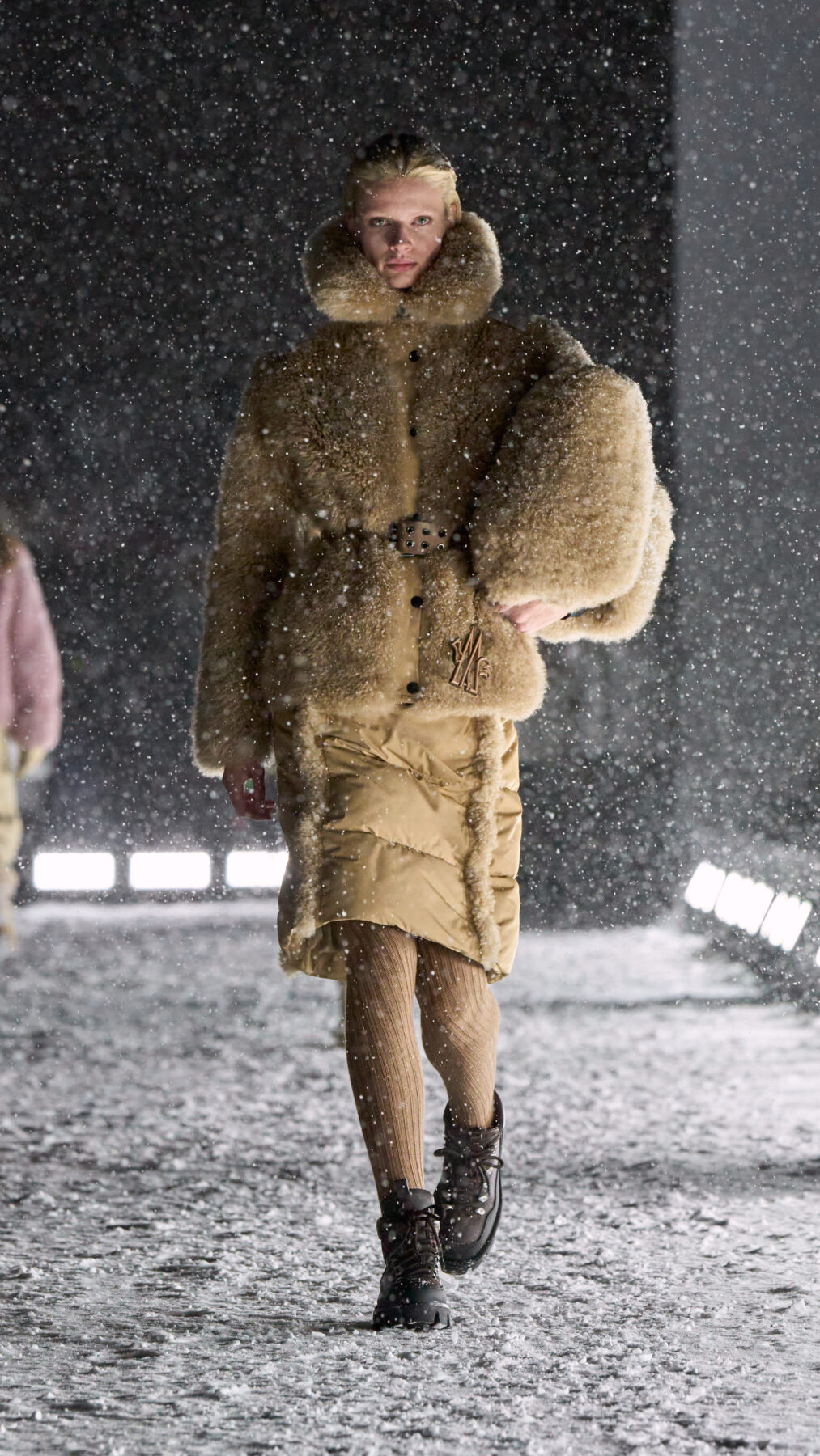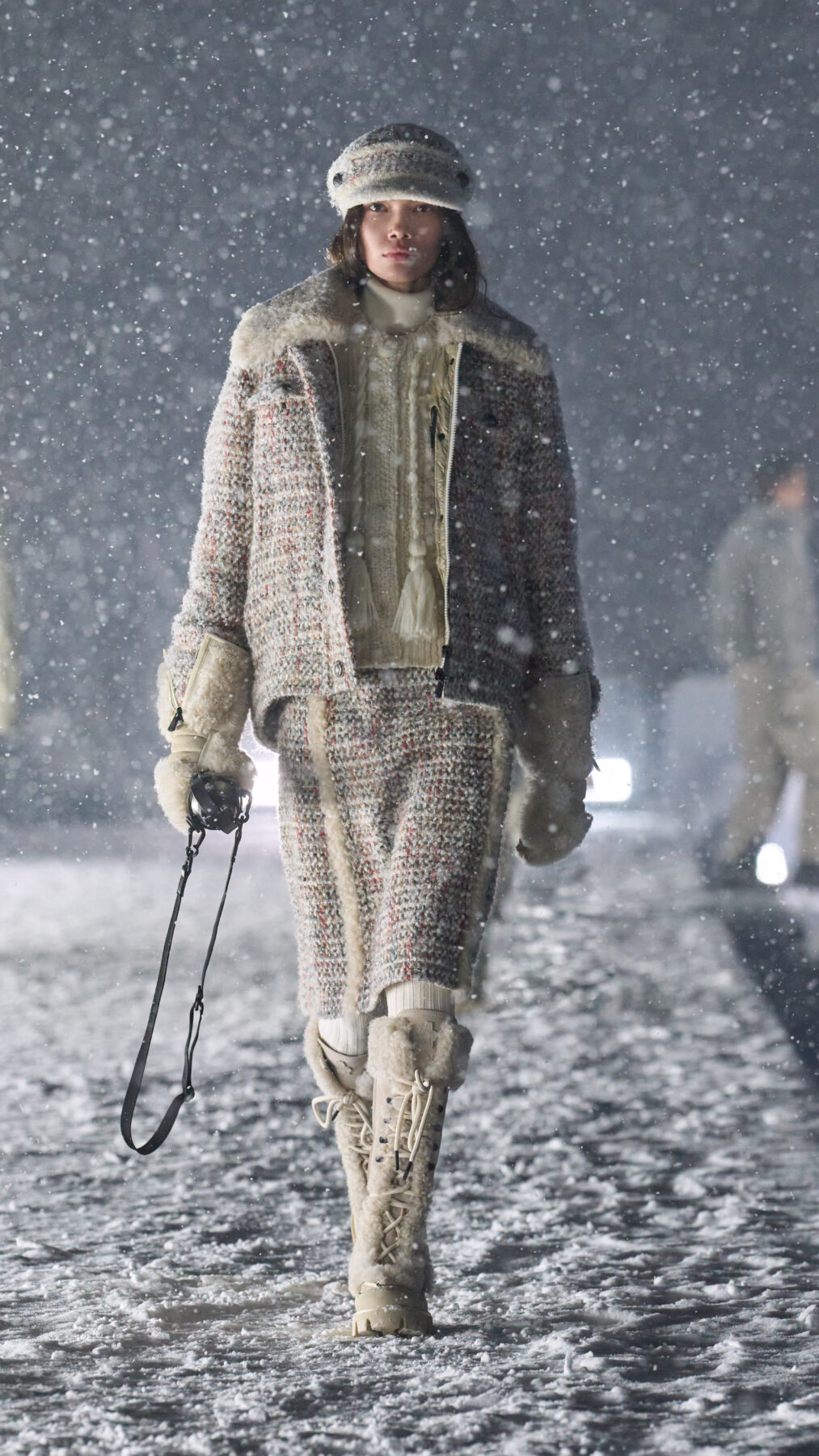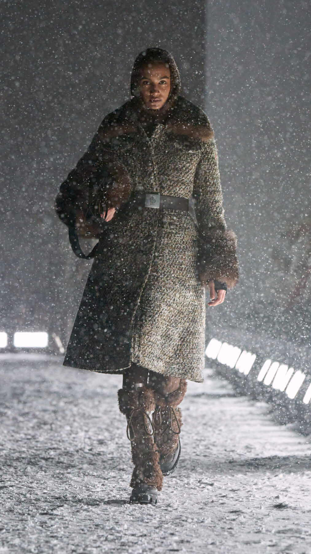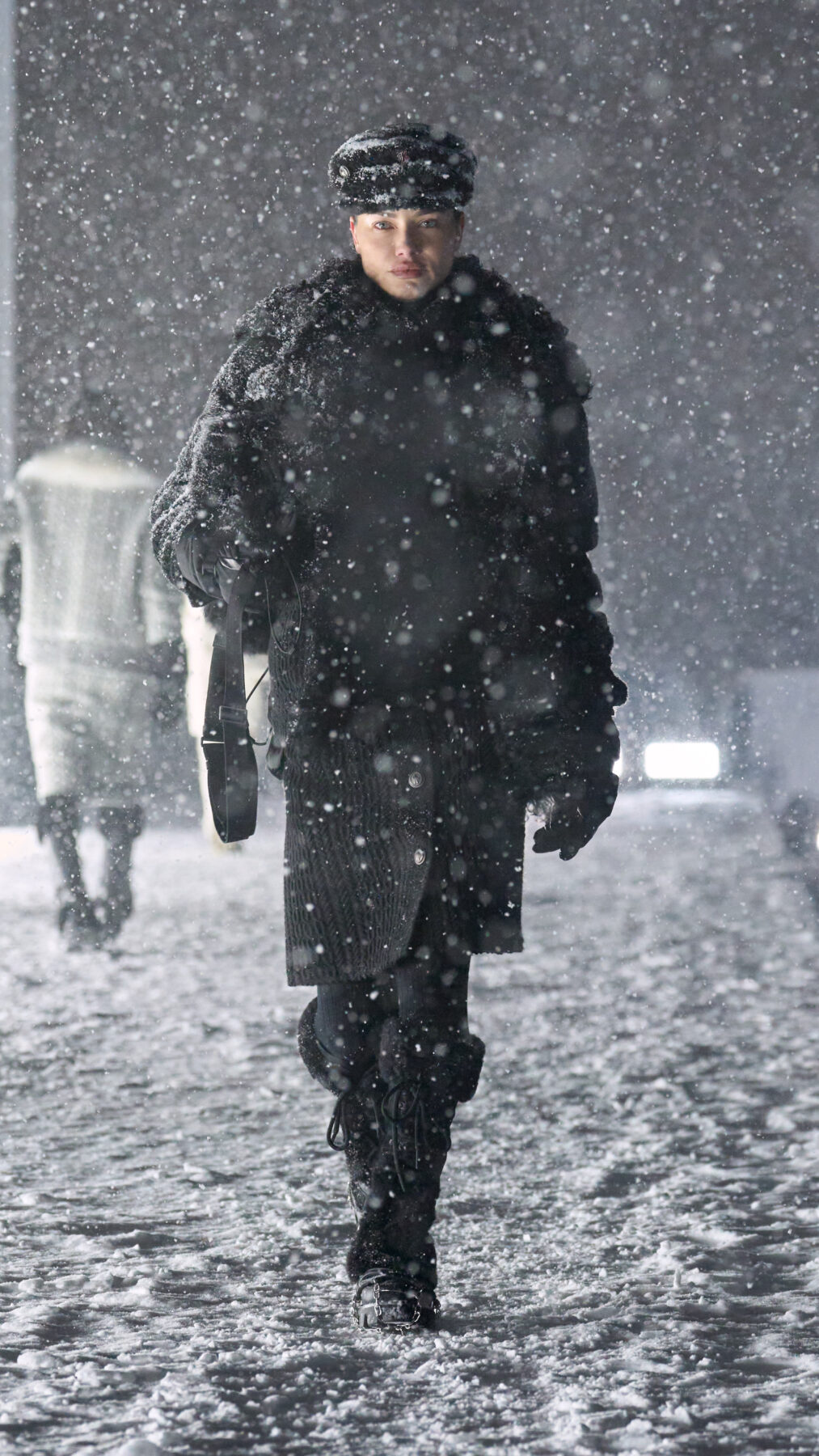 傍晚時分,不出所料雪愈下愈大,集合時間比預定推遲稍許,然後我們終於到達時裝展場地——高雪維爾機場,作為歐洲海拔最高(2,008米)的機場,四周被雪嶺環抱。Moncler Grenoble 2025 秋冬系列時裝展便是在這個偌大而不凡的露天場地上演。我們安坐在U型跑道兩旁,夜幕低垂,一束束白光照亮跑道,形成一個飄渺夢幻的圓拱形空間。按照品牌要求,全部嘉賓披上雪白的羽絨斗篷,巧妙呼應潔白無瑕的連綿雪嶺。白雪覆蓋的冬日夢幻雪景中,伴隨着由現場交響樂團演奏、宛如星河的優雅旋律,彼時樂章與大雪相互交織。這絕非一般的時裝展,卻是一個令人畢生難忘的夜晚。