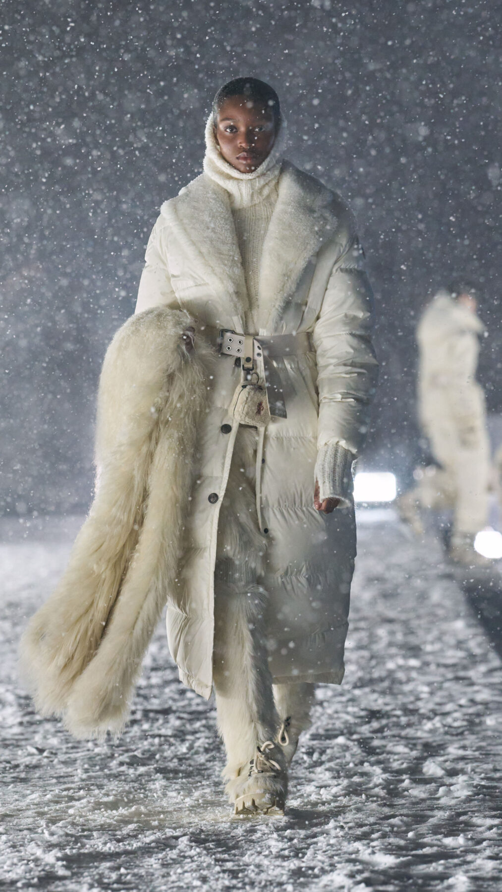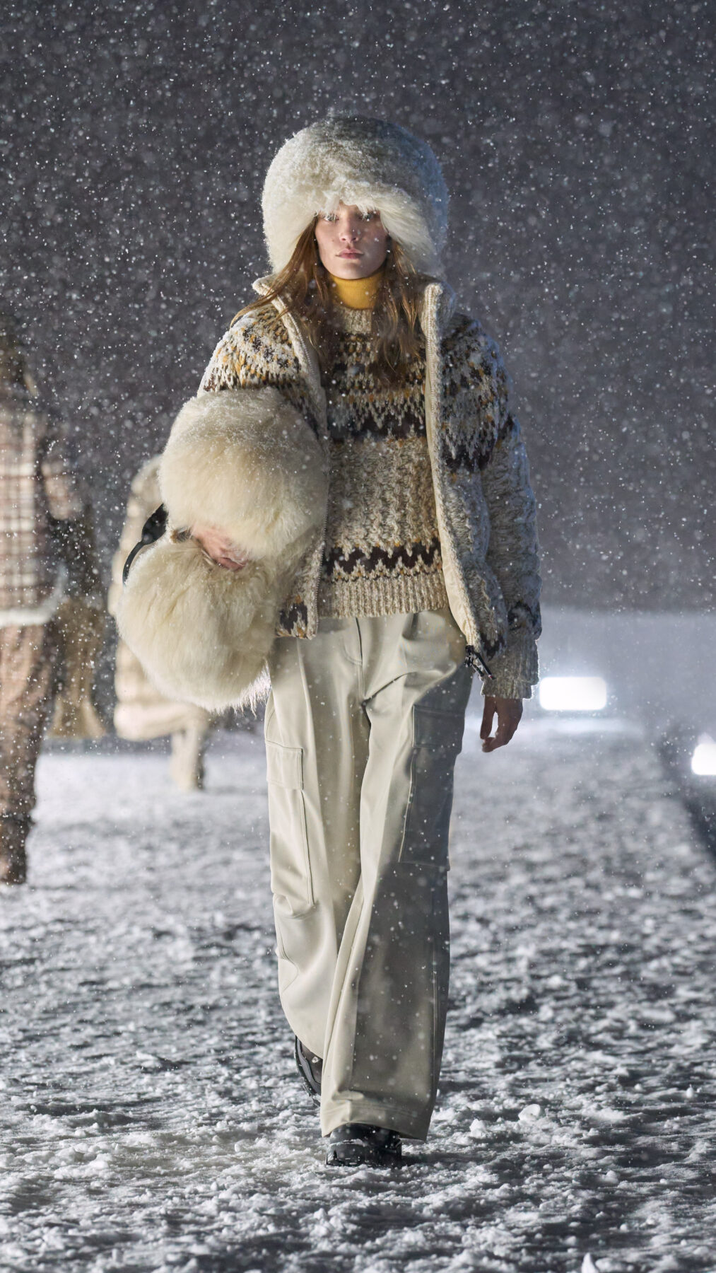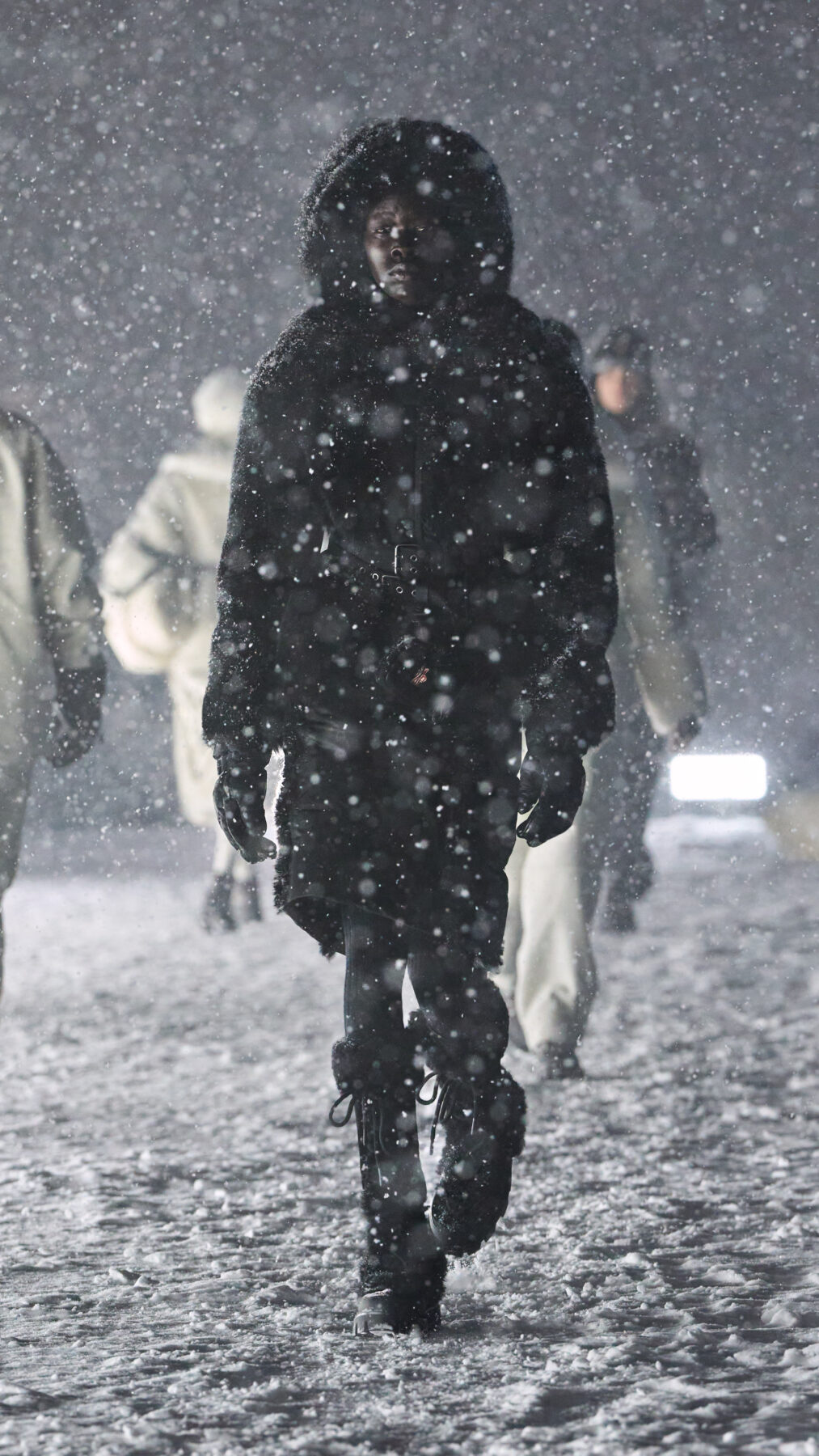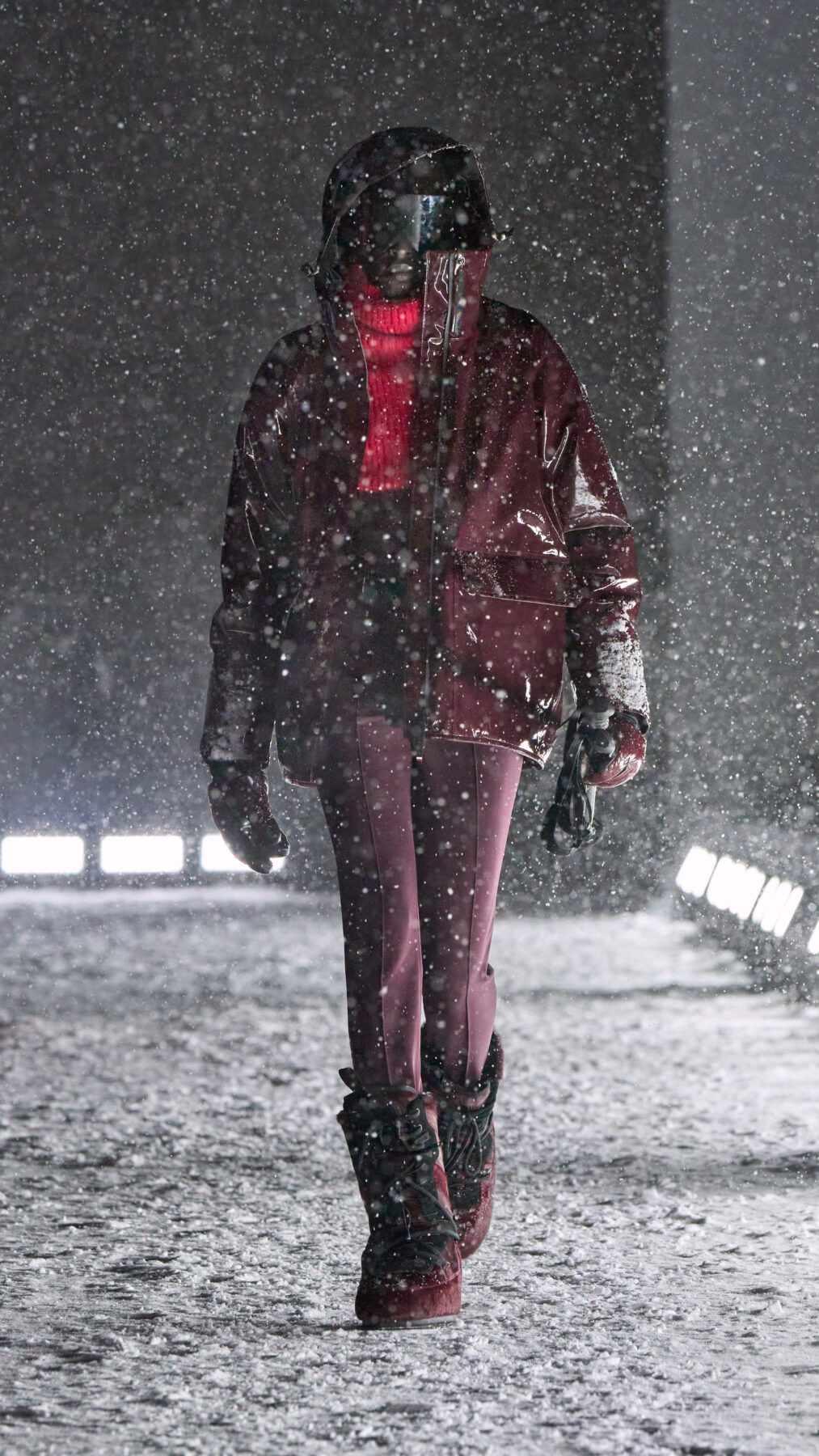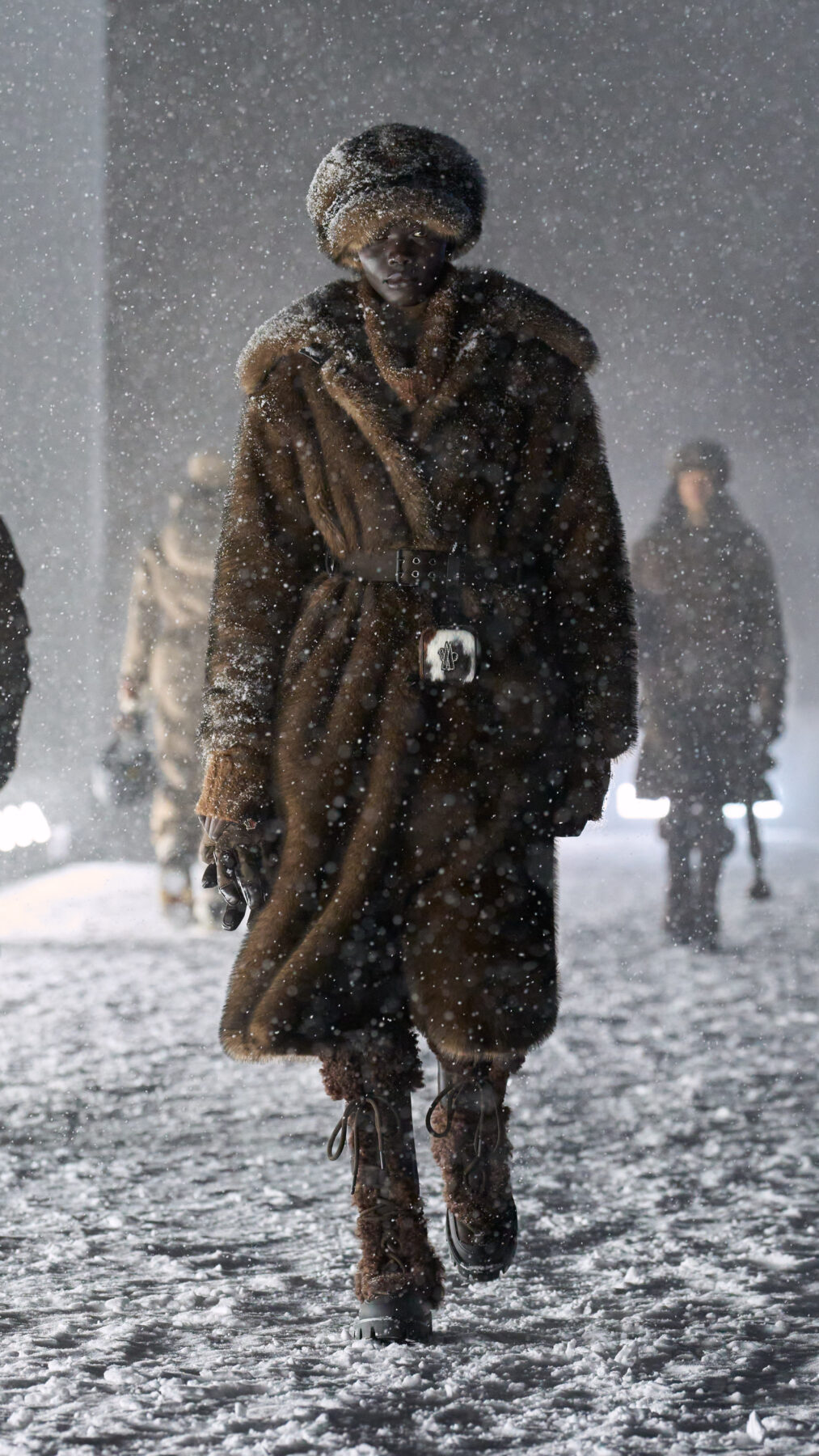 傍晚時分,不出所料雪愈下愈大,集合時間比預定推遲稍許,然後我們終於到達時裝展場地——高雪維爾機場,作為歐洲海拔最高(2,008米)的機場,四周被雪嶺環抱。Moncler Grenoble 2025 秋冬系列時裝展便是在這個偌大而不凡的露天場地上演。我們安坐在U型跑道兩旁,夜幕低垂,一束束白光照亮跑道,形成一個飄渺夢幻的圓拱形空間。按照品牌要求,全部嘉賓披上雪白的羽絨斗篷,巧妙呼應潔白無瑕的連綿雪嶺。白雪覆蓋的冬日夢幻雪景中,伴隨着由現場交響樂團演奏、宛如星河的優雅旋律,彼時樂章與大雪相互交織。這絕非一般的時裝展,卻是一個令人畢生難忘的夜晚。