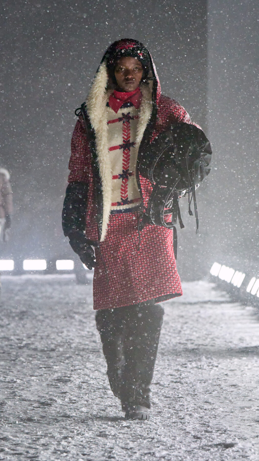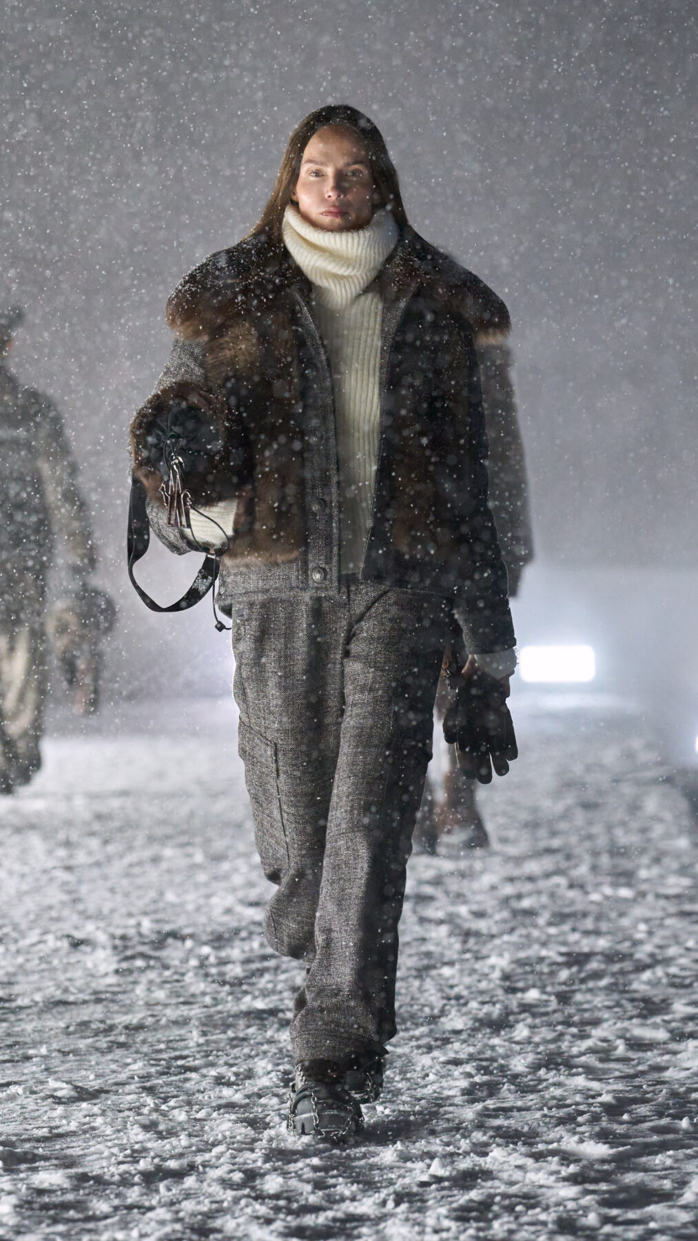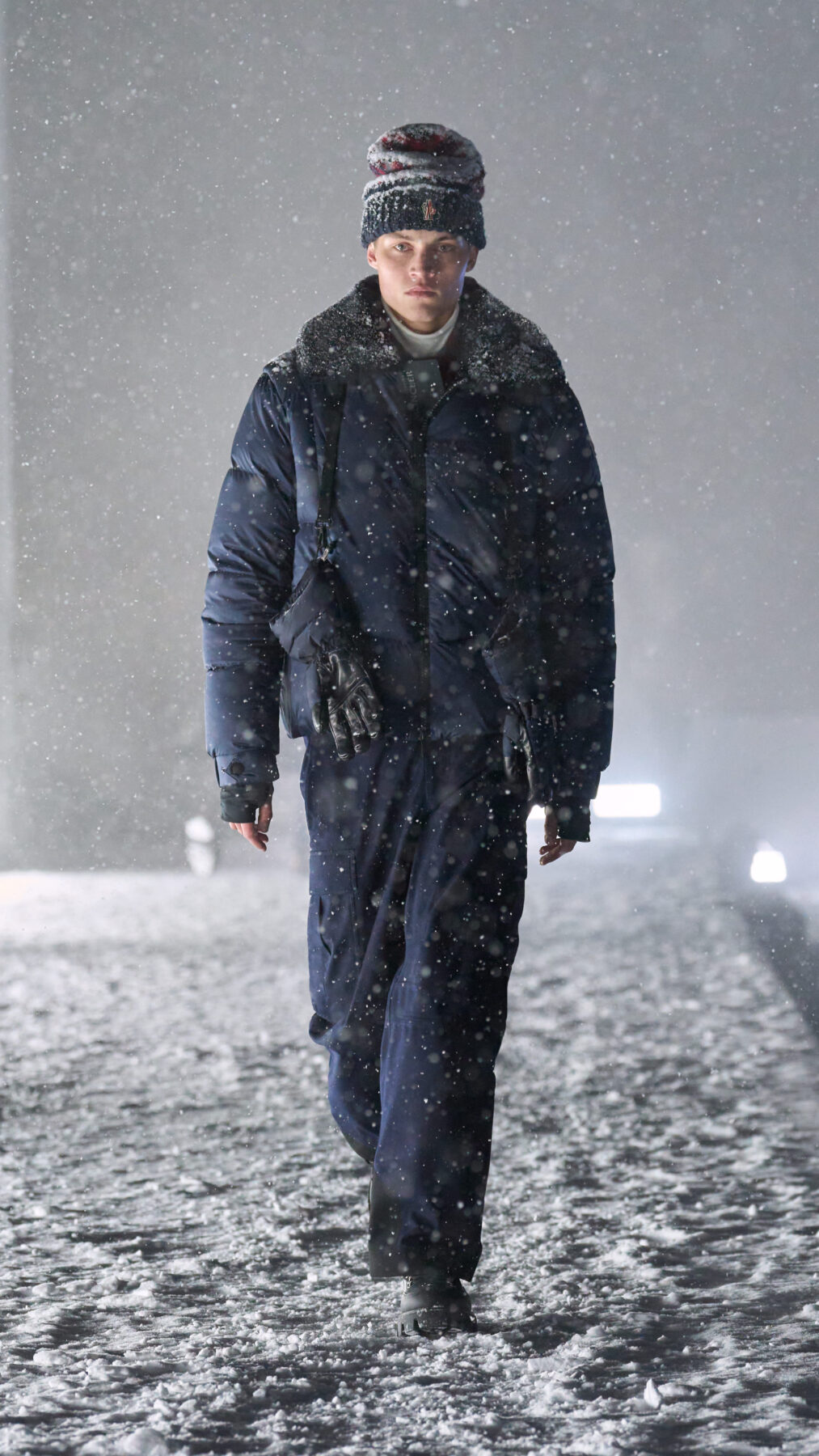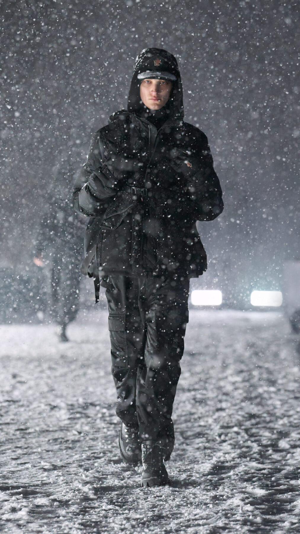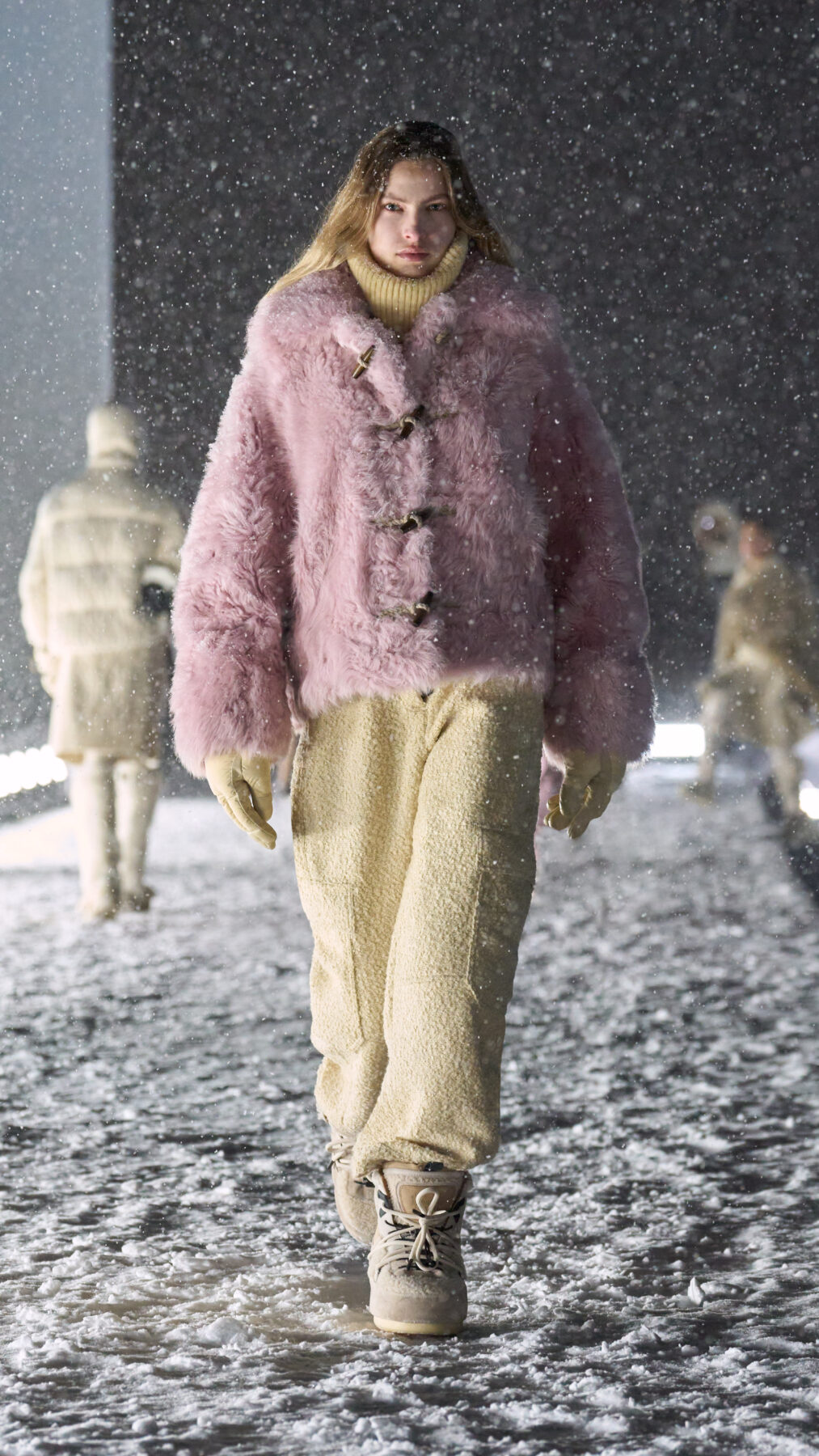 傍晚時分,不出所料雪愈下愈大,集合時間比預定推遲稍許,然後我們終於到達時裝展場地——高雪維爾機場,作為歐洲海拔最高(2,008米)的機場,四周被雪嶺環抱。Moncler Grenoble 2025 秋冬系列時裝展便是在這個偌大而不凡的露天場地上演。我們安坐在U型跑道兩旁,夜幕低垂,一束束白光照亮跑道,形成一個飄渺夢幻的圓拱形空間。按照品牌要求,全部嘉賓披上雪白的羽絨斗篷,巧妙呼應潔白無瑕的連綿雪嶺。白雪覆蓋的冬日夢幻雪景中,伴隨着由現場交響樂團演奏、宛如星河的優雅旋律,彼時樂章與大雪相互交織。這絕非一般的時裝展,卻是一個令人畢生難忘的夜晚。