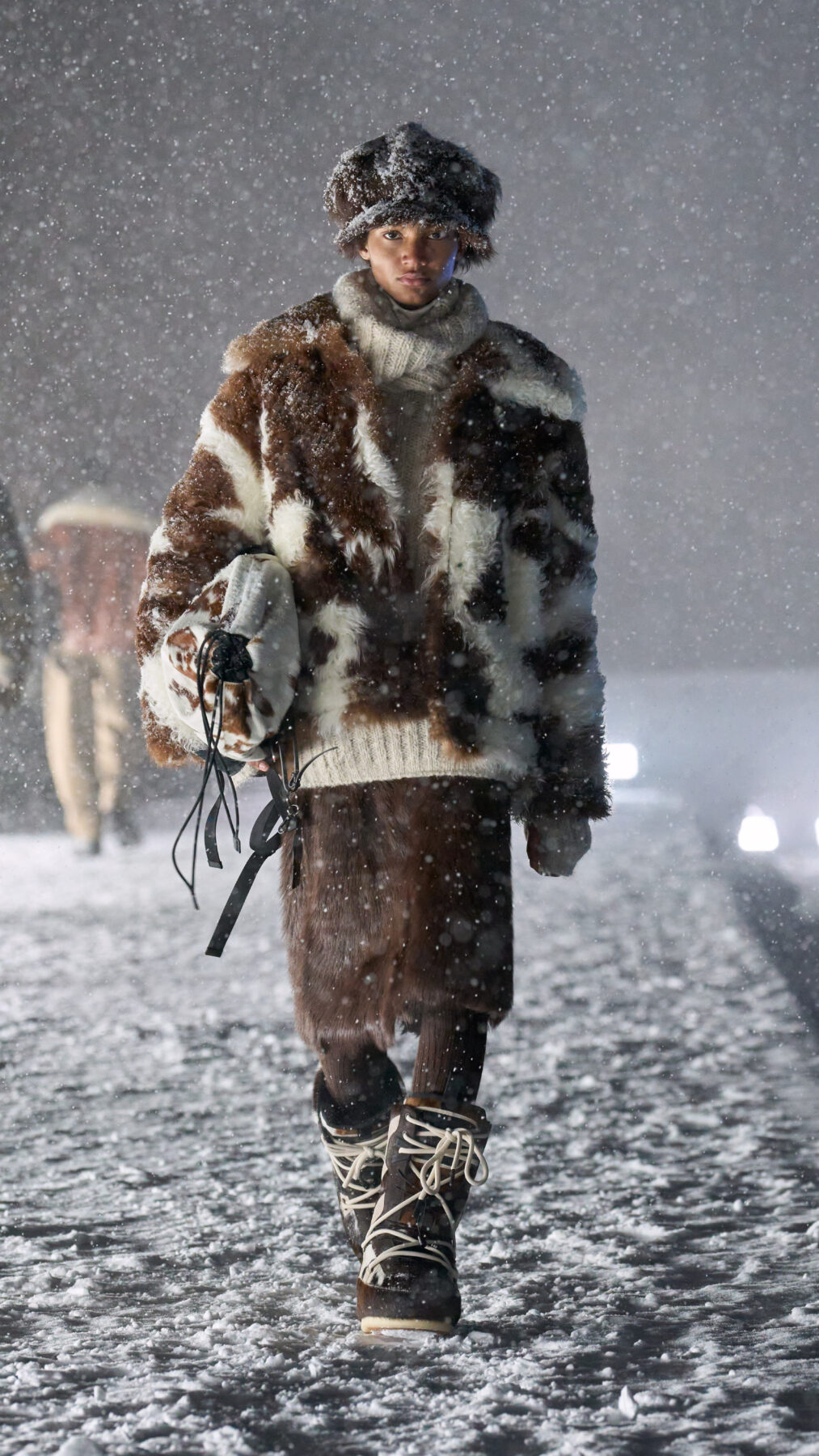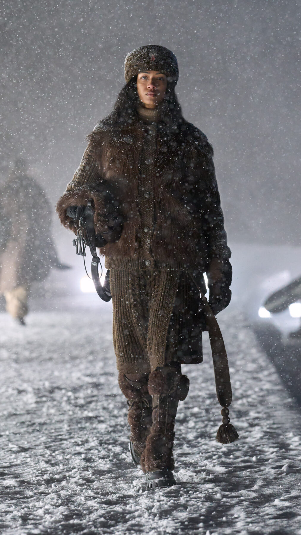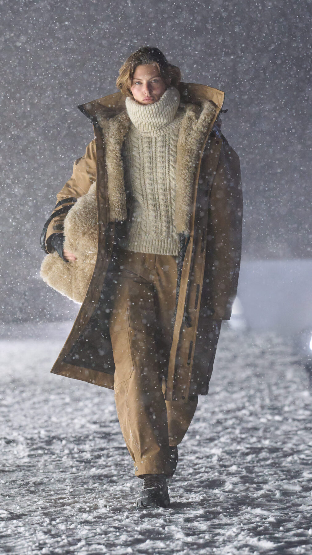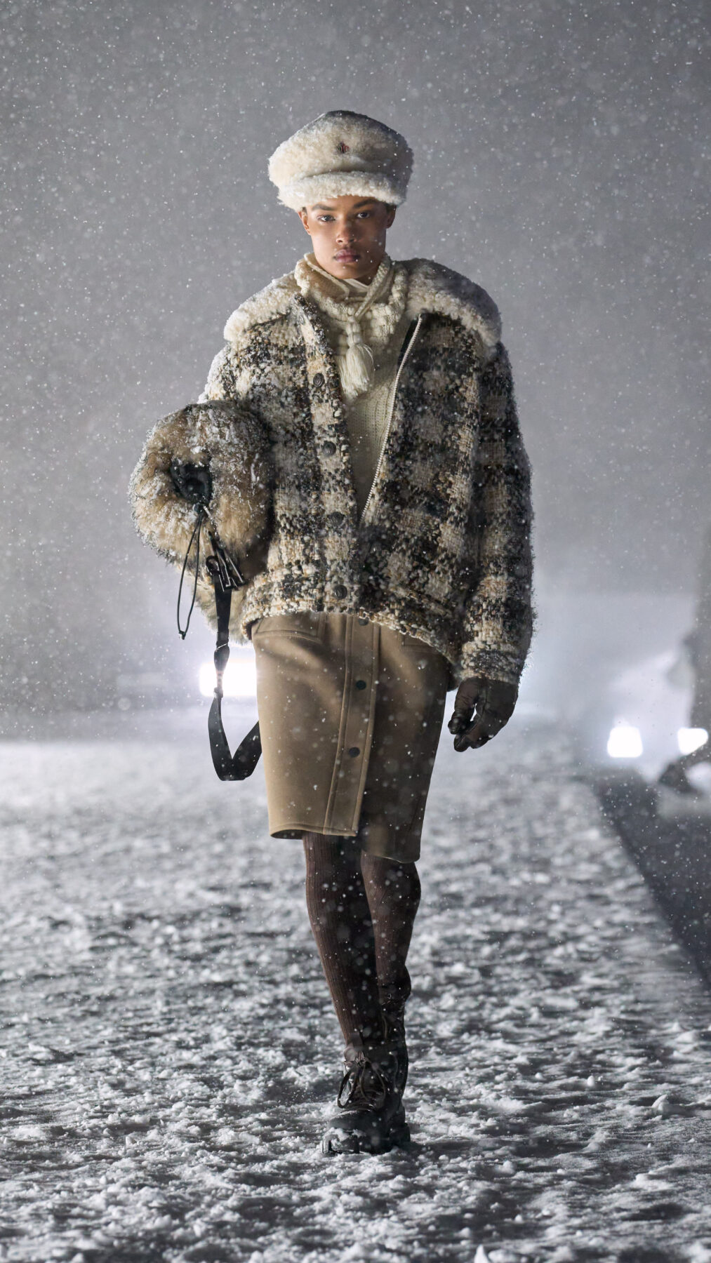 傍晚時分,不出所料雪愈下愈大,集合時間比預定推遲稍許,然後我們終於到達時裝展場地——高雪維爾機場,作為歐洲海拔最高(2,008米)的機場,四周被雪嶺環抱。Moncler Grenoble 2025 秋冬系列時裝展便是在這個偌大而不凡的露天場地上演。我們安坐在U型跑道兩旁,夜幕低垂,一束束白光照亮跑道,形成一個飄渺夢幻的圓拱形空間。按照品牌要求,全部嘉賓披上雪白的羽絨斗篷,巧妙呼應潔白無瑕的連綿雪嶺。白雪覆蓋的冬日夢幻雪景中,伴隨着由現場交響樂團演奏、宛如星河的優雅旋律,彼時樂章與大雪相互交織。這絕非一般的時裝展,卻是一個令人畢生難忘的夜晚。