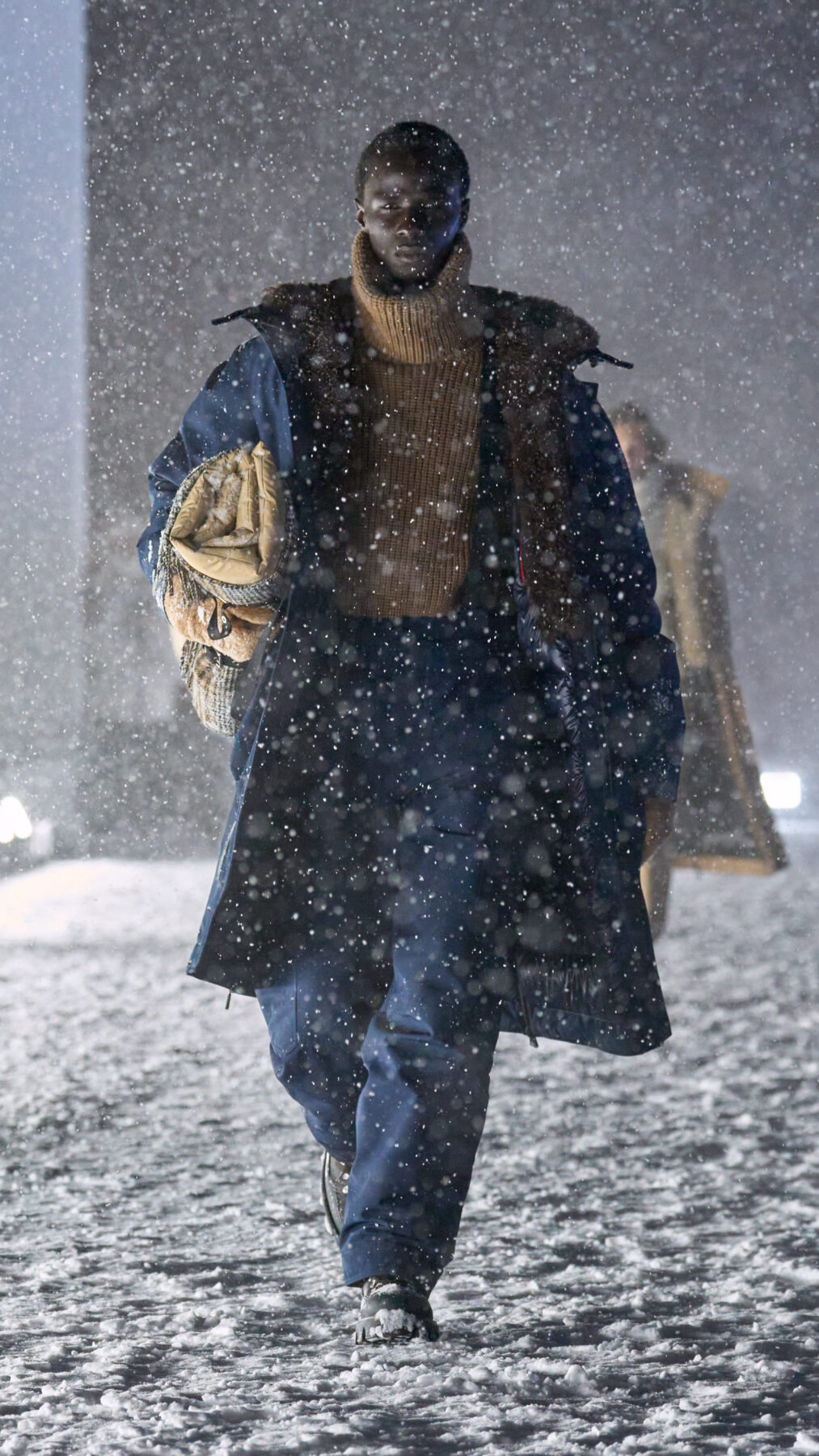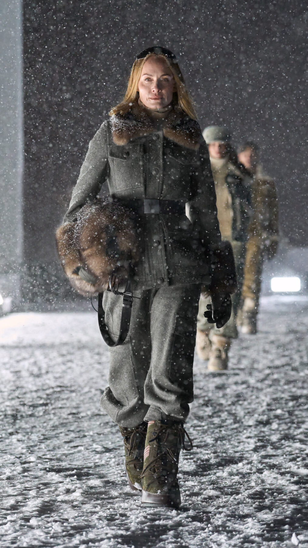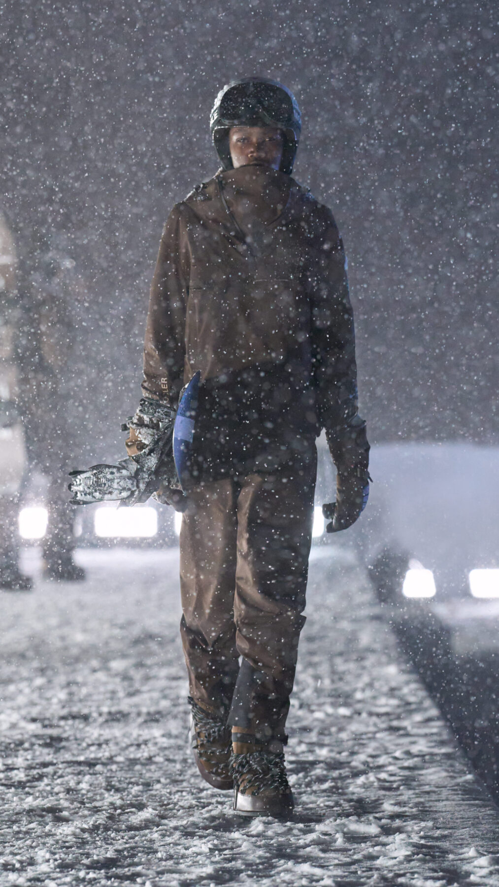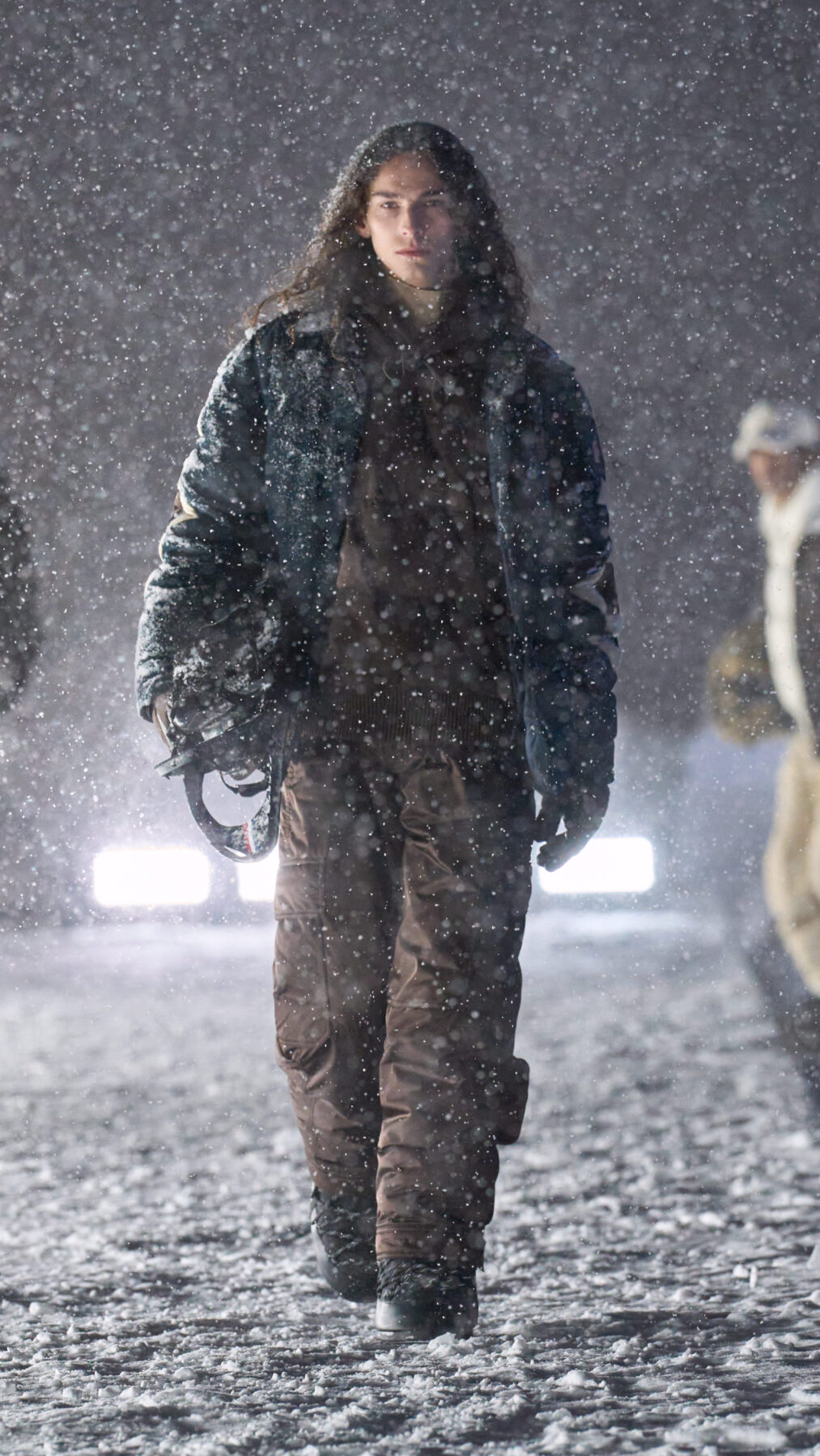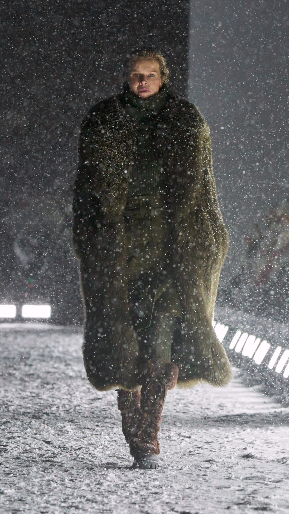 傍晚時分,不出所料雪愈下愈大,集合時間比預定推遲稍許,然後我們終於到達時裝展場地——高雪維爾機場,作為歐洲海拔最高(2,008米)的機場,四周被雪嶺環抱。Moncler Grenoble 2025 秋冬系列時裝展便是在這個偌大而不凡的露天場地上演。我們安坐在U型跑道兩旁,夜幕低垂,一束束白光照亮跑道,形成一個飄渺夢幻的圓拱形空間。按照品牌要求,全部嘉賓披上雪白的羽絨斗篷,巧妙呼應潔白無瑕的連綿雪嶺。白雪覆蓋的冬日夢幻雪景中,伴隨着由現場交響樂團演奏、宛如星河的優雅旋律,彼時樂章與大雪相互交織。這絕非一般的時裝展,卻是一個令人畢生難忘的夜晚。
