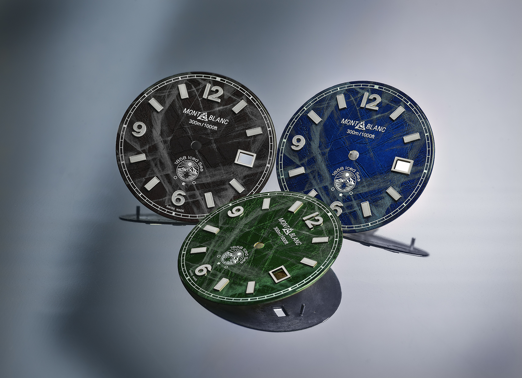 對品牌而言,冰川另一吸引之處,就是可反映出從大自然中所顯生的顏色,而設計師巧妙地為系列所設計出三種不同顏色的錶盤 —— 藍色、綠色和黑色,呼應著冰川不同顏色及形態:藍色代表白朗峰的冰海中所看到冰、綠色則代表著在南極洲大量繁殖的雪藻,還有因光線無法吸收和折射及因火山灰沉積而形成的黑色,以顏色歌頌萬物的神奇。