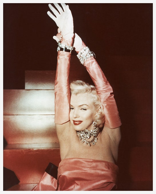 珠寶:這一串串鑽石在她的無肩帶禮服的粉紅色綢緞的襯托下,在她調皮的「鑽石是女孩最好的朋友 」的調皮中閃閃發光。