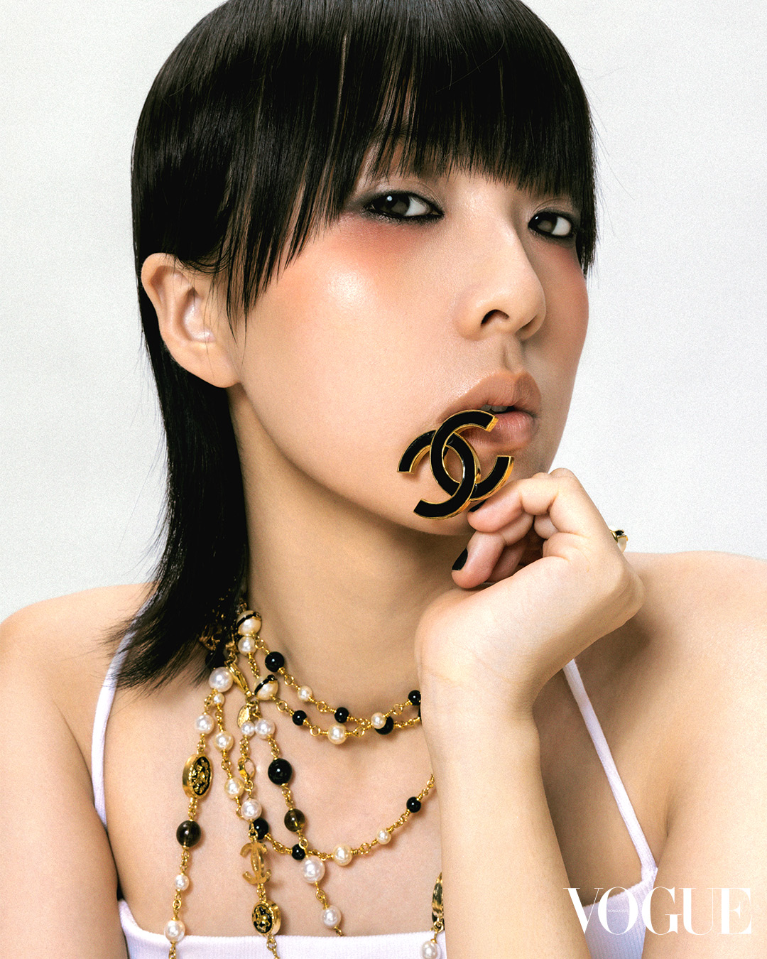 Jumpsuit, earrings, necklaces and slippers, all Chanel.