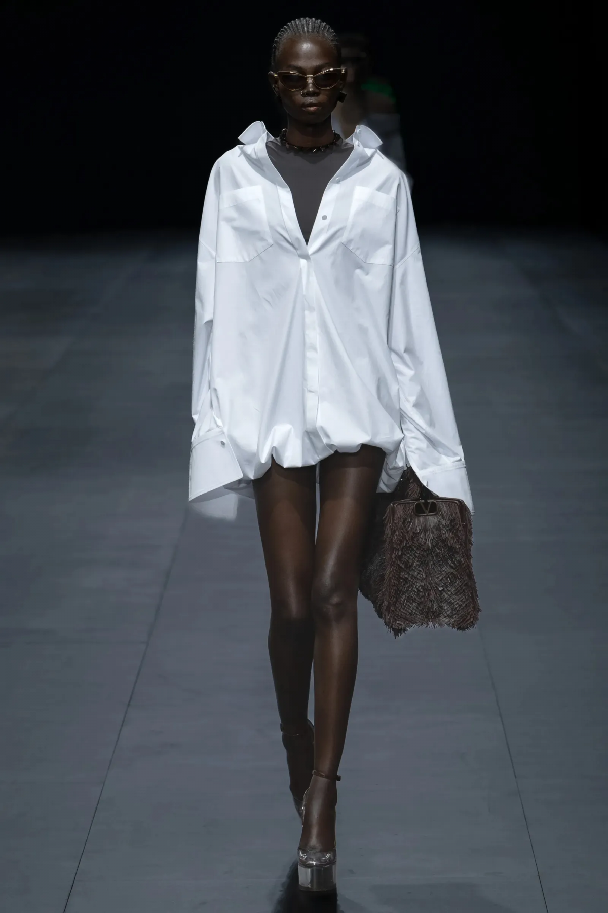 在2023年春夏時裝展 Valentino 天橋上,一切都與高度有關,模特們穿著類似於Lady Gaga鍾愛的「脫衣舞孃高跟鞋」。 Pierpaolo Piccioli在他過去幾季的堆疊式Tan-Gos的成功基礎上,推出了透明鞋和瘦腳踝帶的厚平台,搭配簡潔的迷你裙和水晶點綴的外套,整體都出乎意料地吸引人。