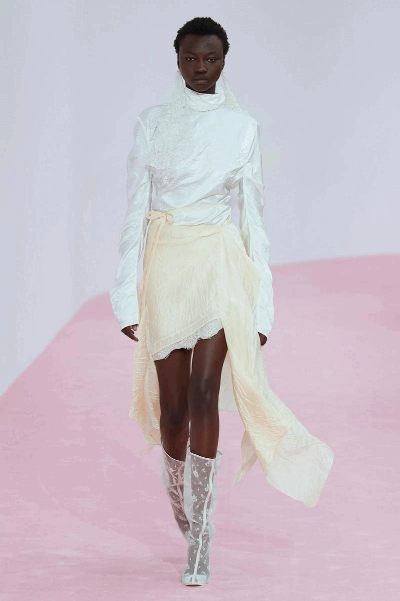同時,Acne Studios和Bottega Veneta的靴子以半透明的網眼製成,以維護你雙腳的尊嚴。特別是Bottega Veneta 的鞋面上有明顯的接縫,這一點在身著透明點綴設計裙子的模特兒,充分地展示出其可穿性的功能。