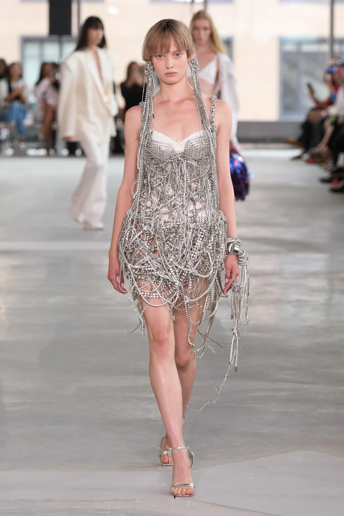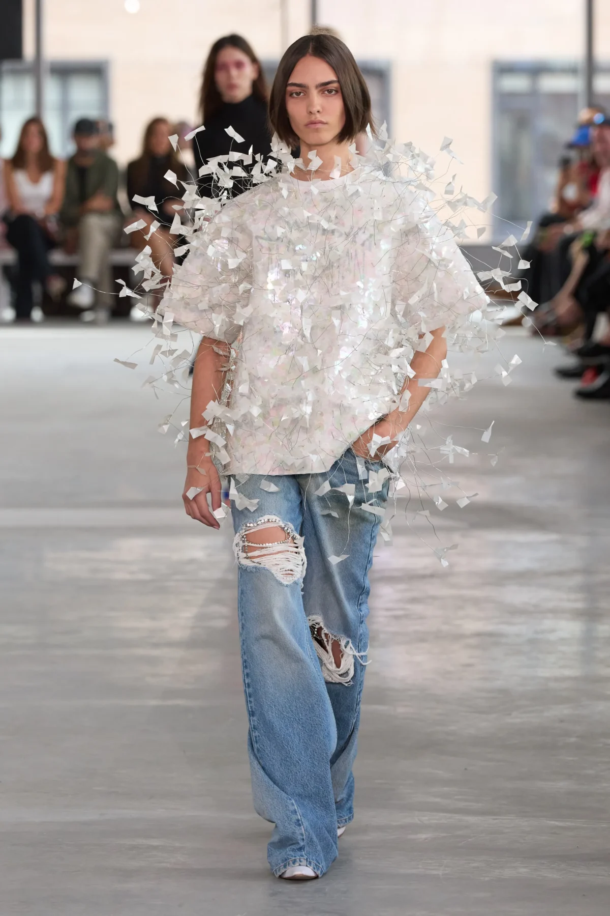 「樂趣」始終是 Area 品牌體驗的核心。Aburn 執掌的 2026 春夏系列延續其一貫特色:丹寧、水晶、亮片等裝飾元素——這些驚艷單品並非迎合單純喜歡禮服的族群,而是為渴望在紅地毯留下 Statement 的人而生。同時,系列也包含剪裁精良的服裝(Aburn 形容這是在米蘭工作的優勢)、復古 T-Shirt 等,以及美式運動服,完美把創辦人 Piotrek Panszczyk 概念性設計與 Aburn 的現實主義理念互相結合。