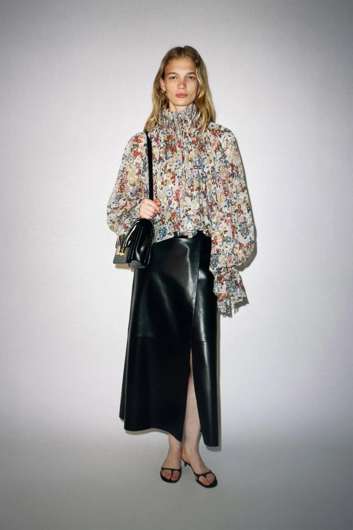 PARIS, FRANCE - MARCH 07: Francesca Ragazzi wears black leather jacket, black scarf, yellow floral print pleated maxi skirt, black sunglasses, outside Givenchy, during the Womenswear Fall/Winter 2025/2026 as part of Paris Fashion Week on March 07, 2025 in Paris, France. (Photo by Claudio Lavenia/Getty Images)