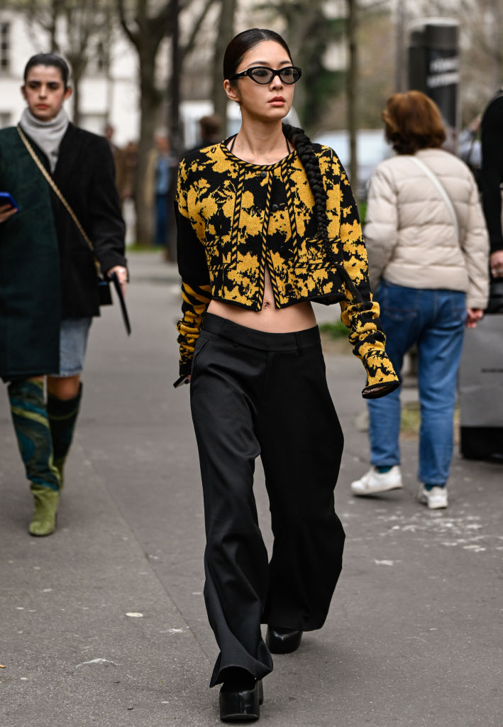 PARIS, FRANCE - MARCH 09: A guest is seen wearing a yellow and black cropped top, black pants, black boots and black sunglasses outside the Ottolinger show during the Womenswear Fall/Winter 2025/2026 as part of Paris Fashion Week on March 09, 2025 in Paris, France. (Photo by Daniel Zuchnik/Getty Images)