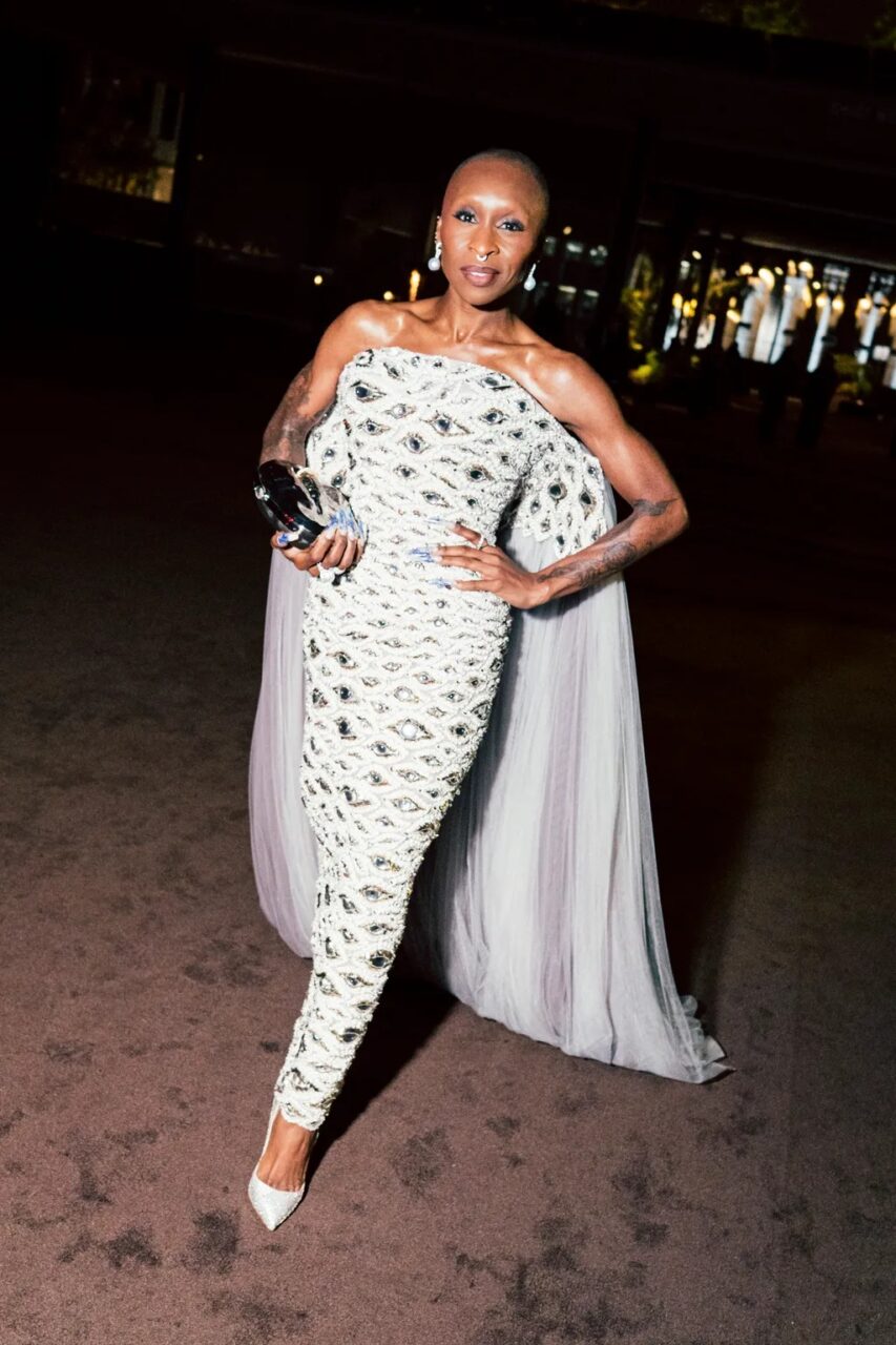 Angela Bassett為此次盛會選擇了一件鮮豔的香檳金流蘇禮服。「我穿著這件裙子非常開心,」Angela Bassett在搖曳時說道,這是她的Gucci禮服。「我喜歡它——它本身就是一件藝術品。」Angela Bassett分享道,1975年Diana Ross主演的電影《薄霧》(Mahogany)總是她在紅地毯準備時的時尚靈感。「我記得Diana穿著最華麗的造型,反映了她角色從時裝學生到世界知名設計師的旅程,我想要像她一樣打扮。她有一件單肩紫色裙子,搭配毛皮手套和頭巾,簡直美得不可思議。」