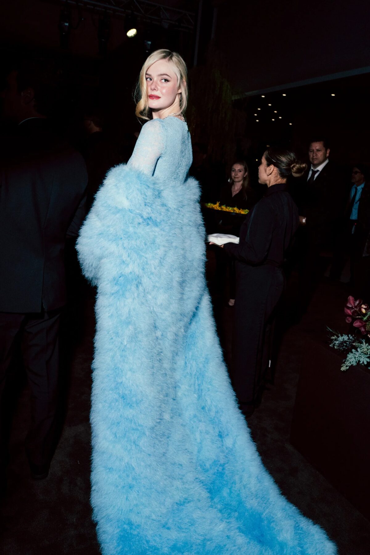 在中心的餐桌上,Cindy Crawford與Demna的繆思Demi Moore進行了長時間的交談,Demi Moore身穿一件華麗的珠寶禮服,高領設計更添皇室氣派。與此同時,Kaia Gerber離開了她的座位,與朋友和時裝展的常客模特Paloma Elsesser和Alex Consani重聚。她蹲下來,把手臂放在桌子上,進行了一場生動的聊天,並為自拍擺姿勢。在附近,Elle Fanning身穿淺藍色喱士長袖和披在手臂上的毛絨外套,與Demna交談。「這是一個我不常穿的美麗顏色,我喜歡它,」Elle Fanning在晚上早些時候告訴《VOGUE》。「我試穿時,它就像手套一樣合身。」