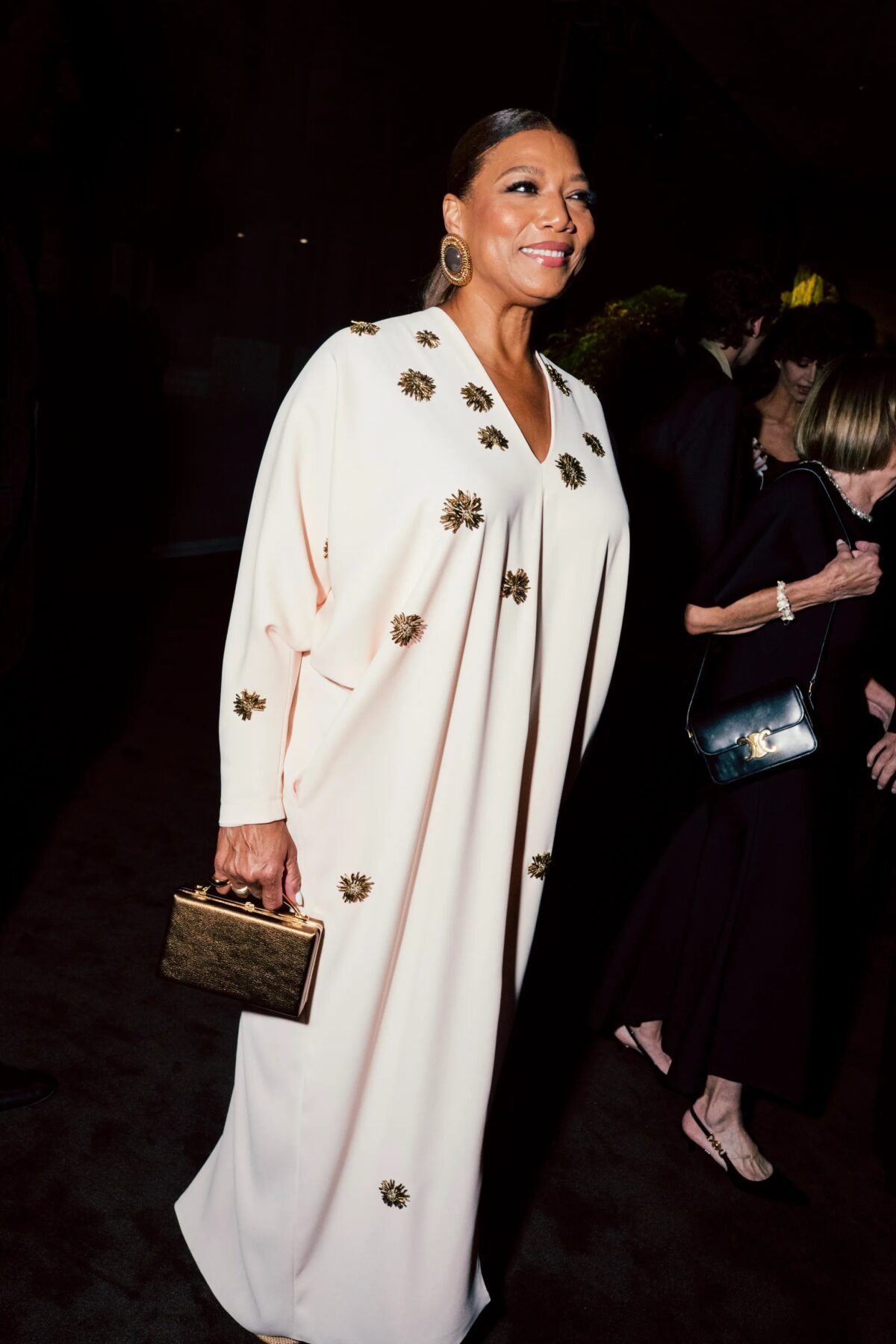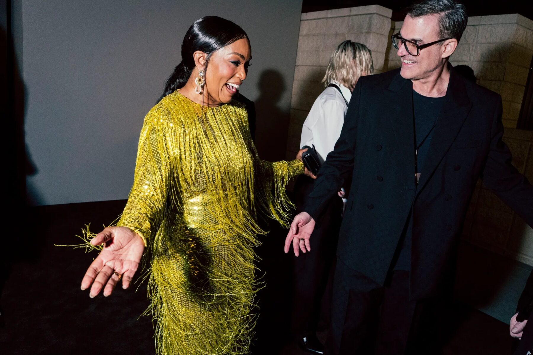 Angela Bassett為此次盛會選擇了一件鮮豔的香檳金流蘇禮服。「我穿著這件裙子非常開心,」Angela Bassett在搖曳時說道,這是她的Gucci禮服。「我喜歡它——它本身就是一件藝術品。」Angela Bassett分享道,1975年Diana Ross主演的電影《薄霧》(Mahogany)總是她在紅地毯準備時的時尚靈感。「我記得Diana穿著最華麗的造型,反映了她角色從時裝學生到世界知名設計師的旅程,我想要像她一樣打扮。她有一件單肩紫色裙子,搭配毛皮手套和頭巾,簡直美得不可思議。」
