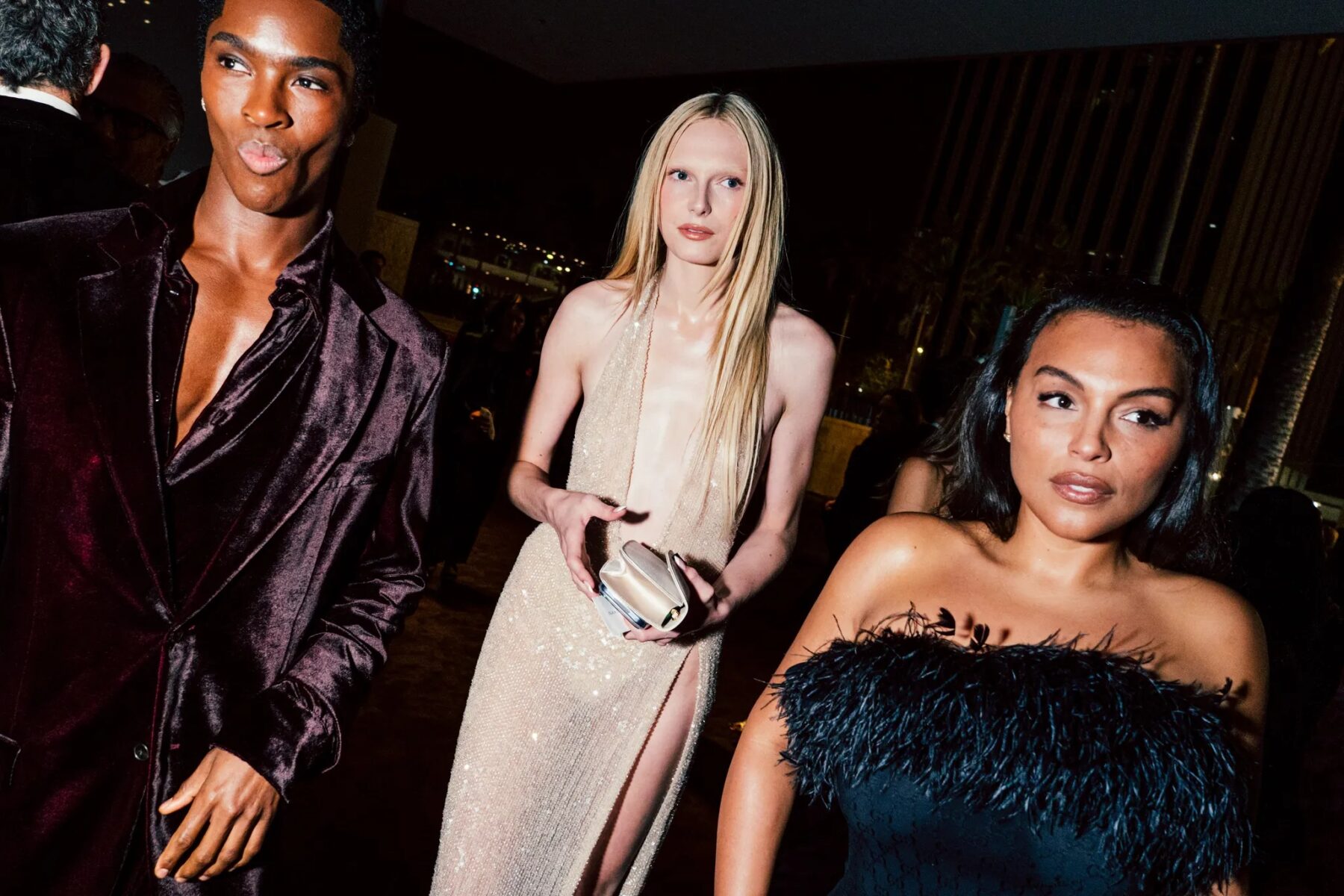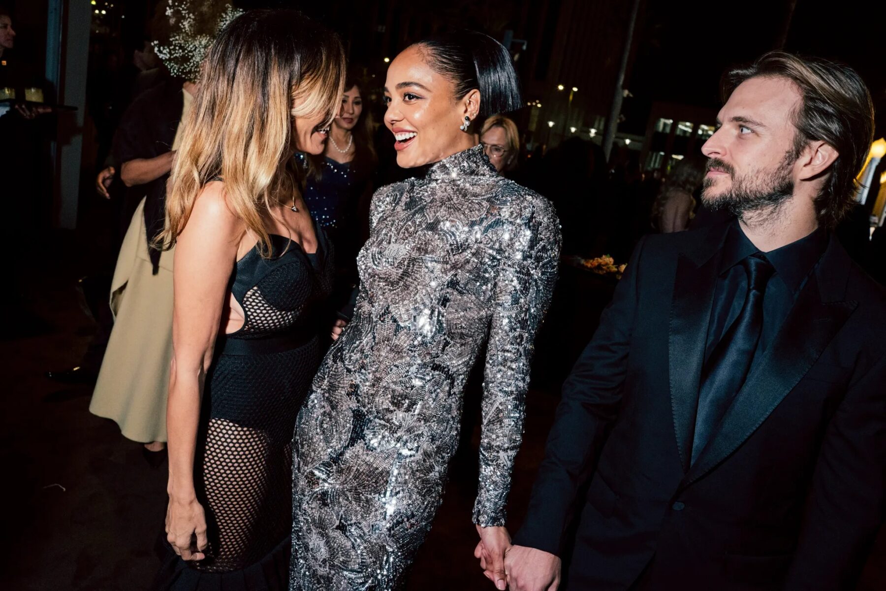 Salma Hayek Pinault被發現正在與穿著金屬禮服的Tessa Thompson交談,後者的背部開口深邃。「我覺得自己像是浸在液態銀中!它非常舒適,前面是商務風,後面是派對風呢,」她高興地說。Tessa Thompson出席是為了向Ryan Coogler致敬,他在《洛奇外傳:王者之後》(Creed)中與Michael B. Jordan同台演出。「他是一位非凡的電影製作人。他關心社區,想要擴展我們對黑人身份的可能性,」她讚美道。「他是最富有想像力的人,真的是一個堅實、可愛、關懷、富有同情心的人。」