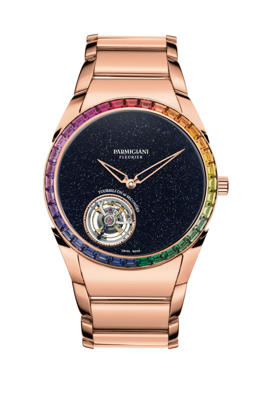 品牌於年前推出 Rainbow 概念七彩寶石的珠寶腕錶後,大受歡迎,更掀起了一股彩虹寶石錶熱潮,不少品牌紛紛推出彩虹錶演繹。難得的是,品牌並沒有因而自滿,在彩虹概念的基礎上再接再厲,繼續推出嶄新的演繹。像最新推出的這枚 Tonda 1950 Moonbow 超薄腕錶,光看名字你可能會感到陌生,原來 moonbow(月虹)是罕見的大氣景象,顧名思義,是在萬千閃爍的夜空中出現的一道彩虹。只見新錶以錶圈七彩寶石演繹月虹,以藍色、粉色、橙色及黃色藍寶石、紅寶石、沙弗萊石及紫水晶等共達40顆狹長形切割寶石環鑲錶圈,總重達2.59卡。而閃閃星系則以砂金石錶盤表現。個人一直非常喜歡砂金石的材質和美態,只需借助少許光線,便能映照臨摹出繁星滿天的浩瀚夜空,縱使方寸之間也能叫人神往,渾忘了錶盤上還有一個美麗絕倫的飛行陀飛輪。不得不提的是,此飛行陀飛輪機芯是挑戰超薄的傑作,刻意把鉑金微型擺陀集成於主夾板裏,打造出厚度僅為3.4毫米的機芯,更能襯托月虹飄逸的氣質。