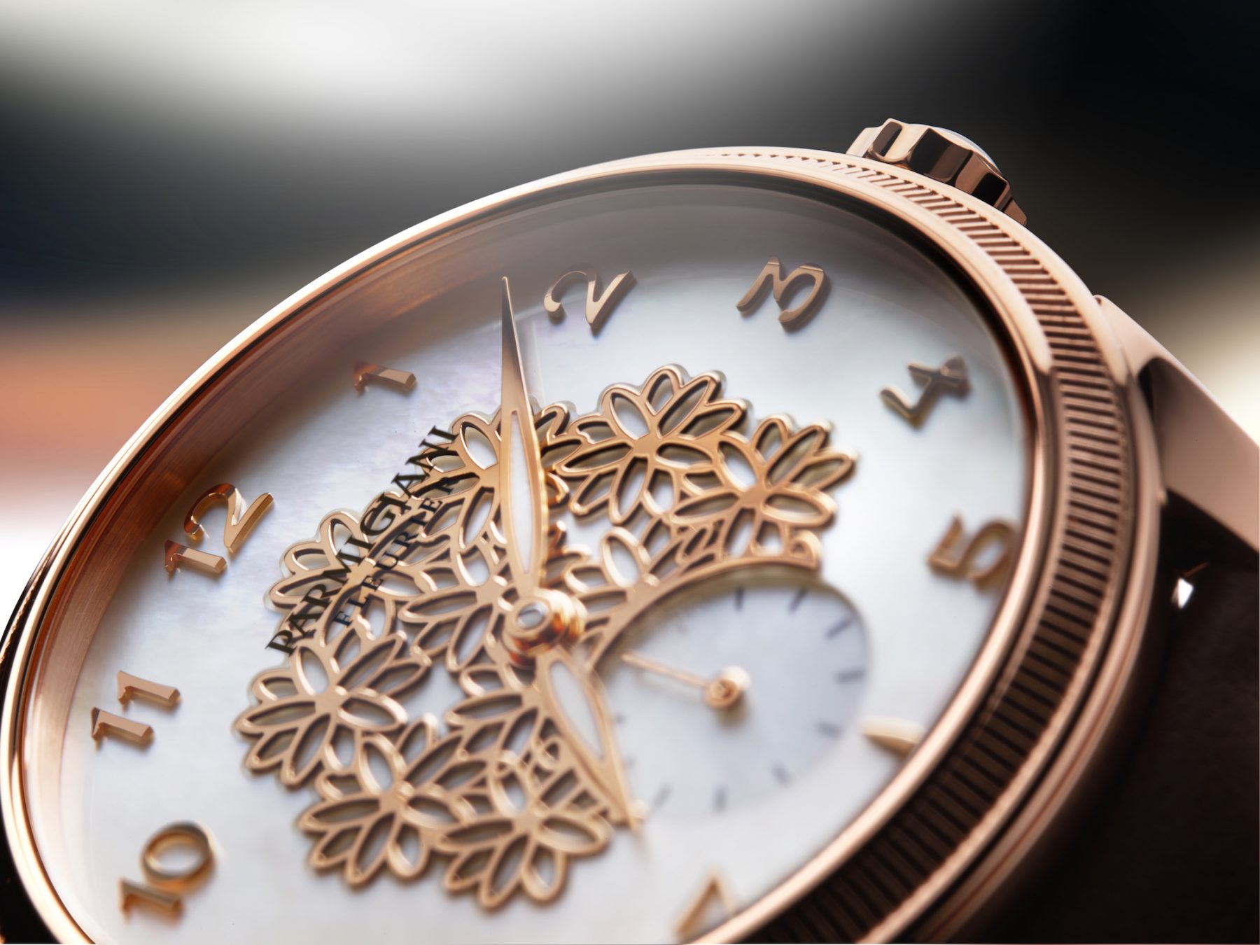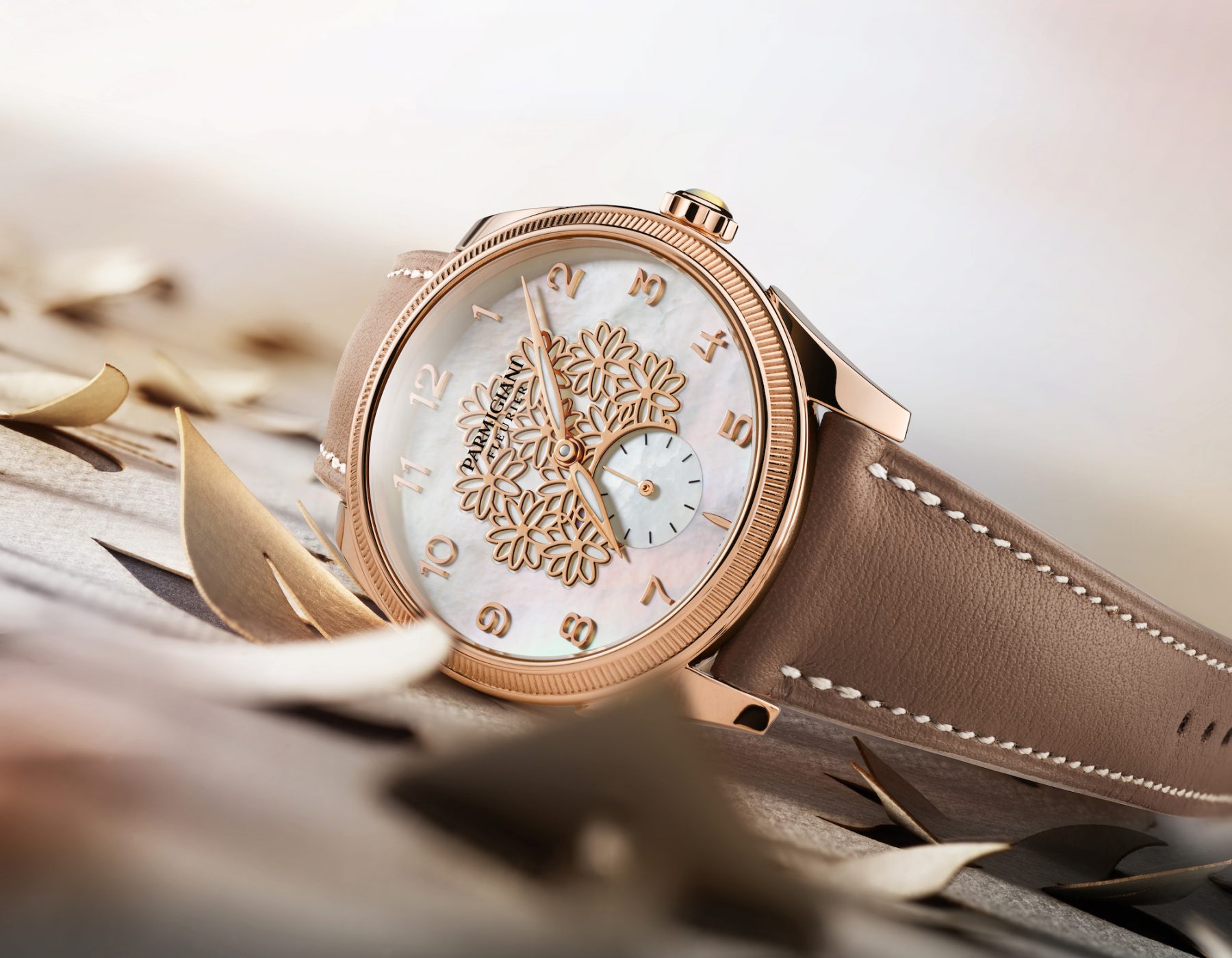 Michel Parmigiani 一直對日本文化充滿熱愛,作為創作人,其創作靈感很自然便會受到自己的喜好啟發,像最新推出的這枚 Toric Fleur 便是頌讚日本賞花傳統「花見」的習俗,其聚焦點便在錶盤上優美的雛菊圖案工藝。難得的是,在讚歎「花見」傳統之餘,Michel Parmigiani 卻是從自身瑞士汝拉山中點綴着旺盛生命力的雛菊所散發的淡雅氣質中吸取靈感,作為 Toric Fleur 的圖騰,俯伏在白色珍珠貝母錶盤上栩栩如生。以直徑33.7毫米玫瑰金錶殼搭載品牌自製 PF310 自動上鏈機芯,除了錶盤「花見」外,留意其錶圈以細膩滾花工藝裝飾,為 Toric 系列的標誌性特色,散發精盈細緻的美感。