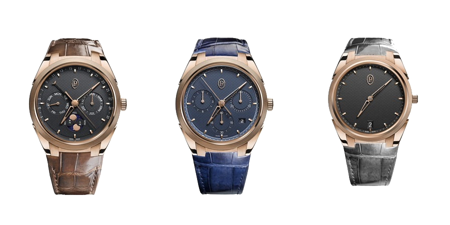 Tonda PF 銀沙灰精鋼腕錶 (左);Tonda PF 暖灰精鋼腕錶 (中);Tonda PF 寶石紅玫瑰金腕錶 (右)